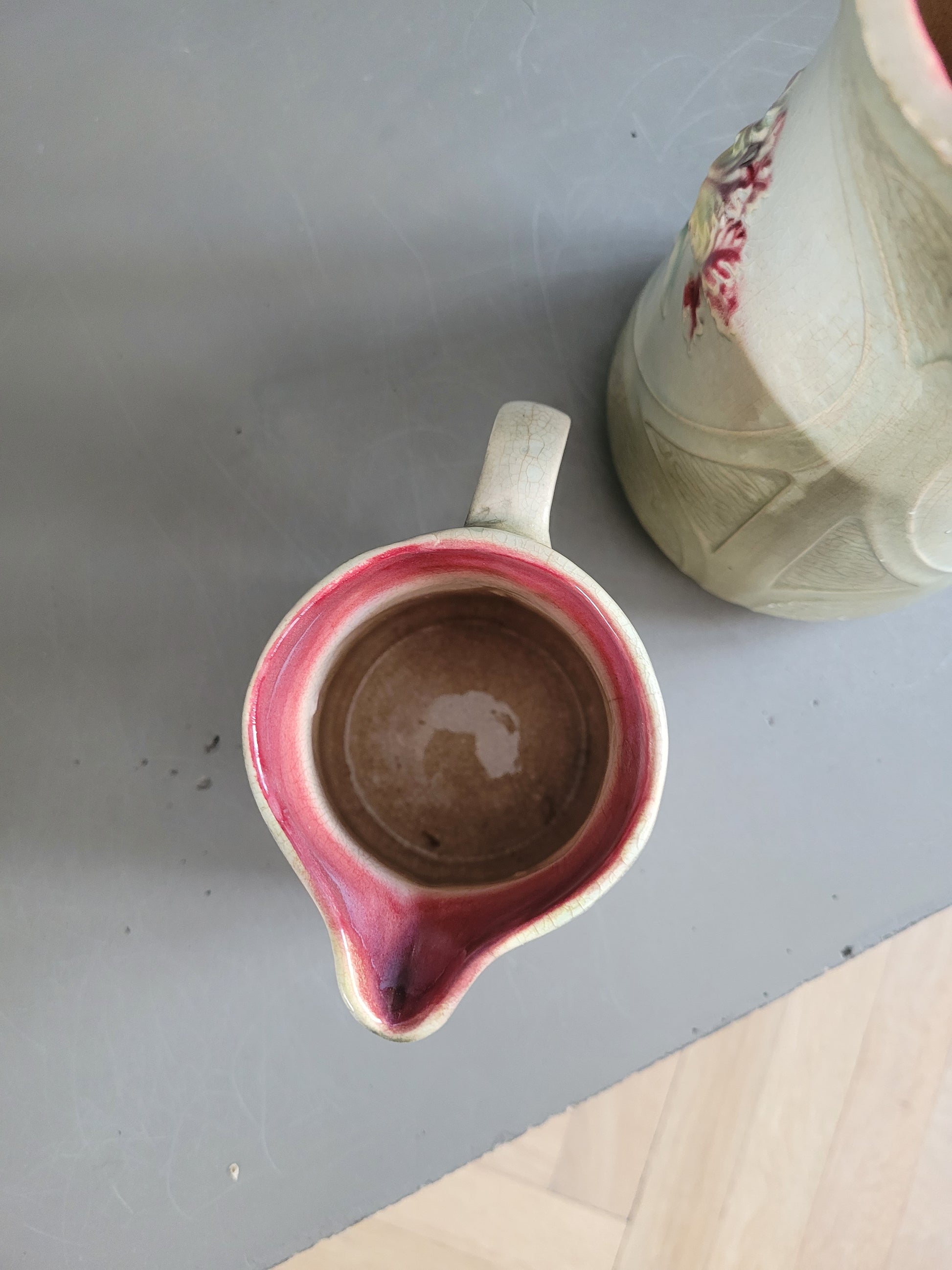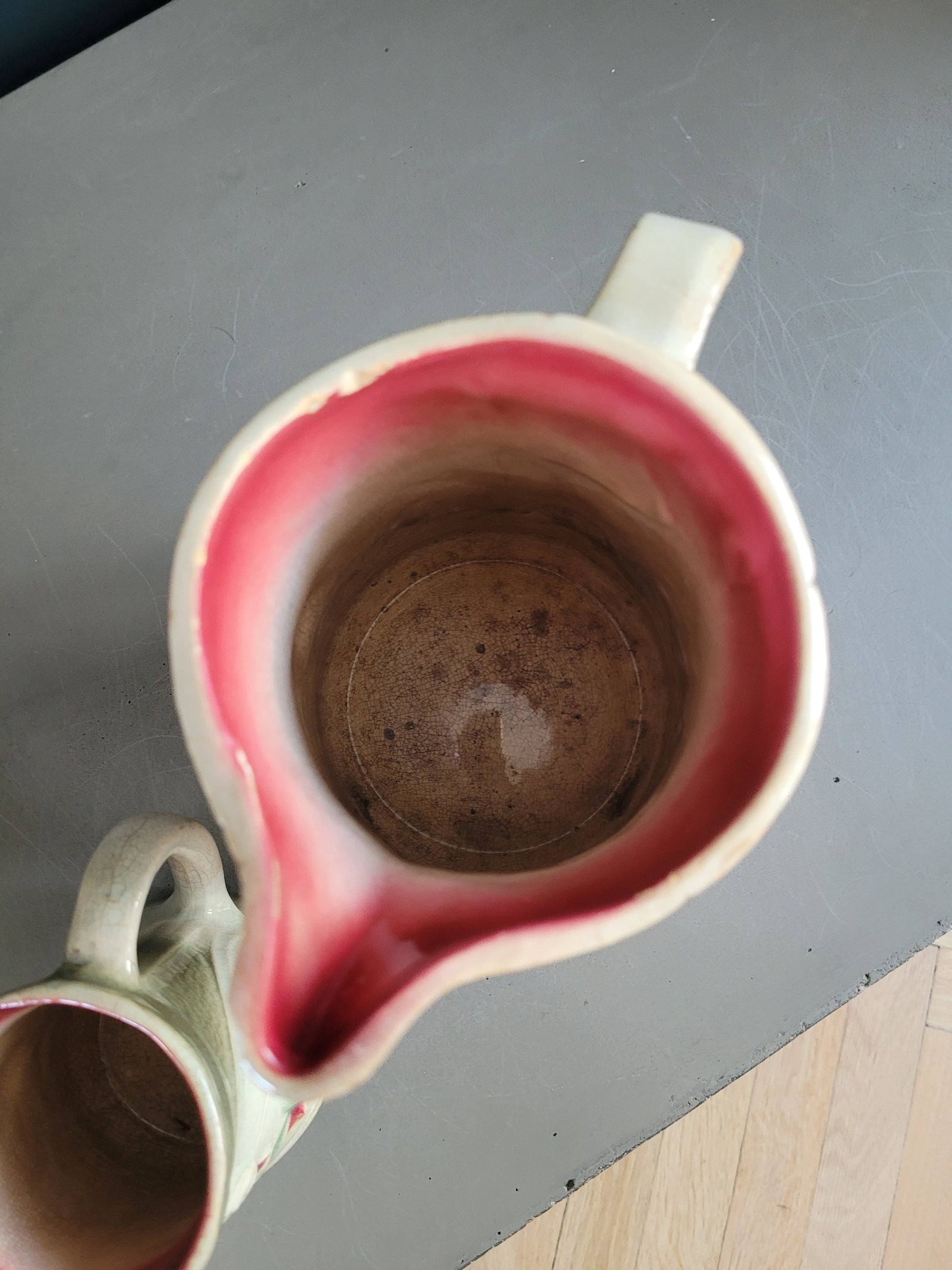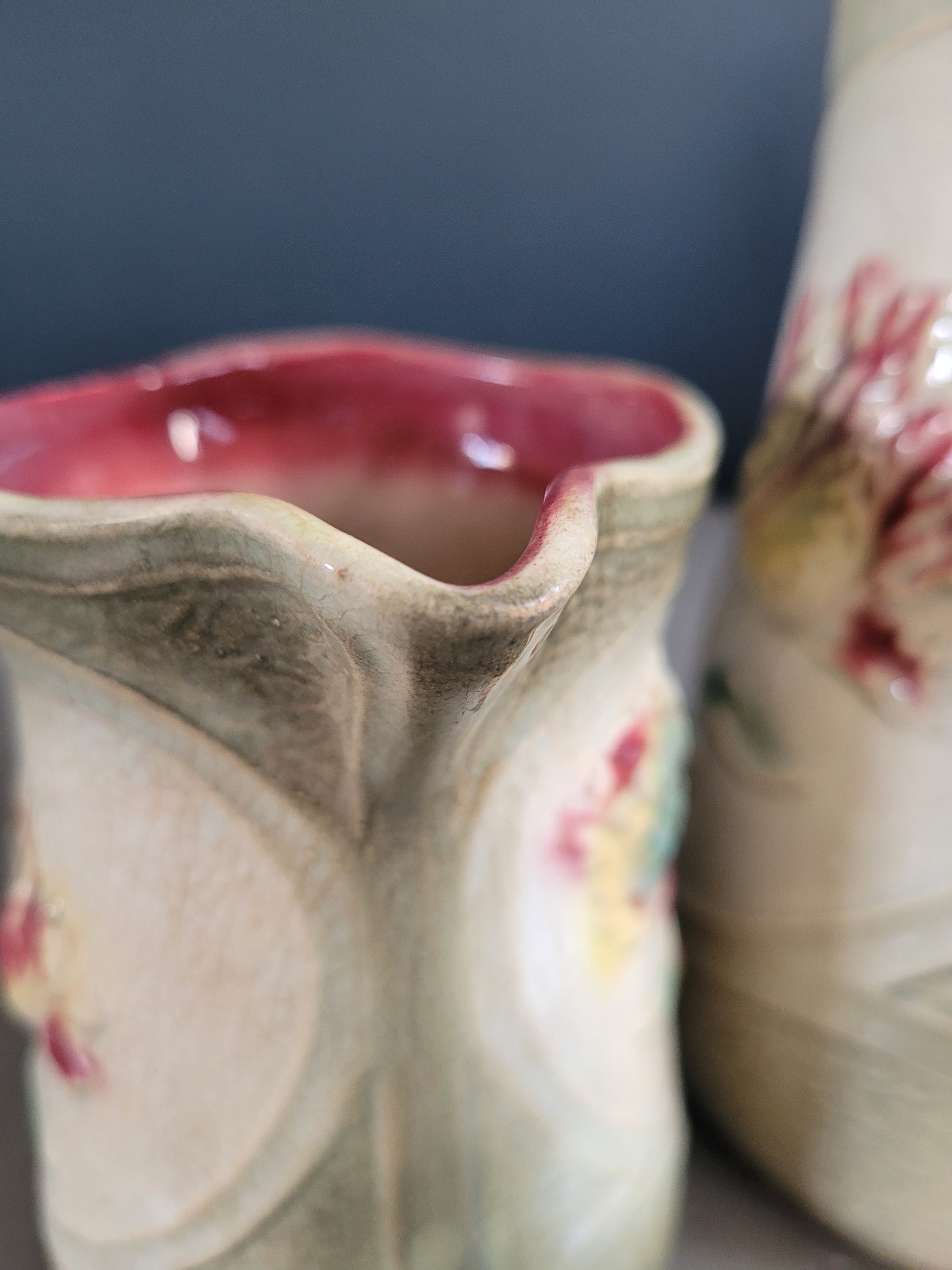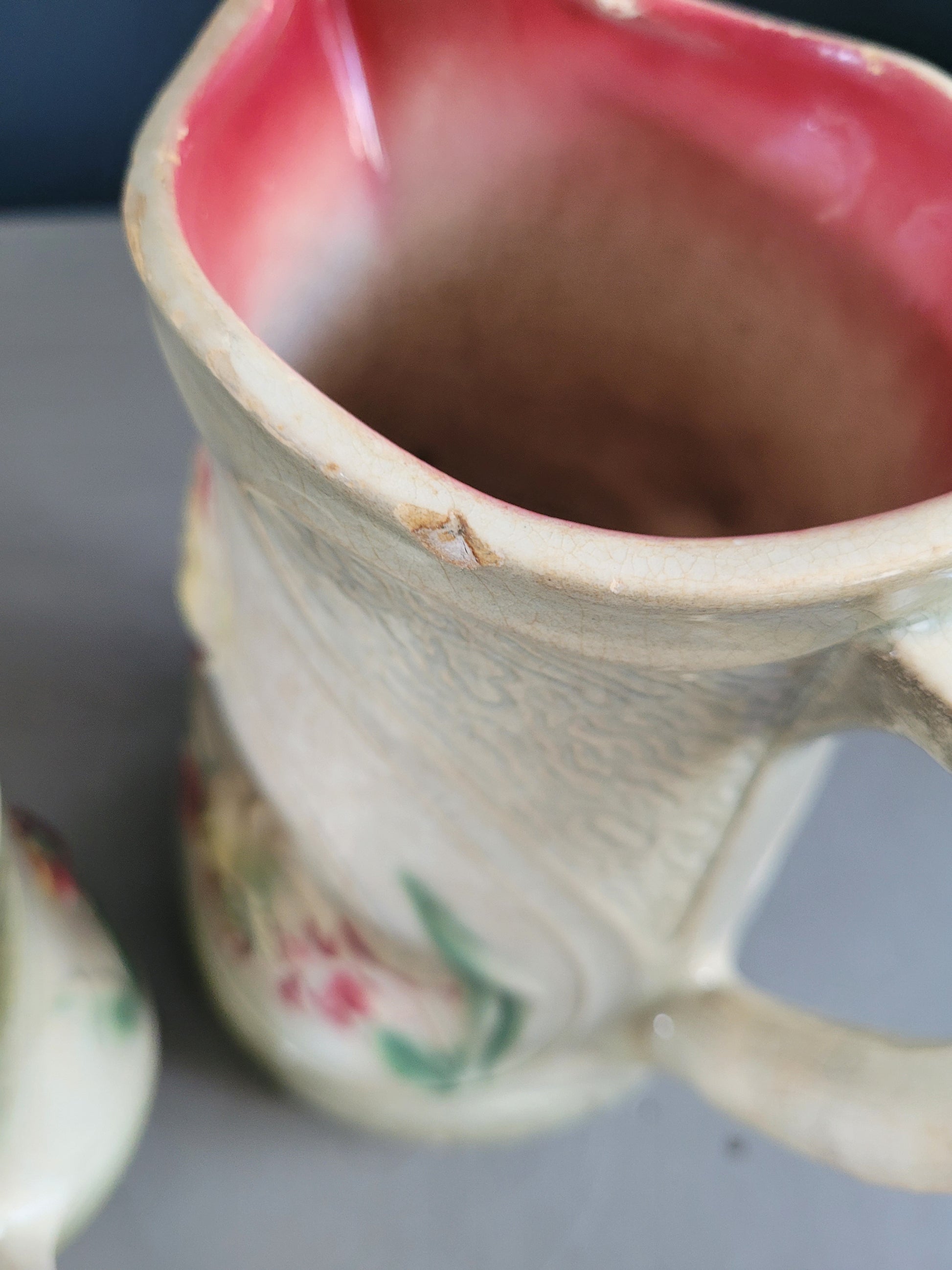 Magnifique paire de pichets anciens avec 2 motifs différents de tulipes en barbotine de part et d'autre, et ornés de décors sur toute la surface.