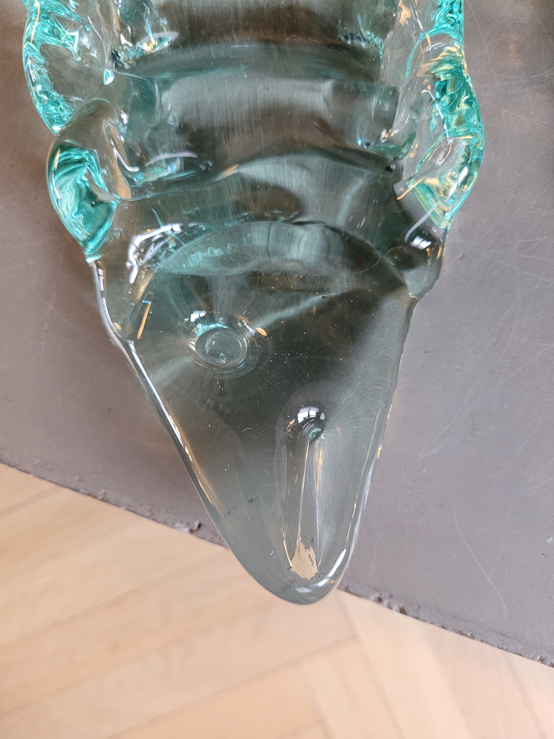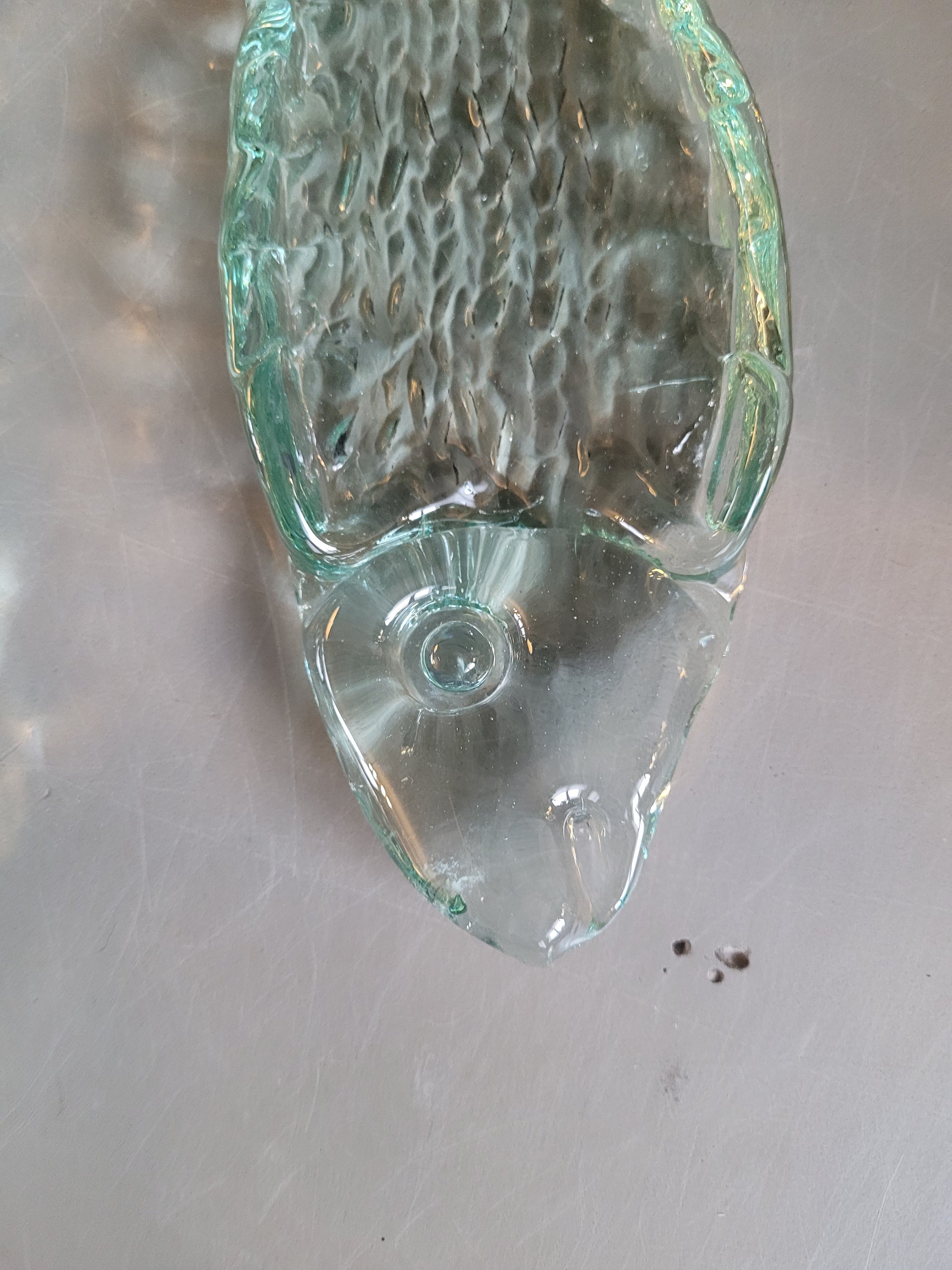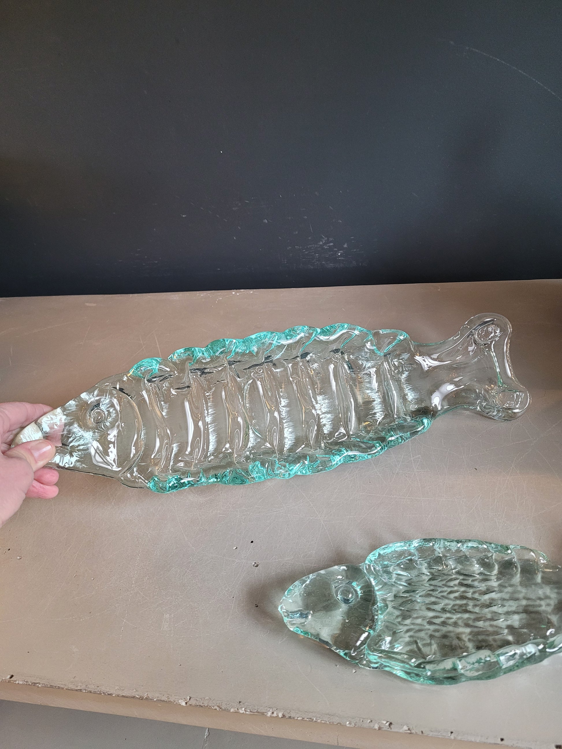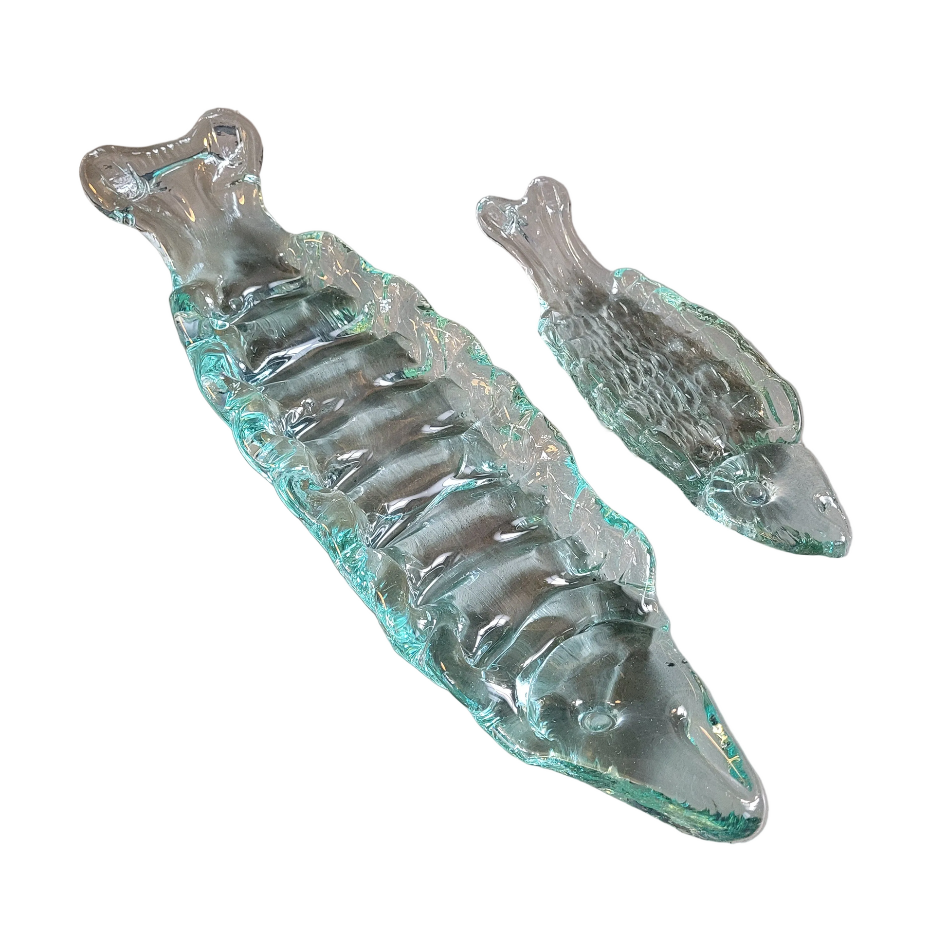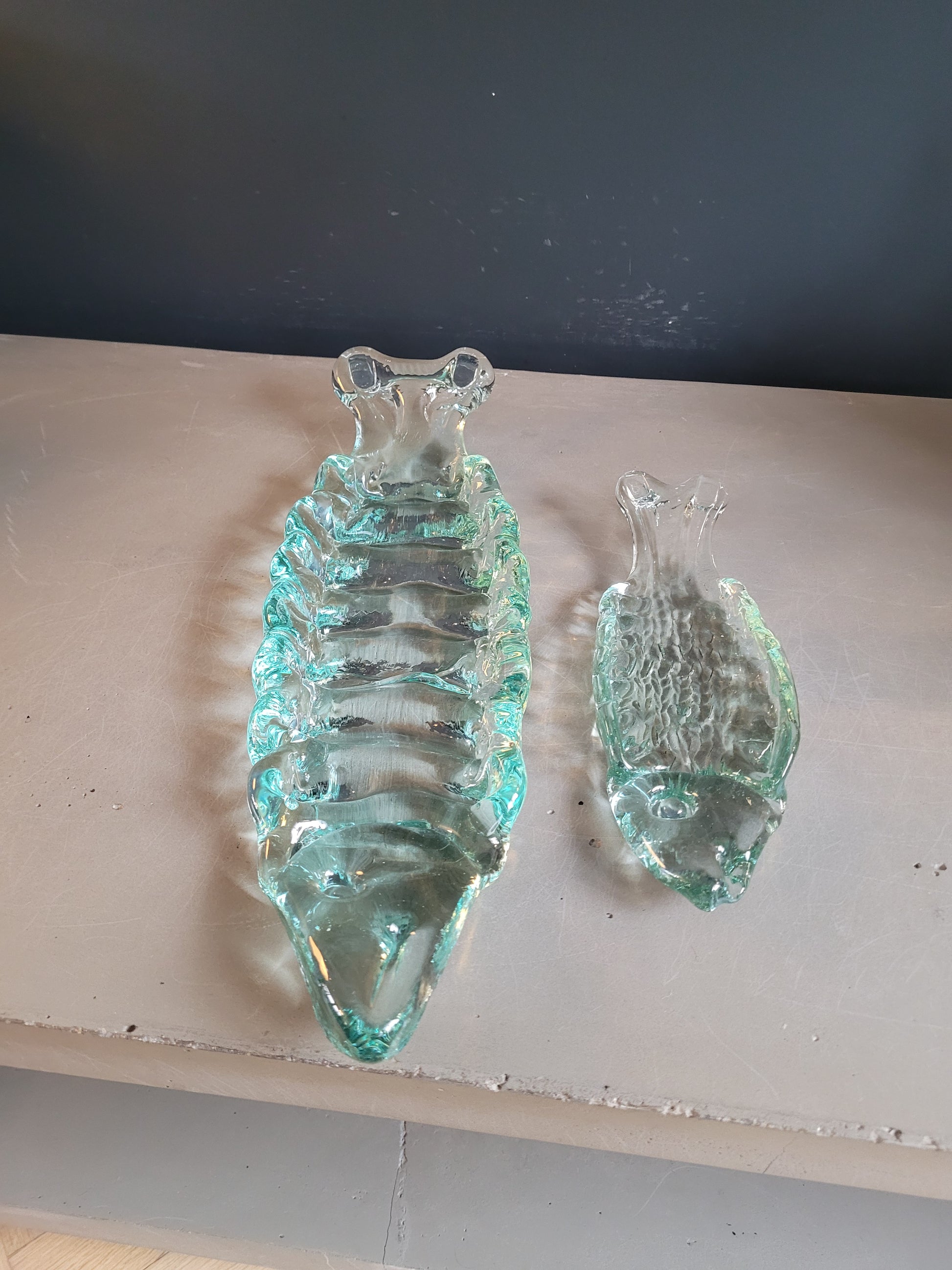 Magnifique paire de plats à sushis, ou autres mignardises, en verre très epais, transparent modelé à la main.