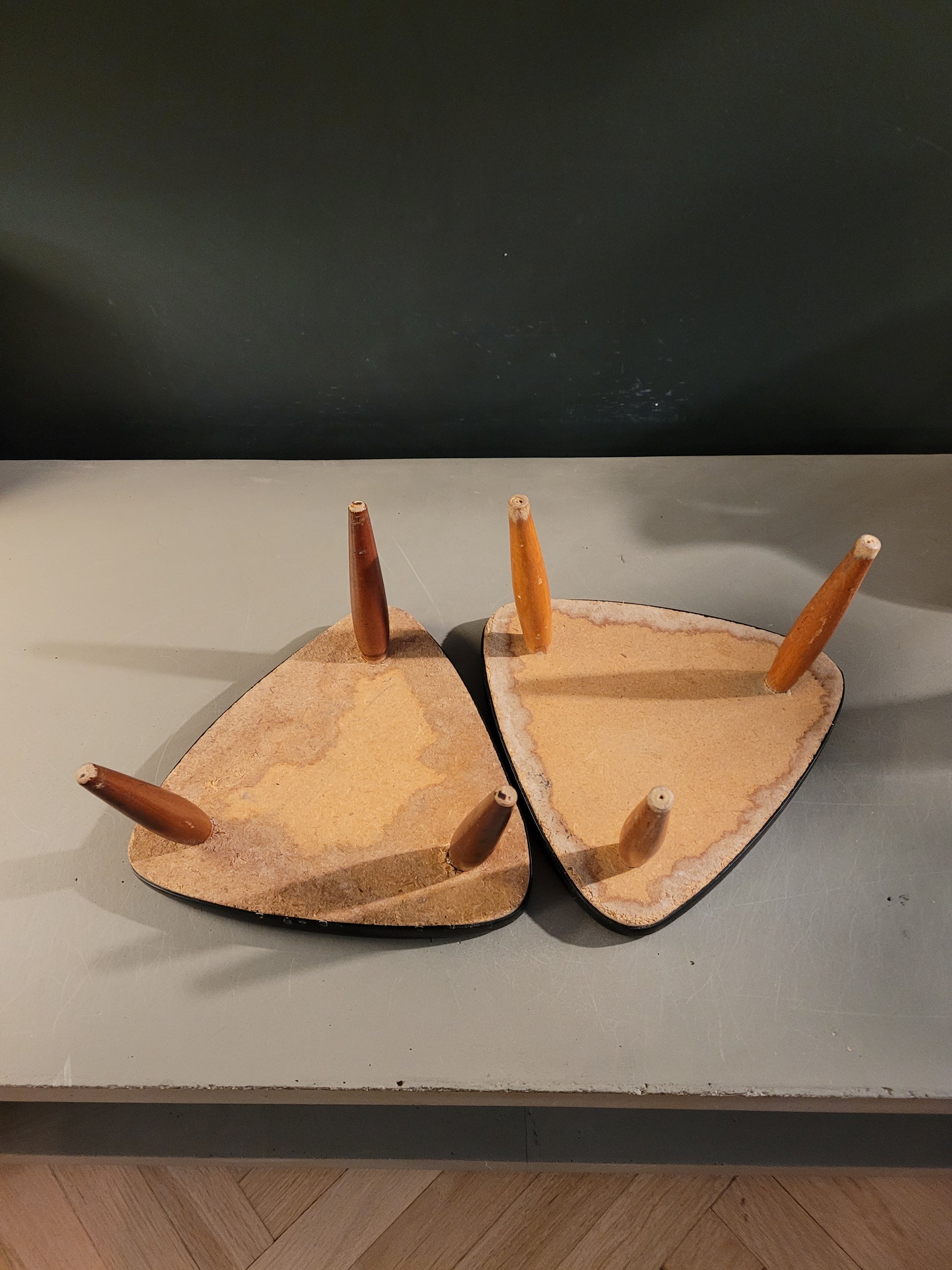 Les plateaux sont en aggloméré recouvert d'un film imprimé, le tour est protégé par un liseré en plastique noir, et les pieds sont en bois.