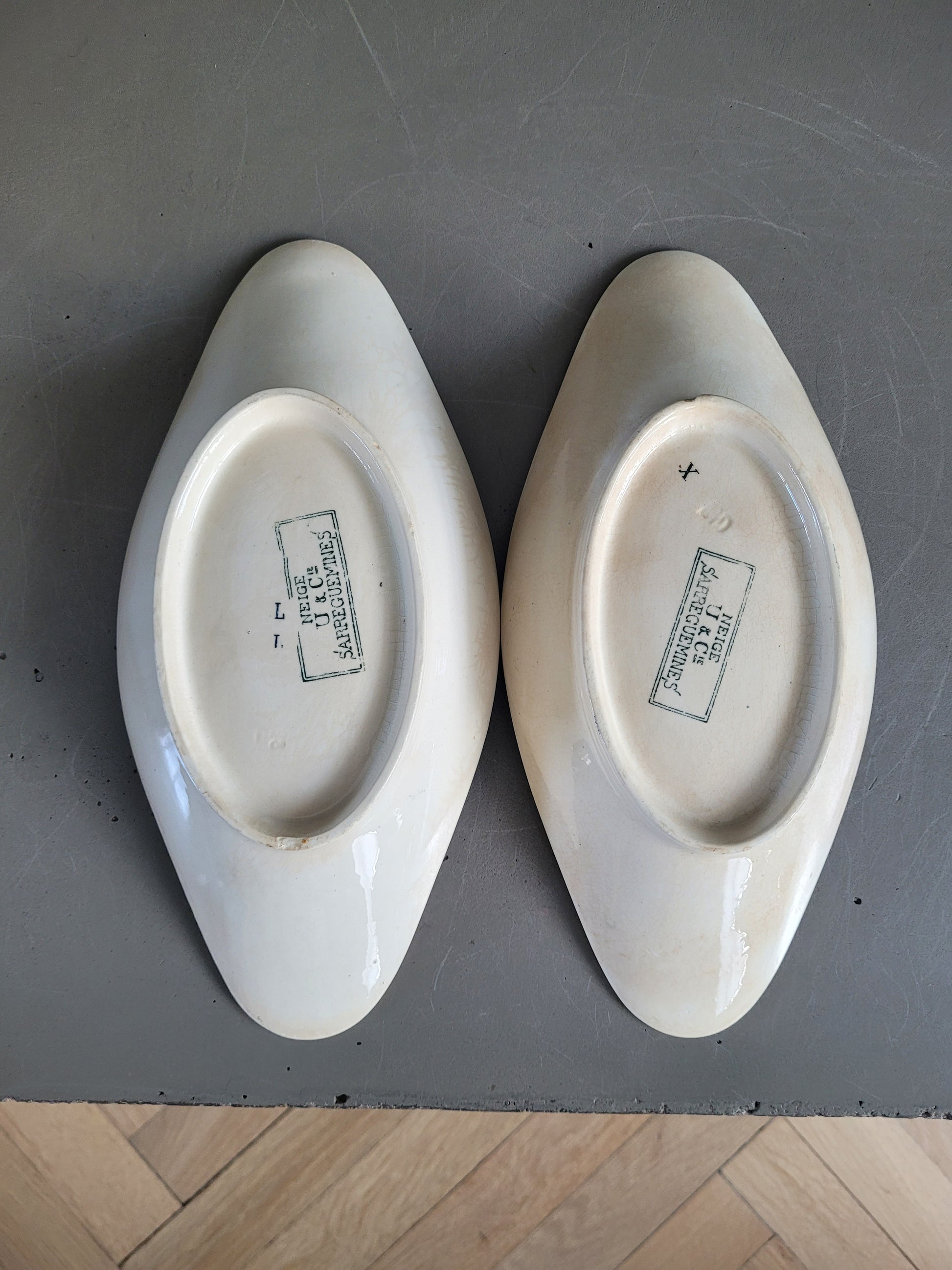 Ils portent au revers le tampon U & Cie Sarreguemines, permettant de les dater autour de 1880–1910.
