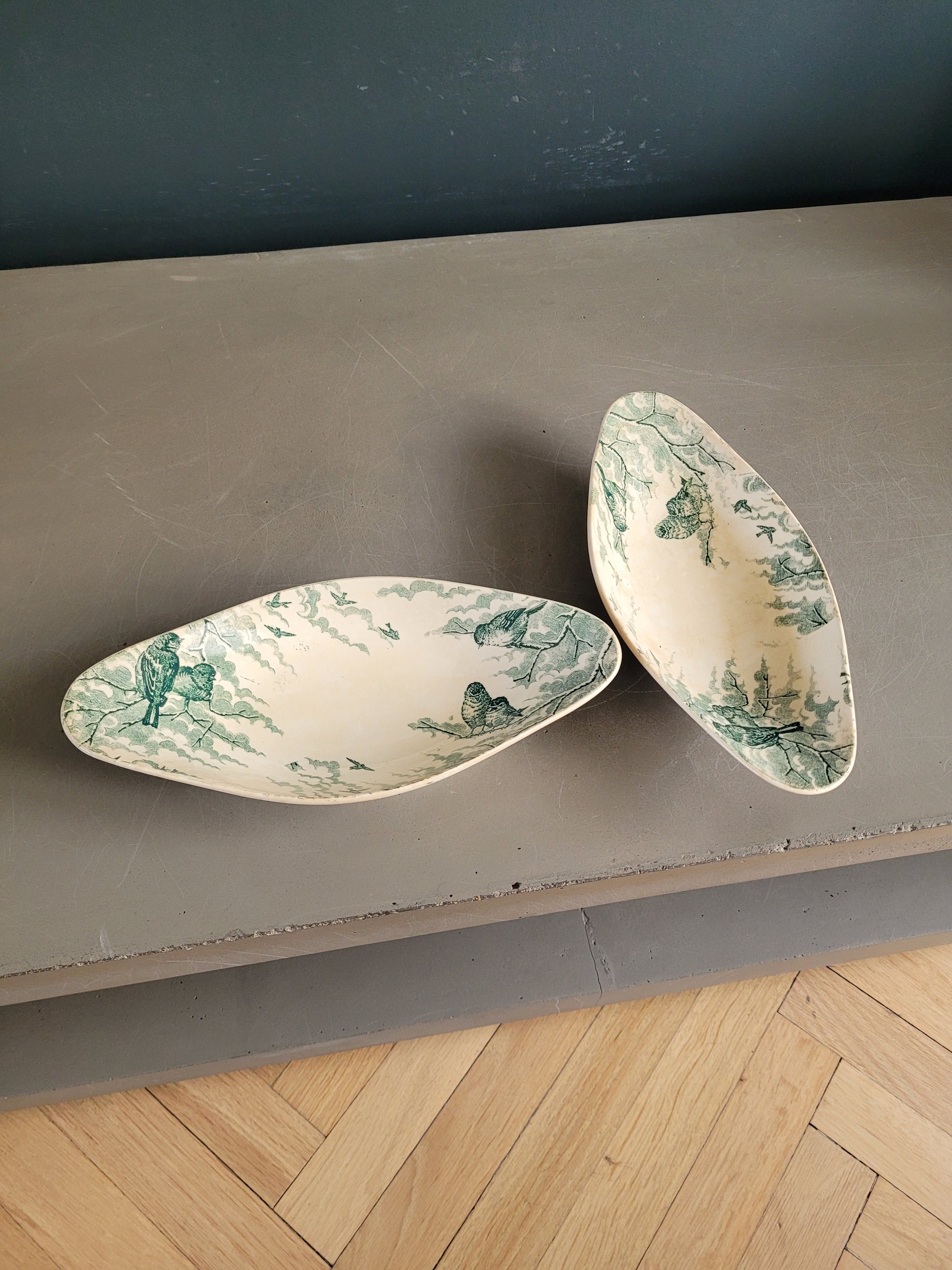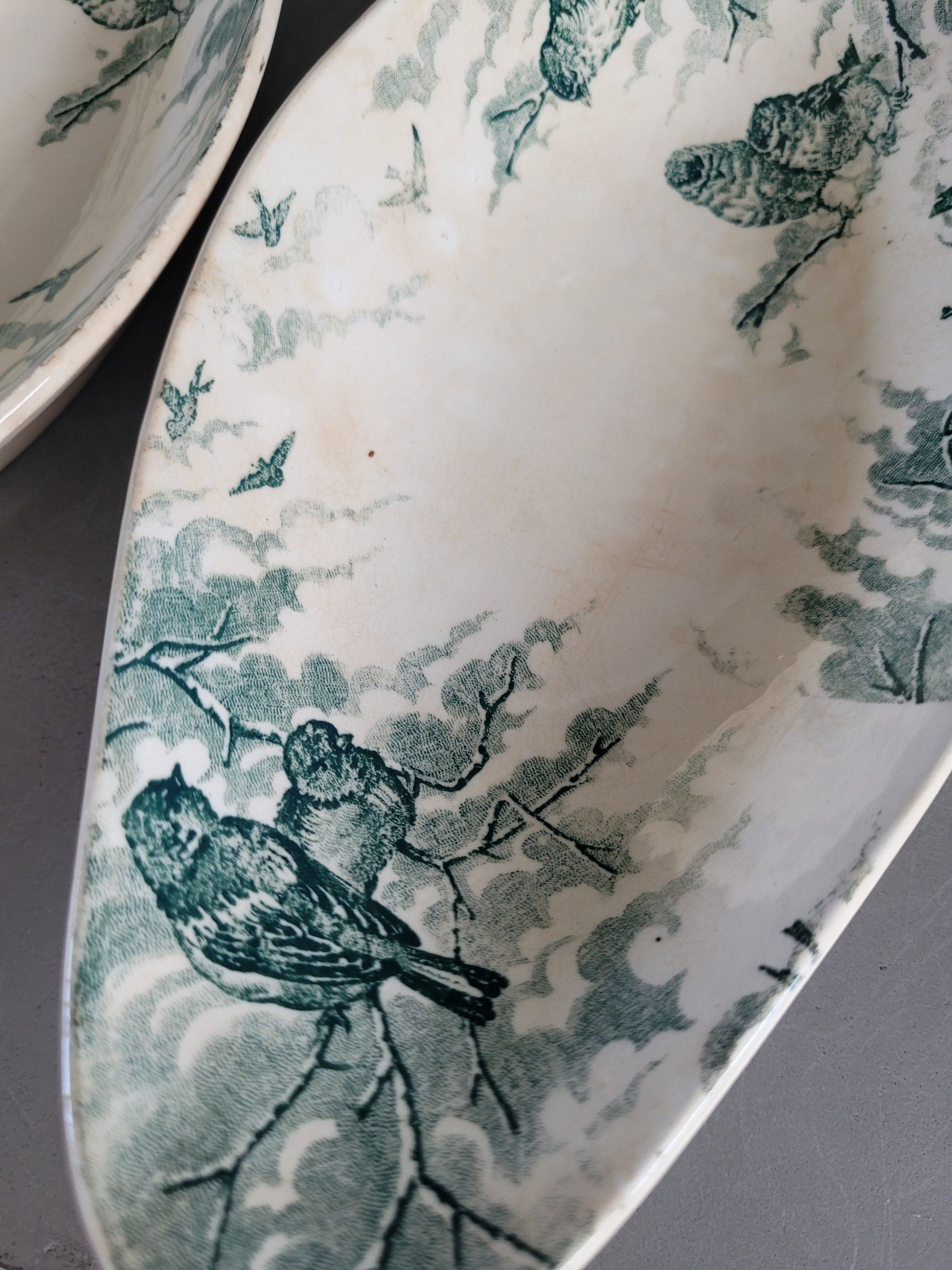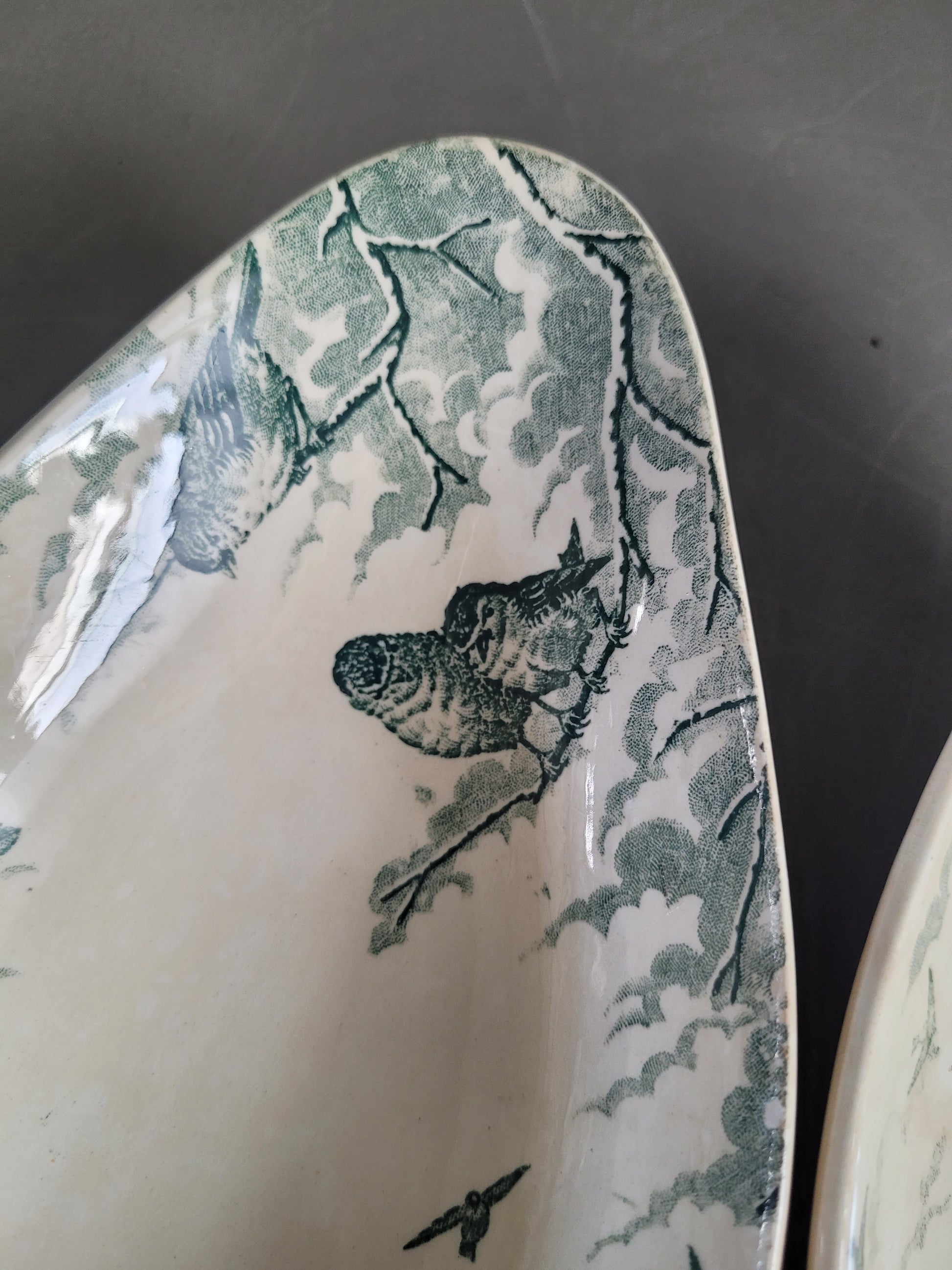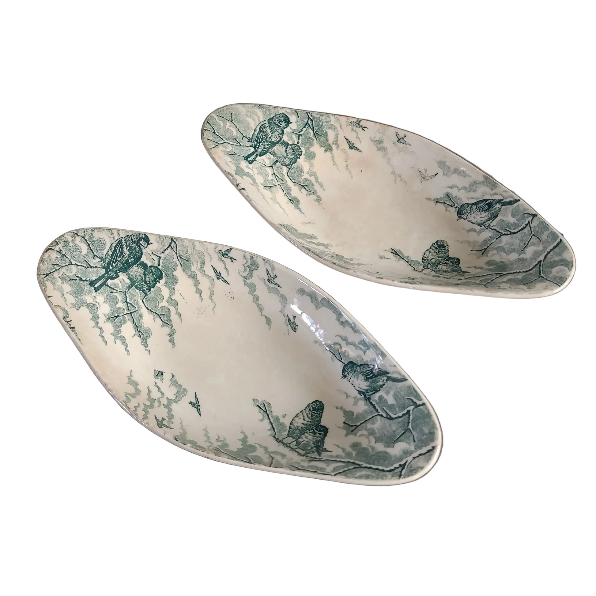En terre de fer, modèle Neige, ces raviers présentent un joli décor vert d'oiseaux perchés sur des branches enneigées, dans un esprit doux et poétique typique des productions de la fin du XIXe siècle.
