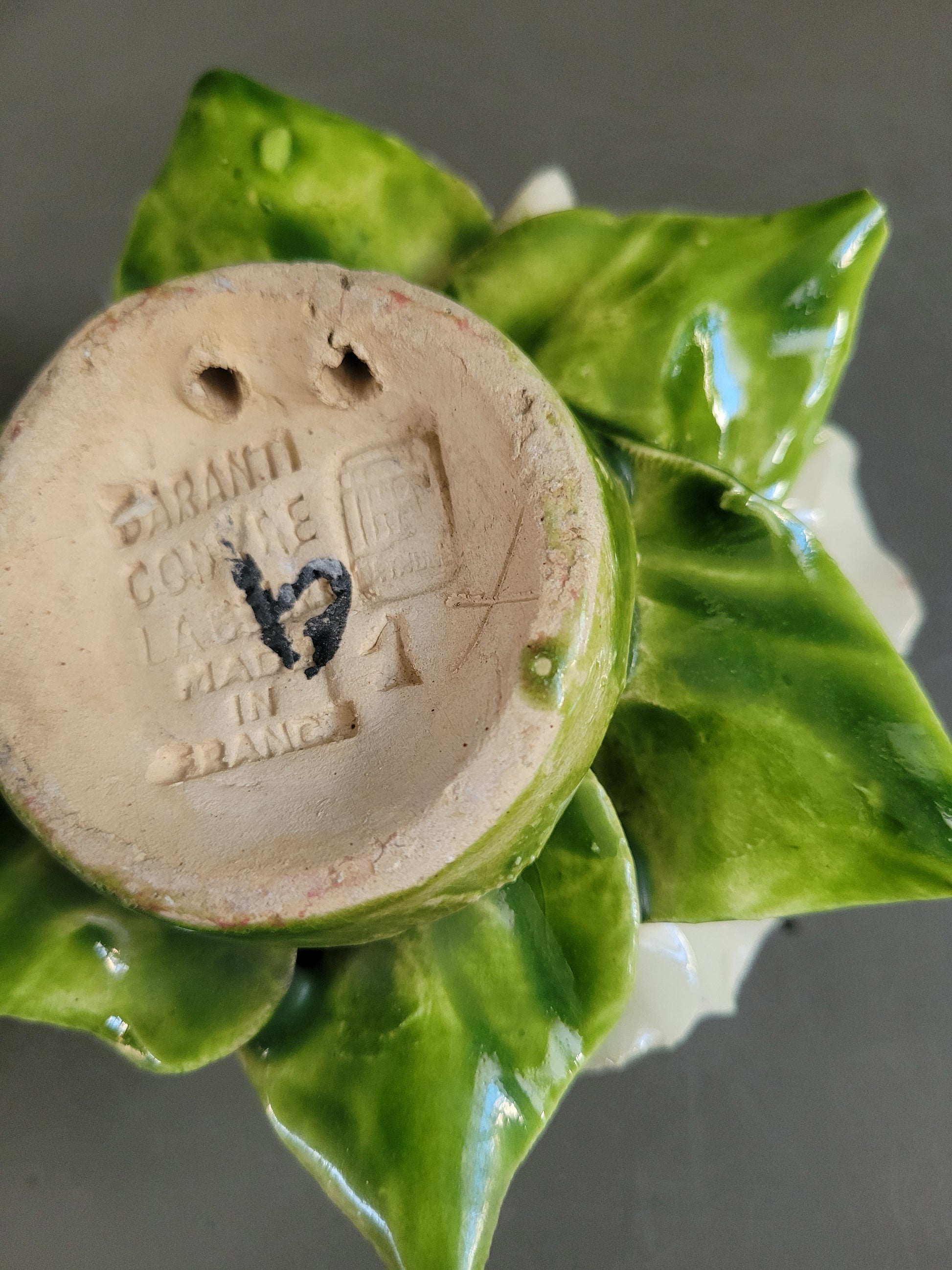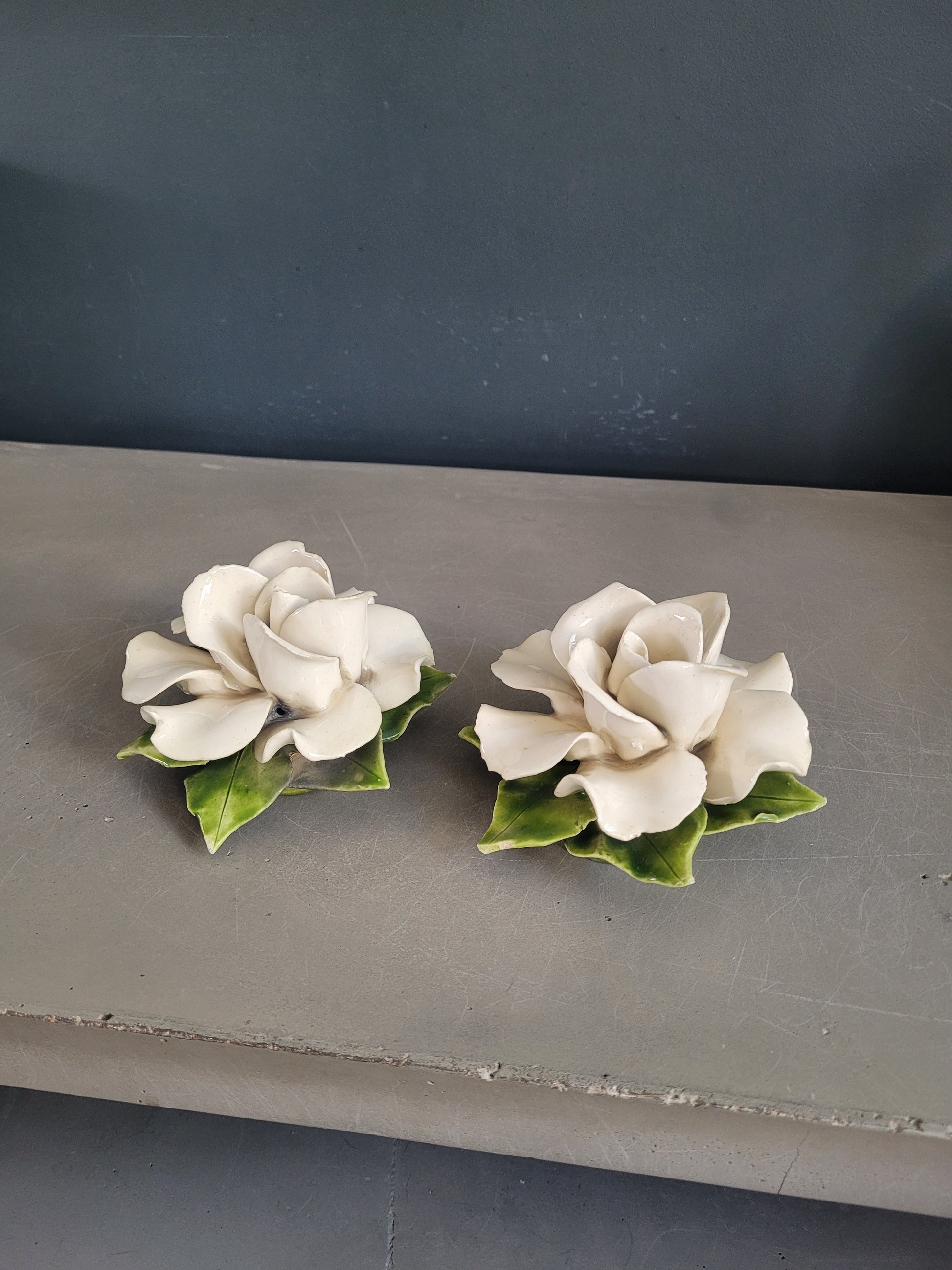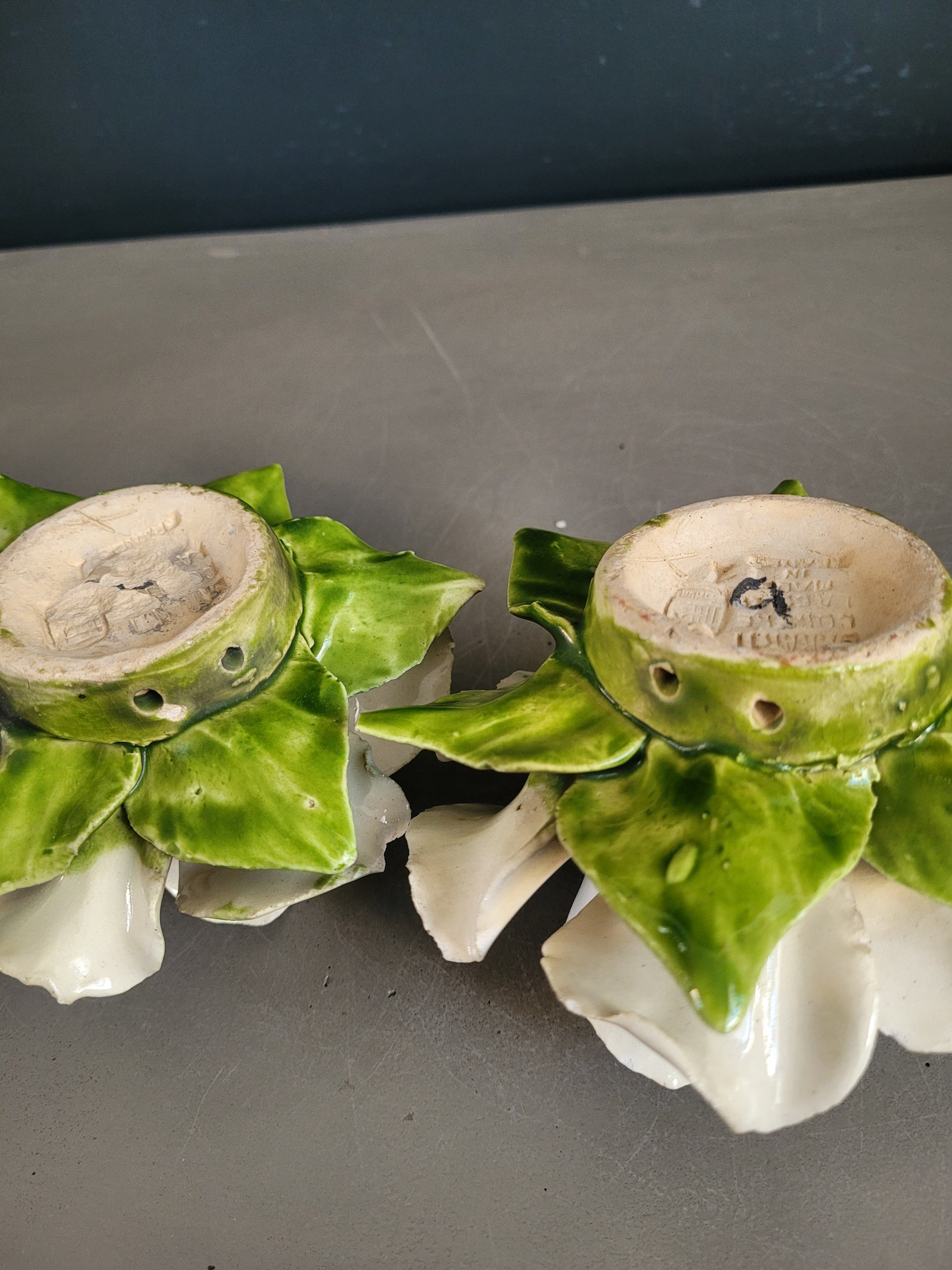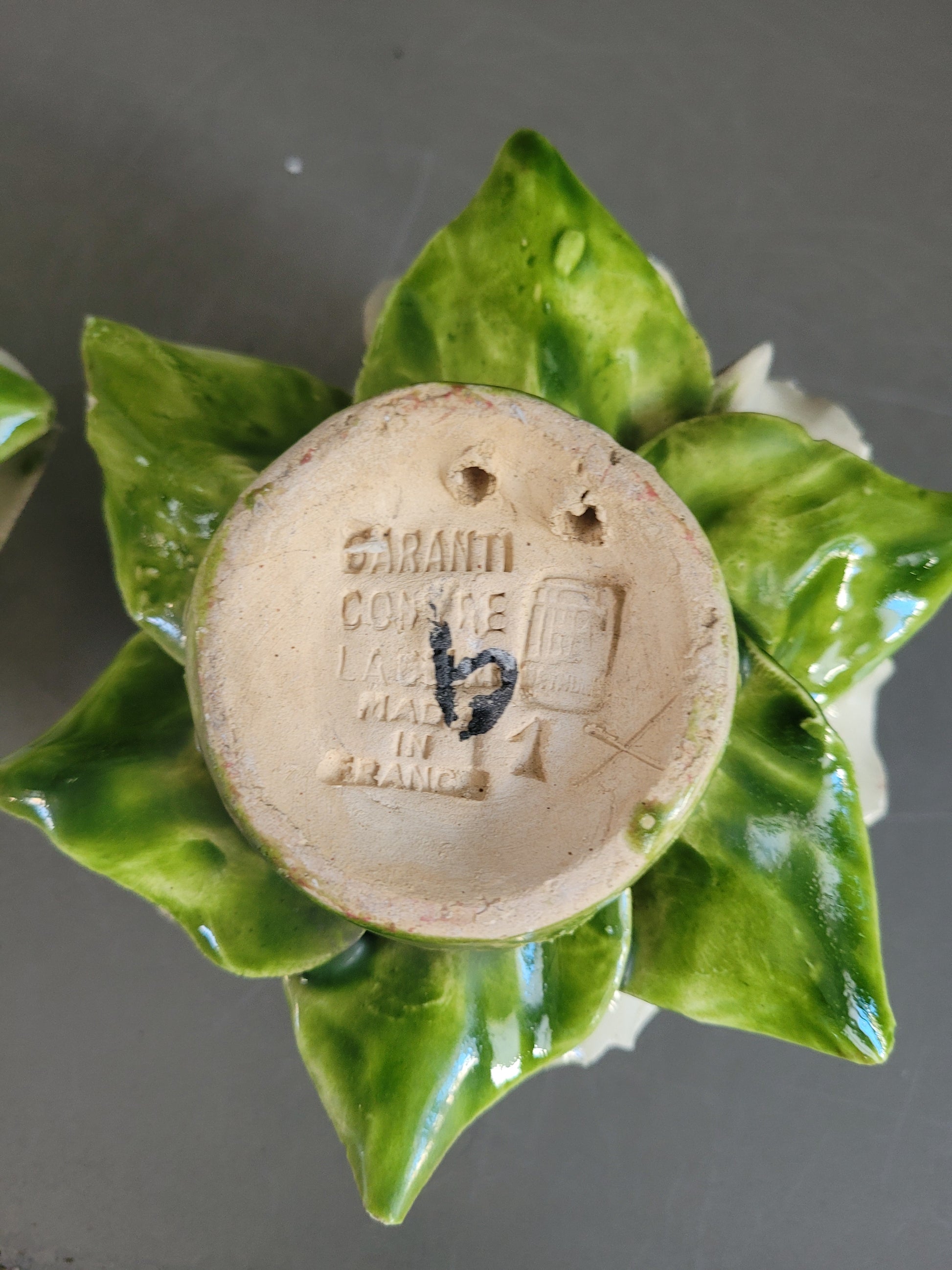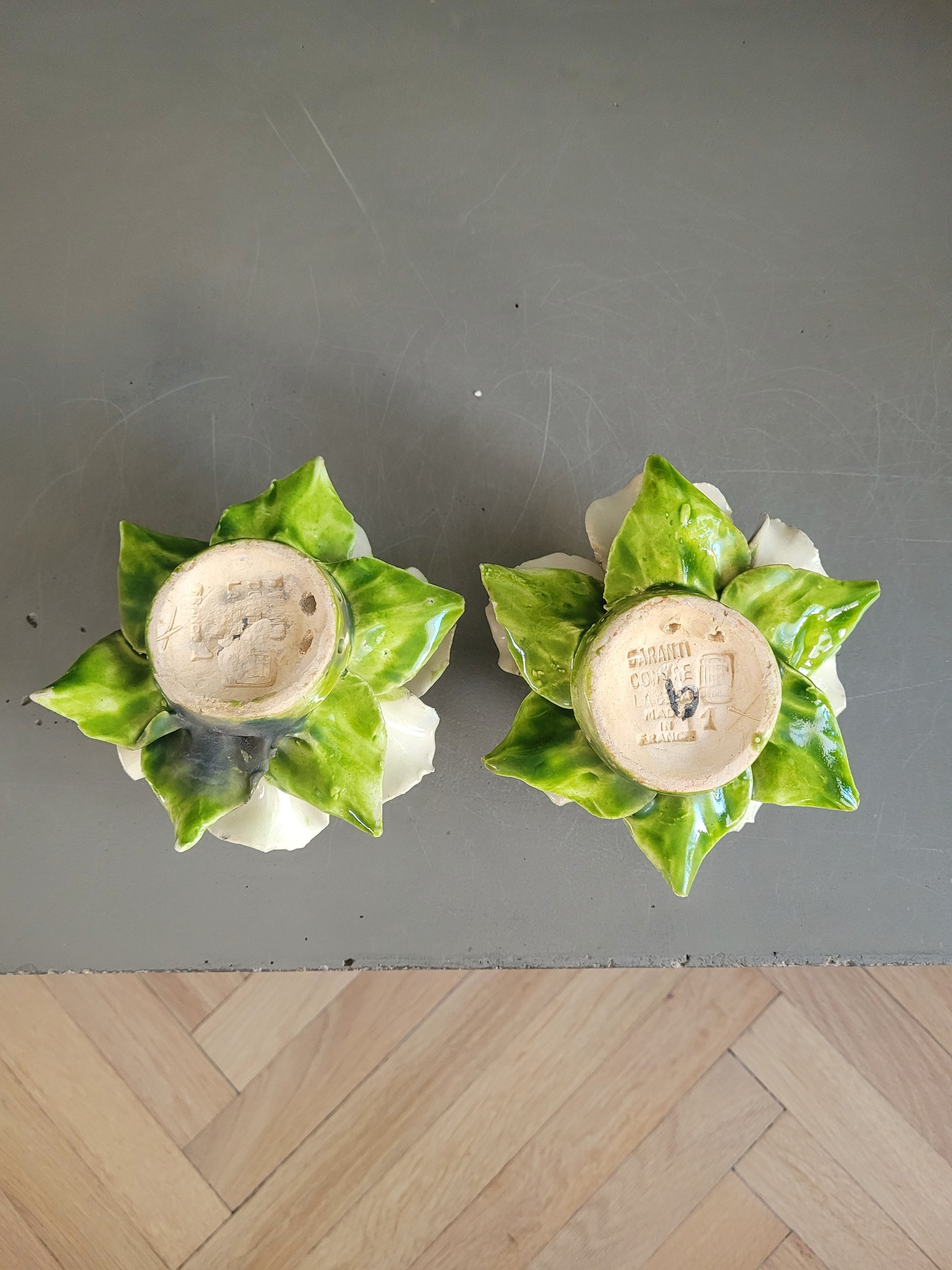 Faites à la main, en France, des pièces uniques, elles sont absolument sublimes. Et en très bon état à l'exception de légers, rares et discrets éclats sur les bords des pétales, il n'y a pas de défaut à signaler.