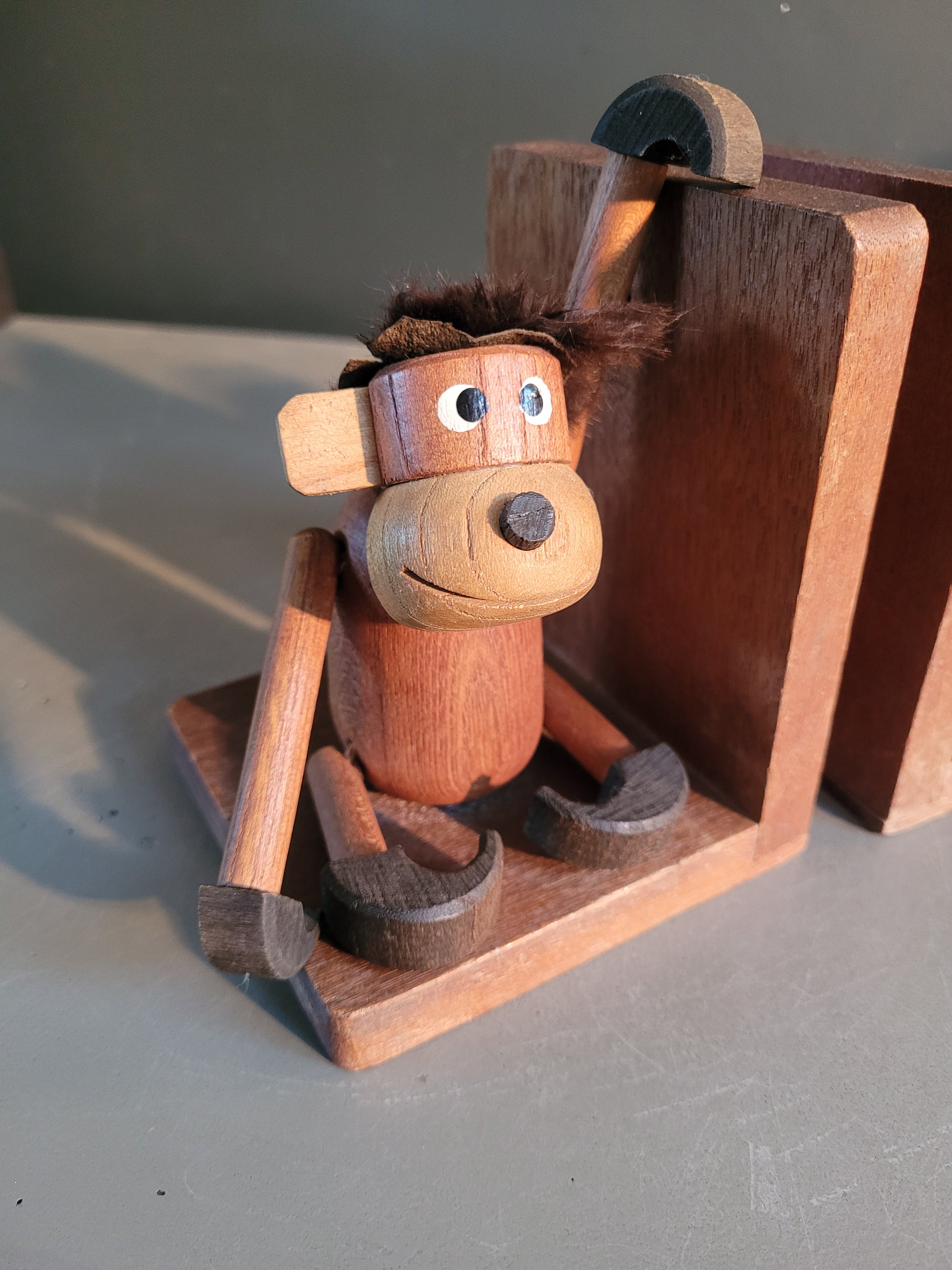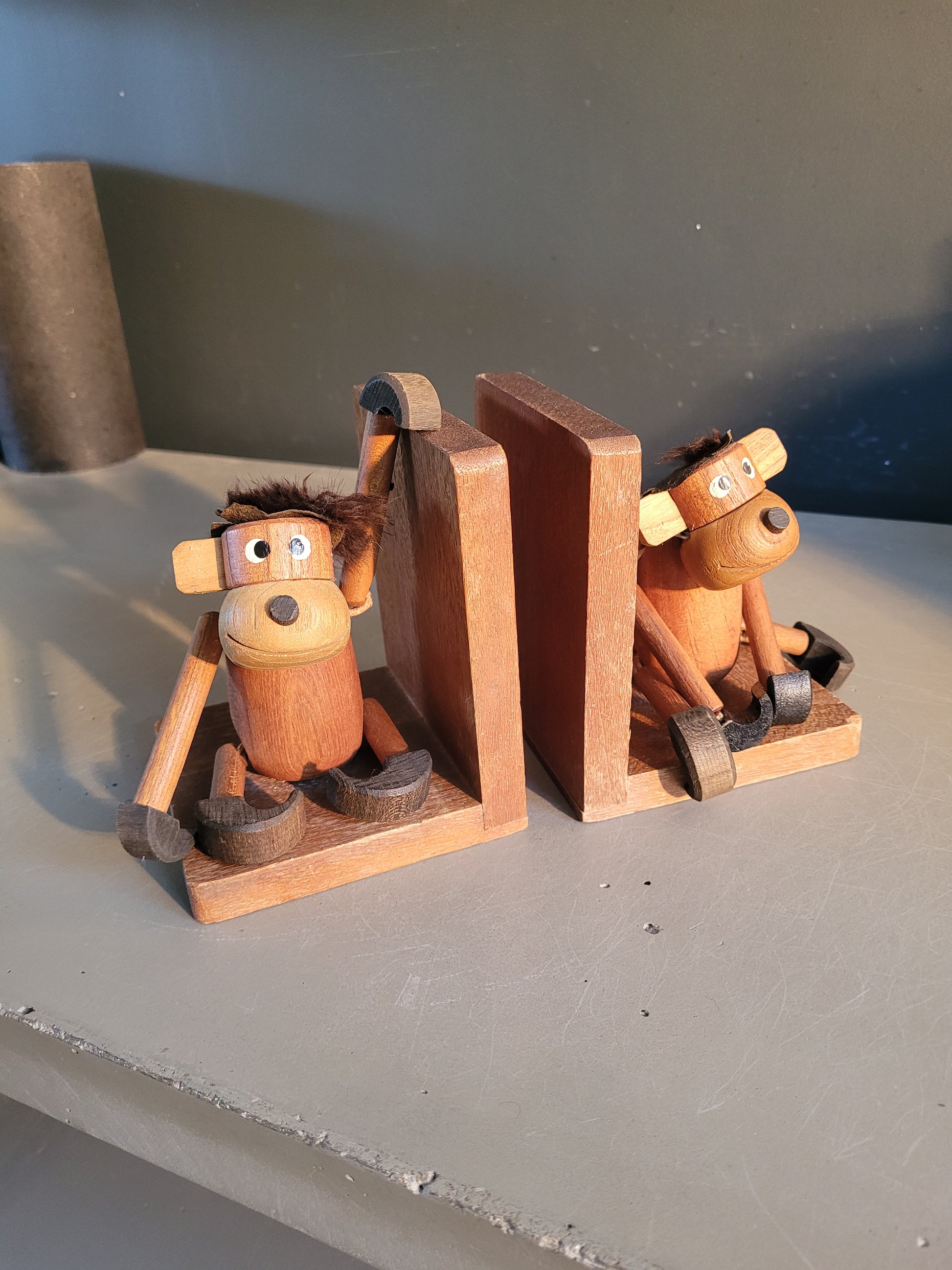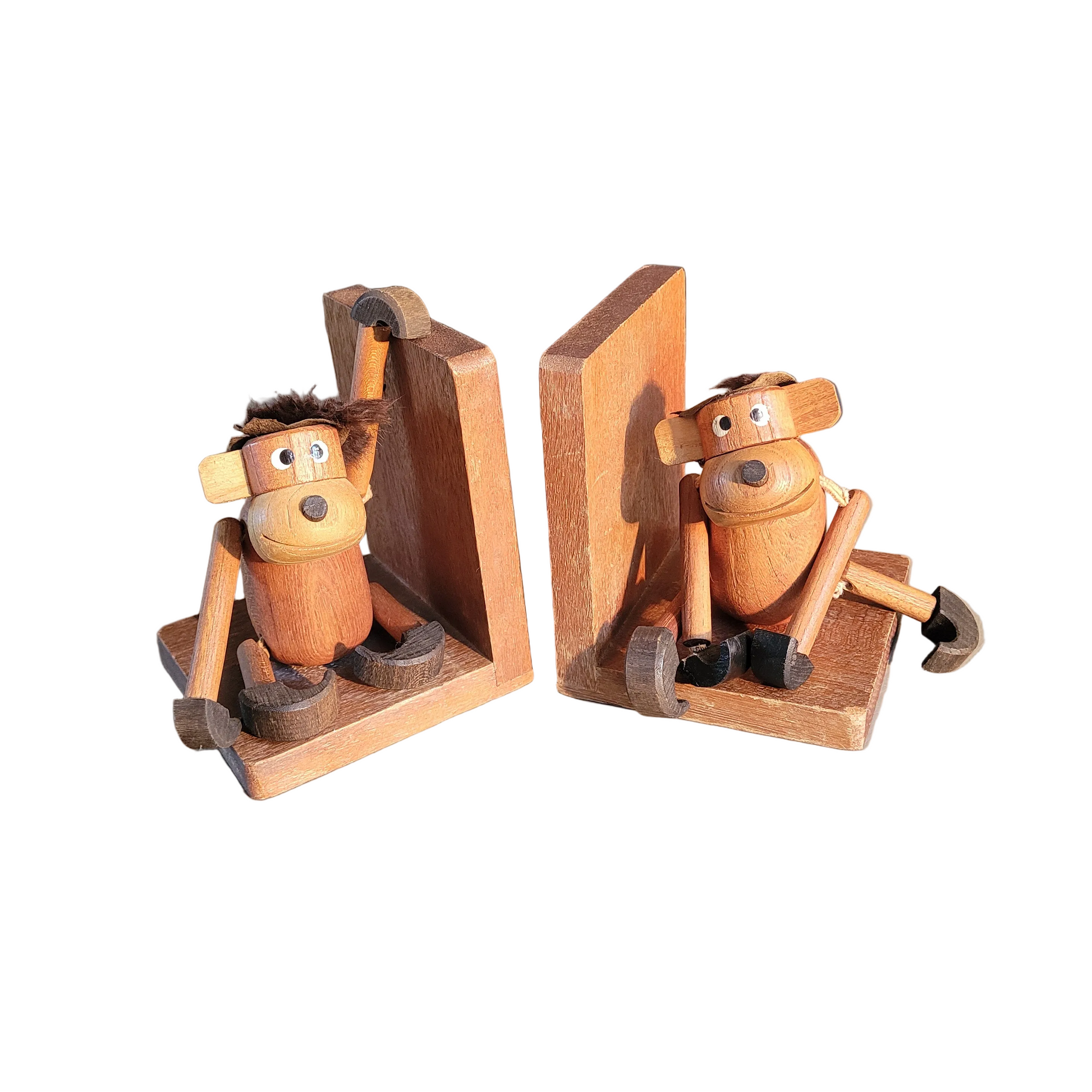 Magnifique paire de serre-livres scandinaves vintages en bois avec figurines singes.