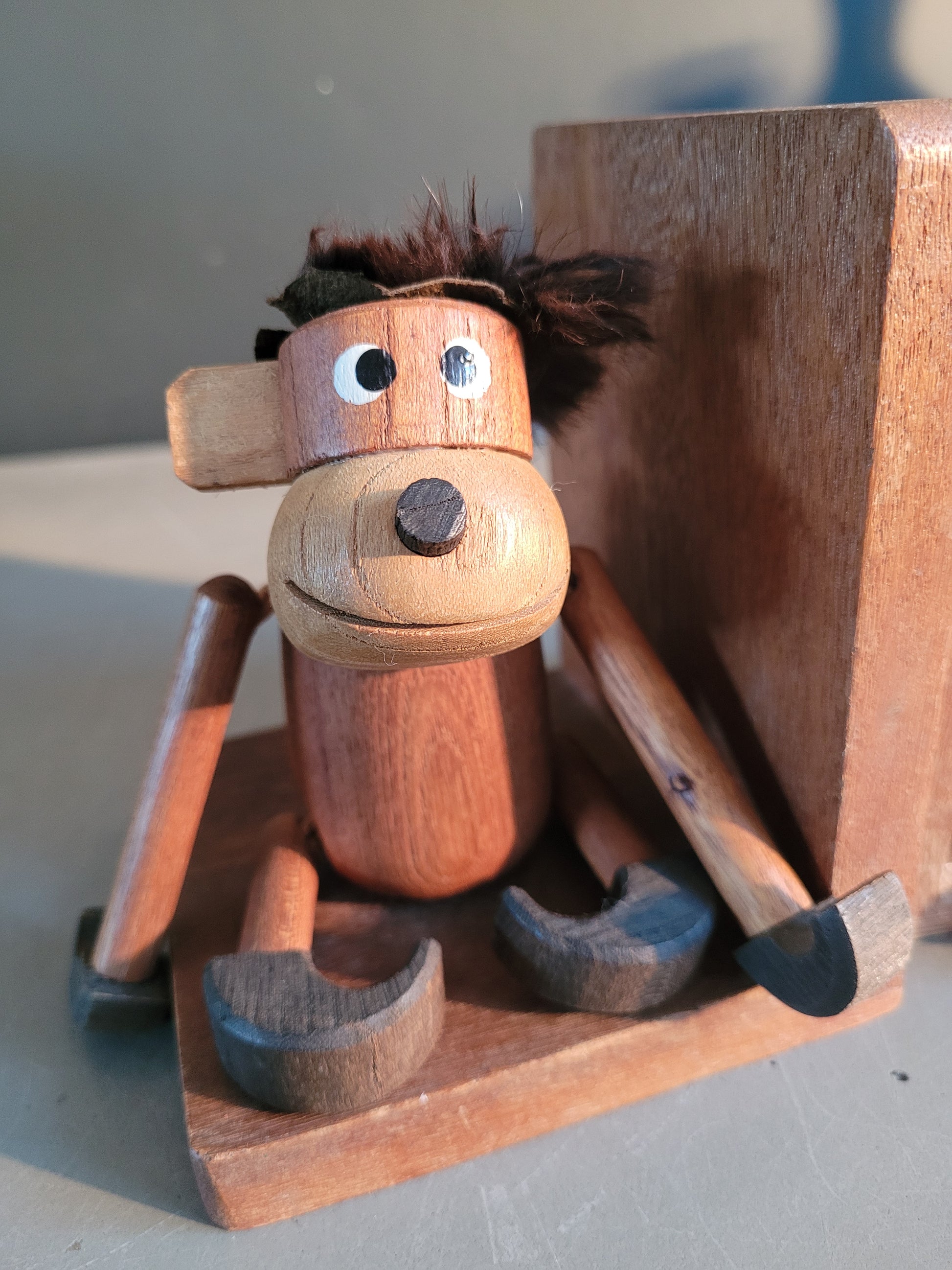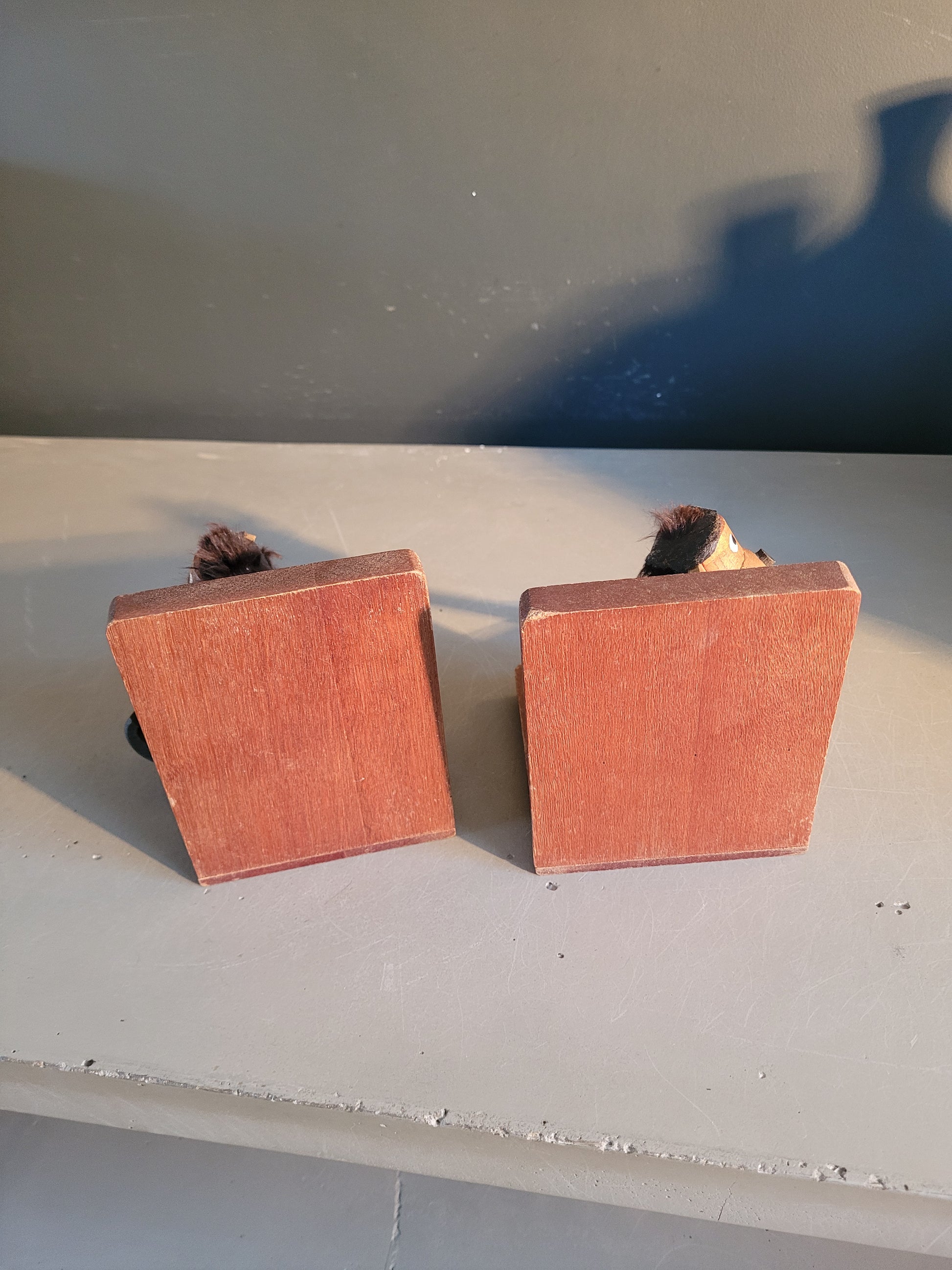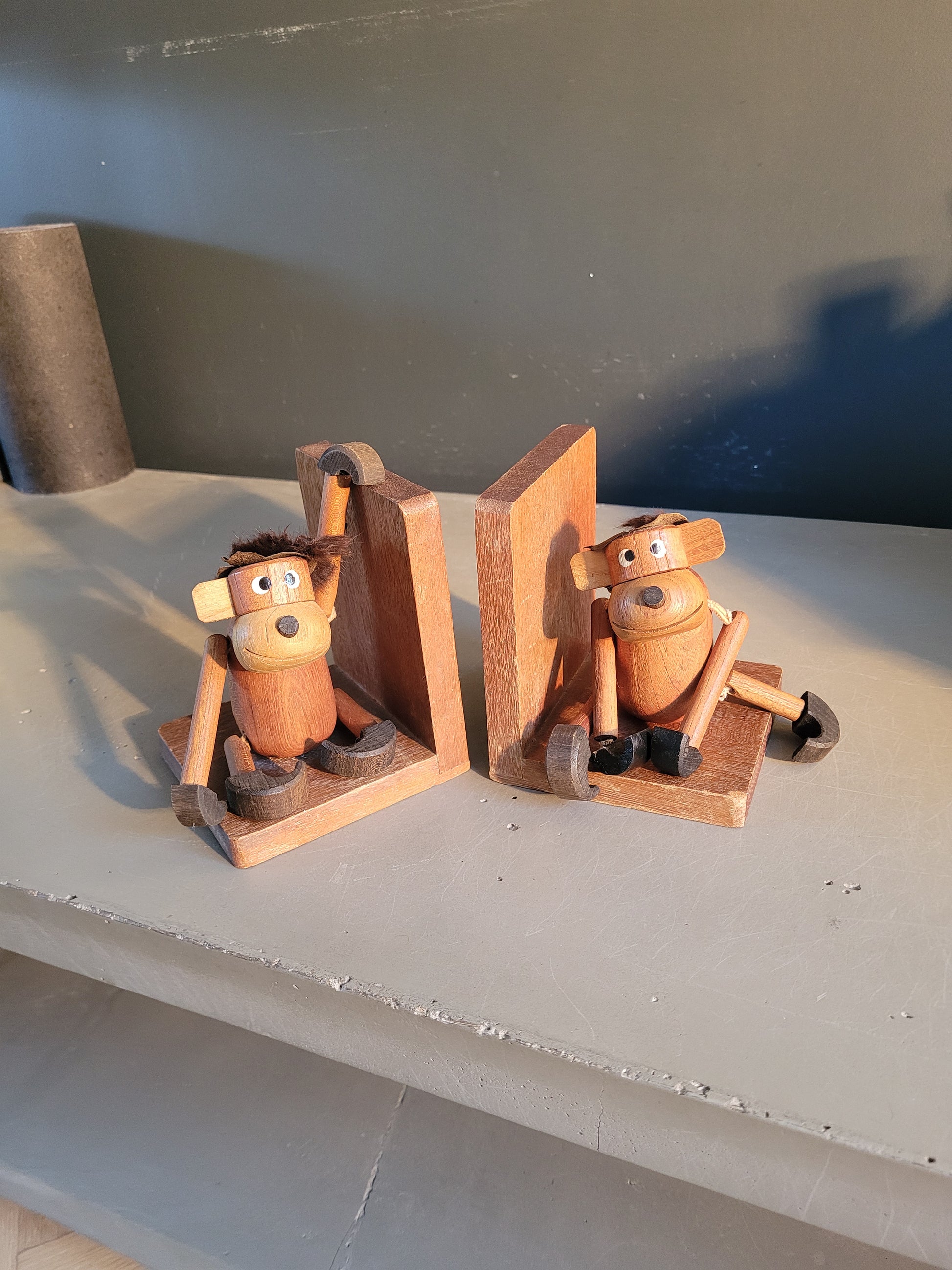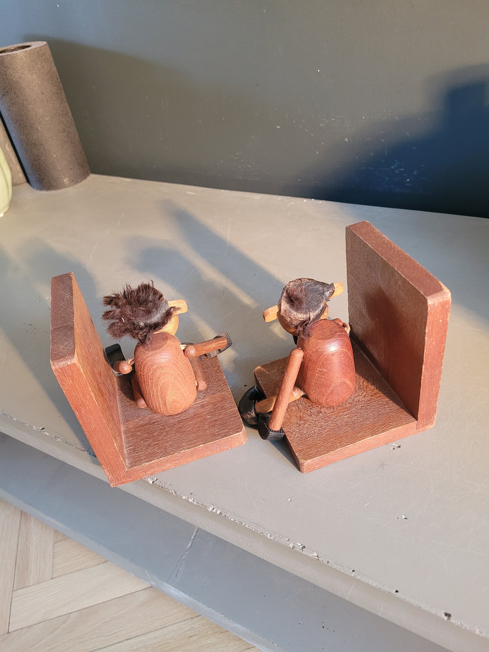Magnifique paire de serre-livres scandinaves vintages en bois avec figurines singes.