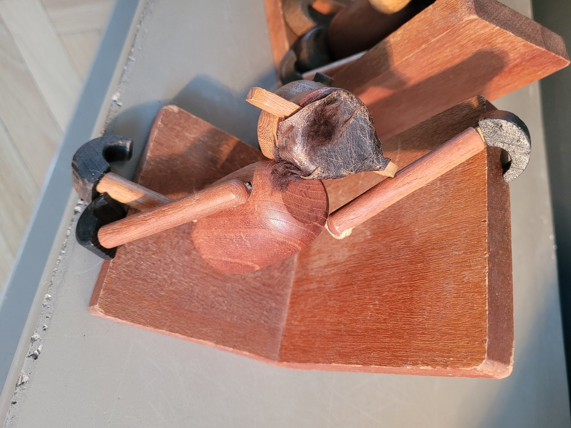 Les mains et les pieds sont en bois noir et forment des crochets.
