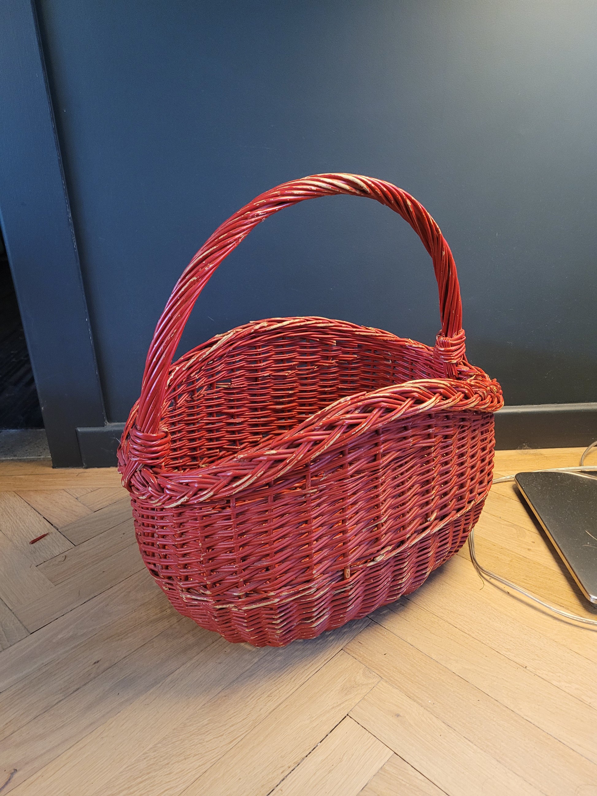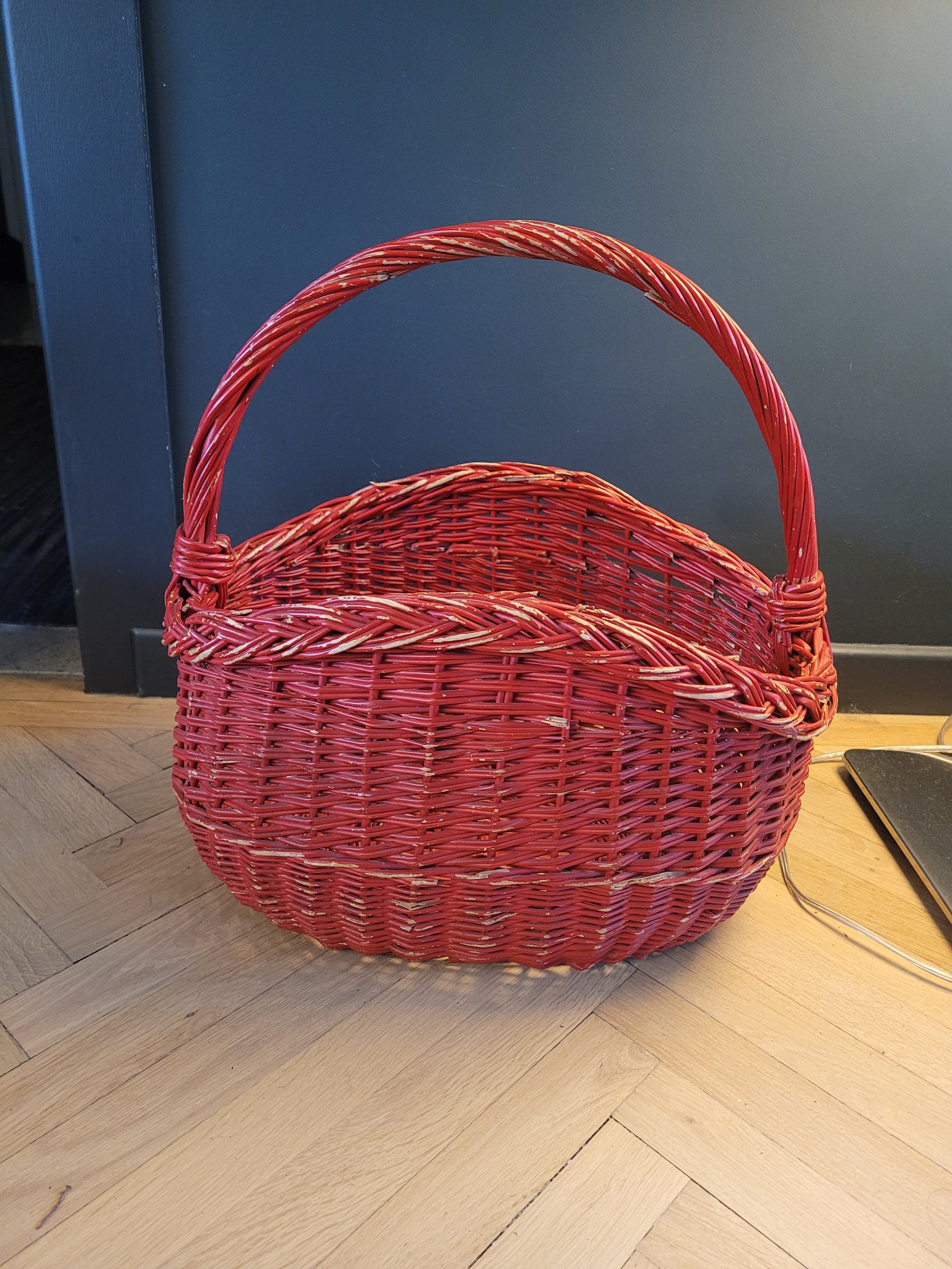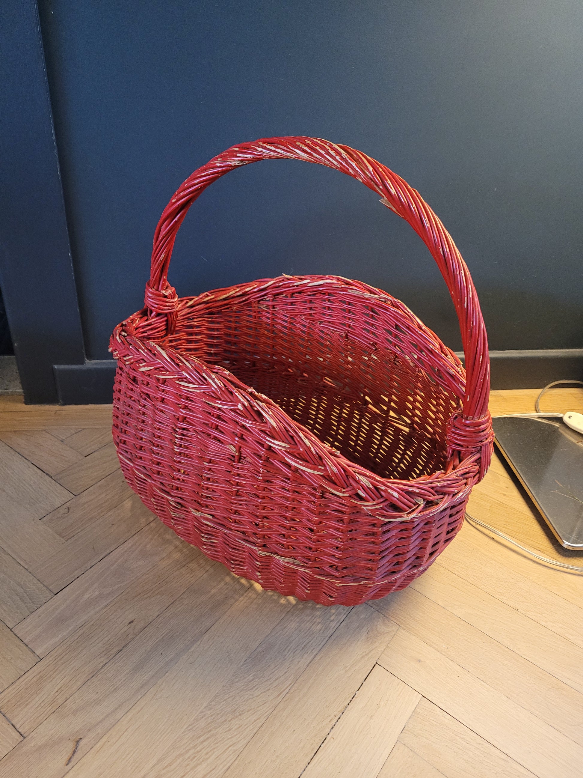 Superbe look pour ce panier peint en rouge, de belle facture avec sa finition tressée et bombée sur le haut des côtes.