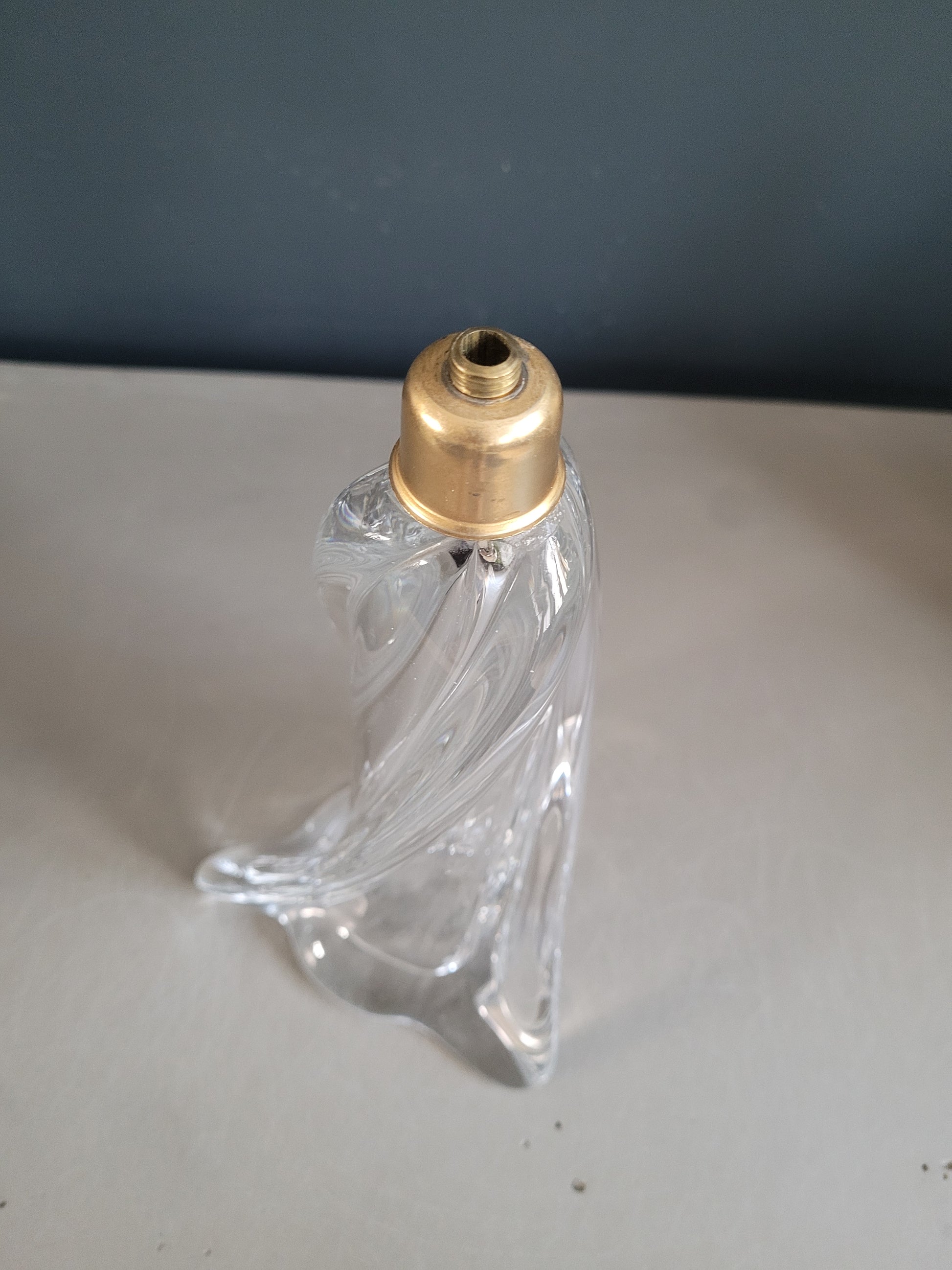 Très beau pied de lampe ancienne en cristal de forme torsadée avec support de douille.
