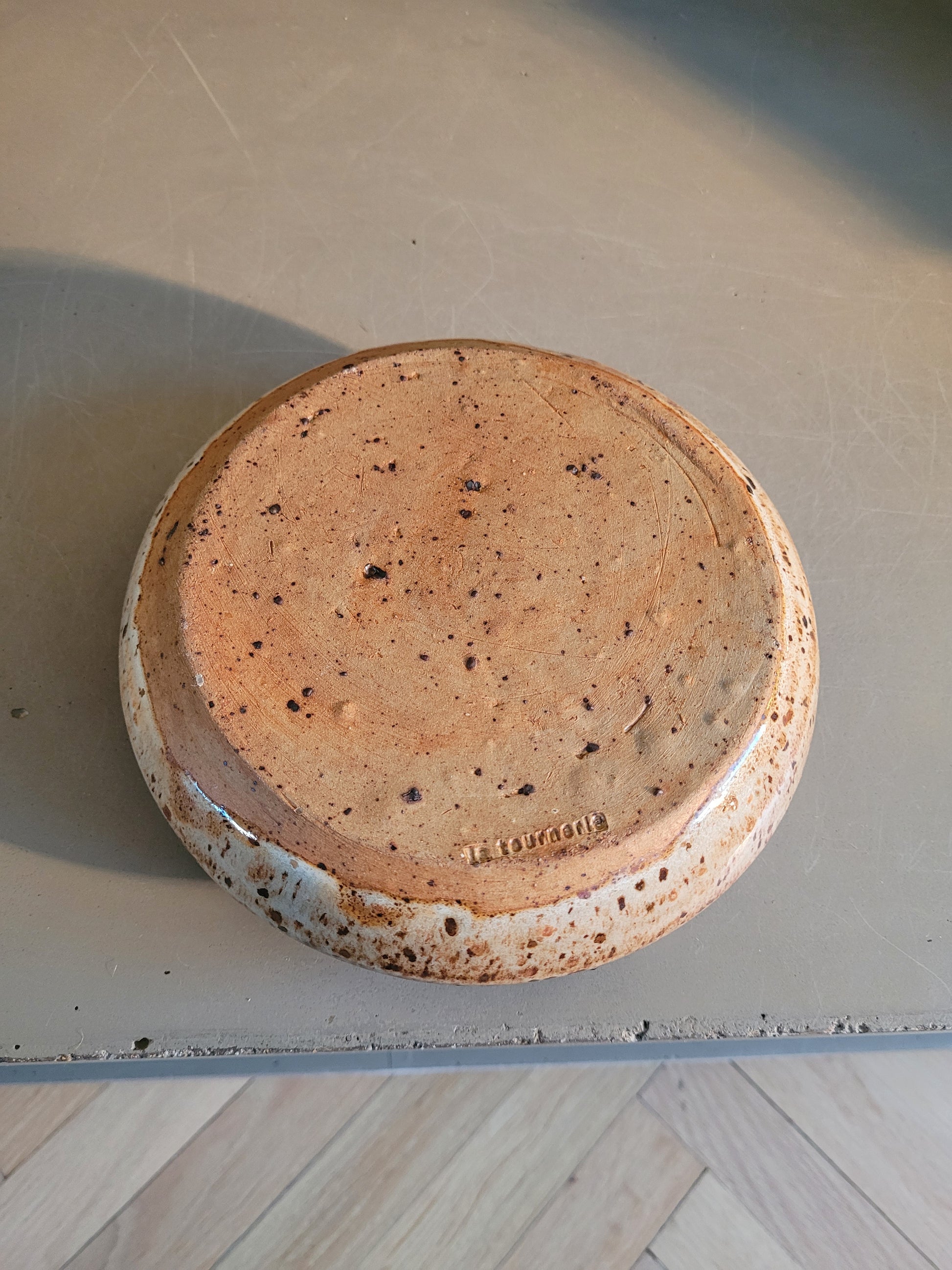 En email moucheté marron et beige/gris, avec un décor (fleurs ?) bleu.
