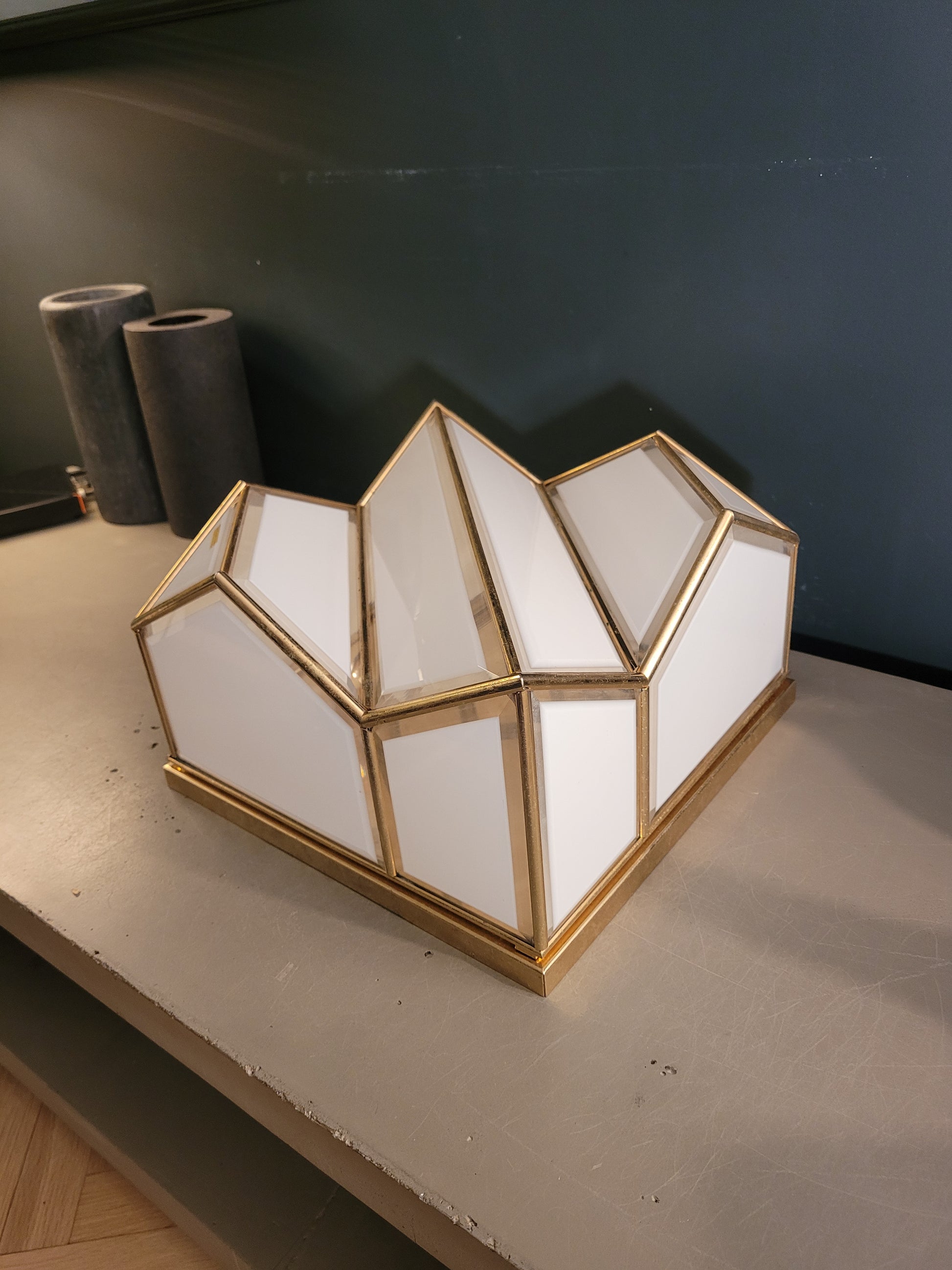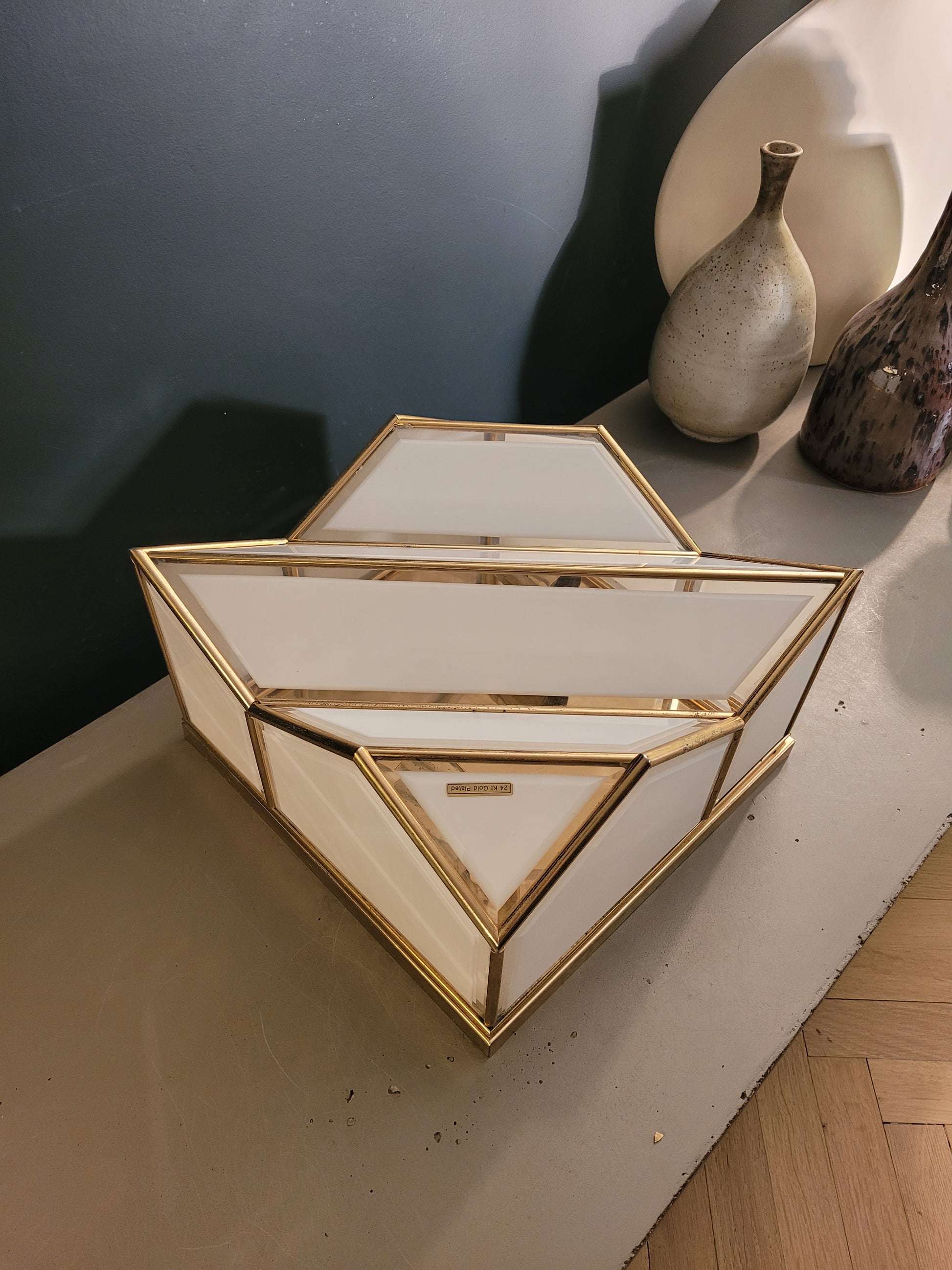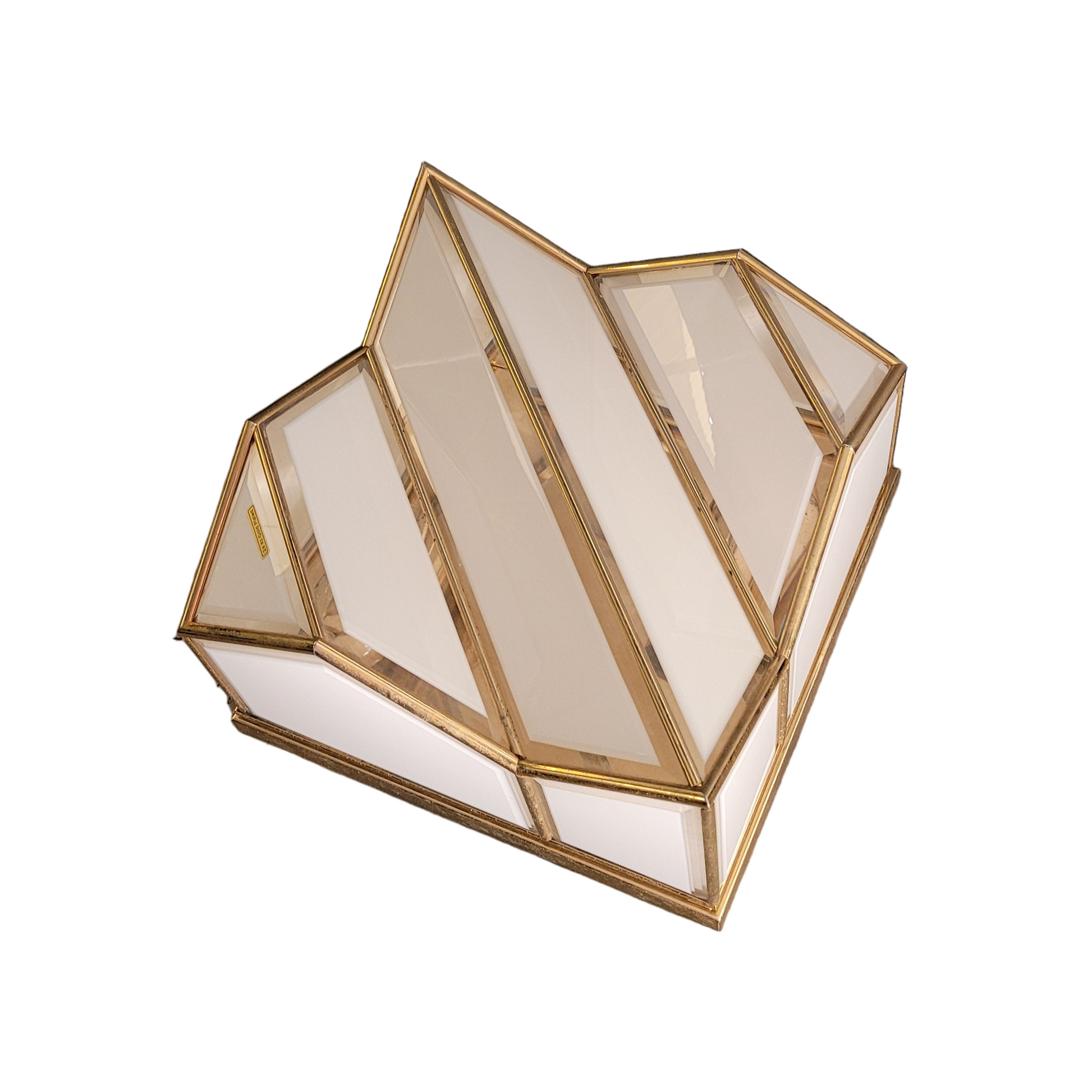 Chaque facette est en verre biseauté bicolore. La partie bisrautée est transparente et la partie centrale blanche.