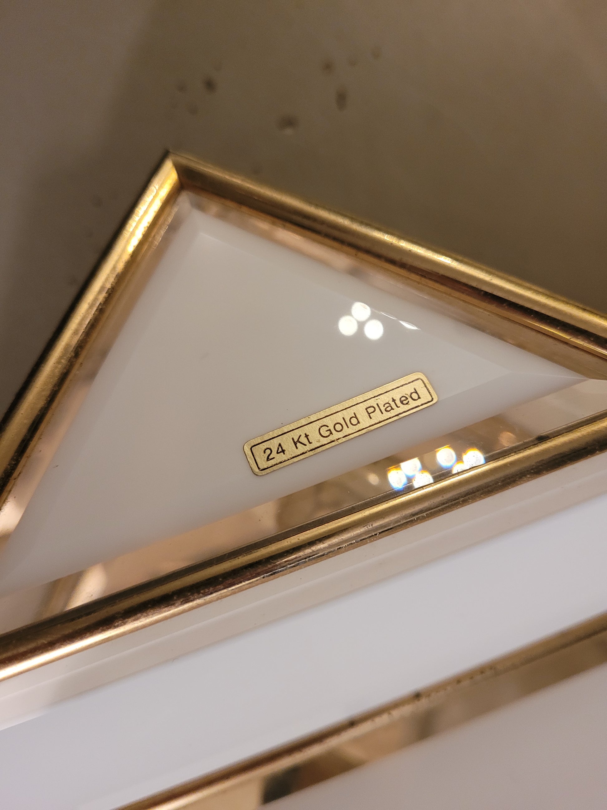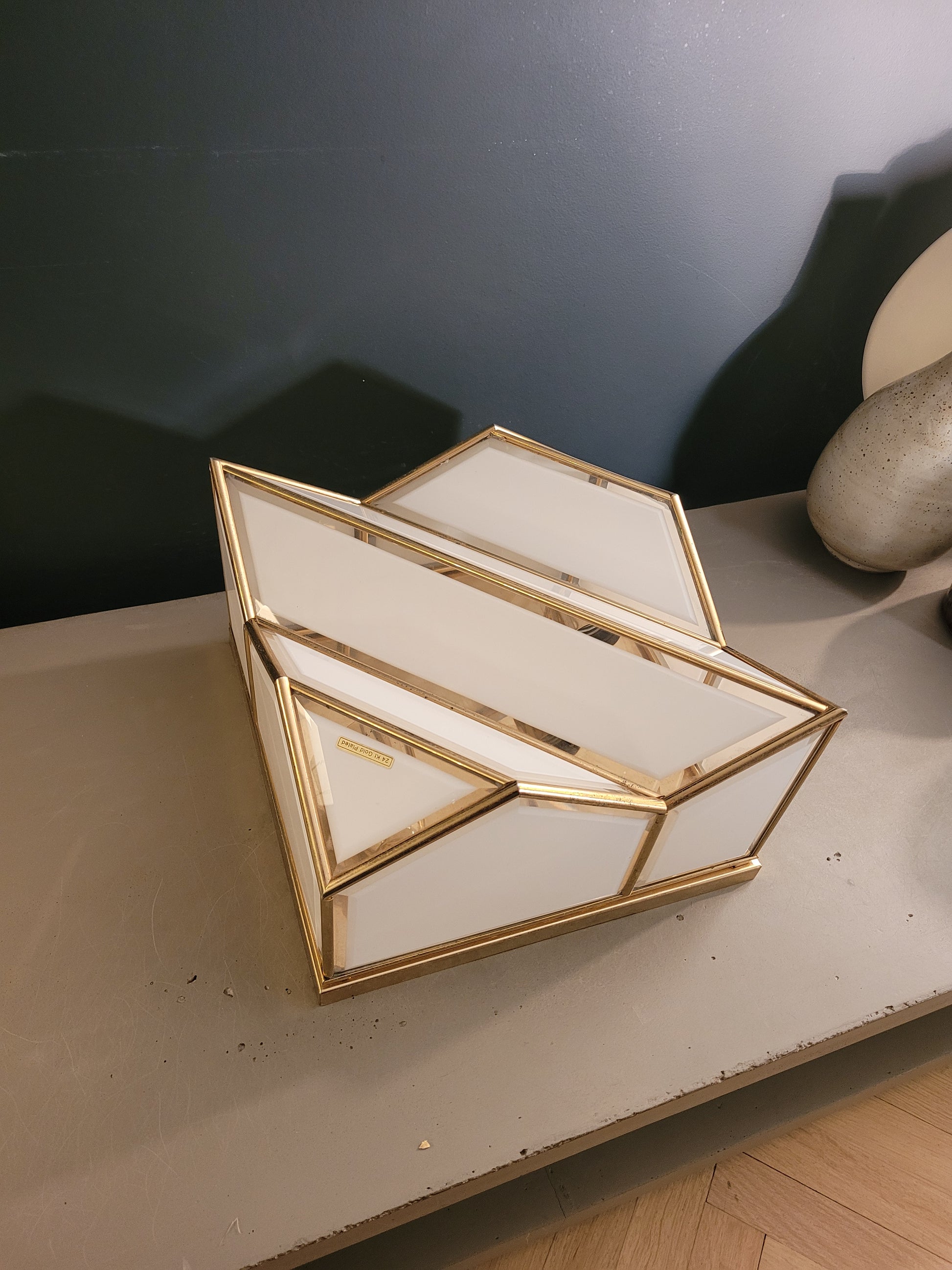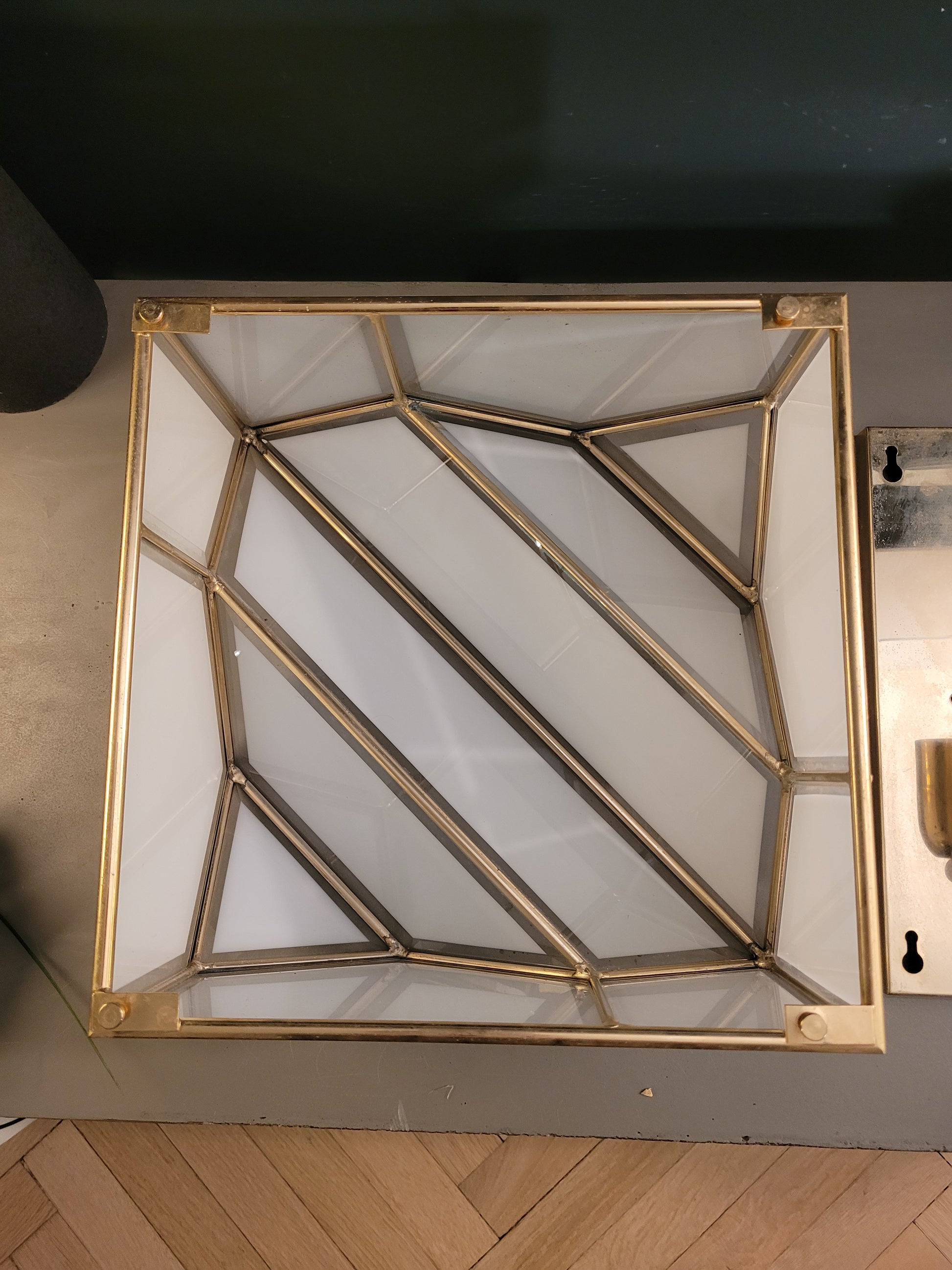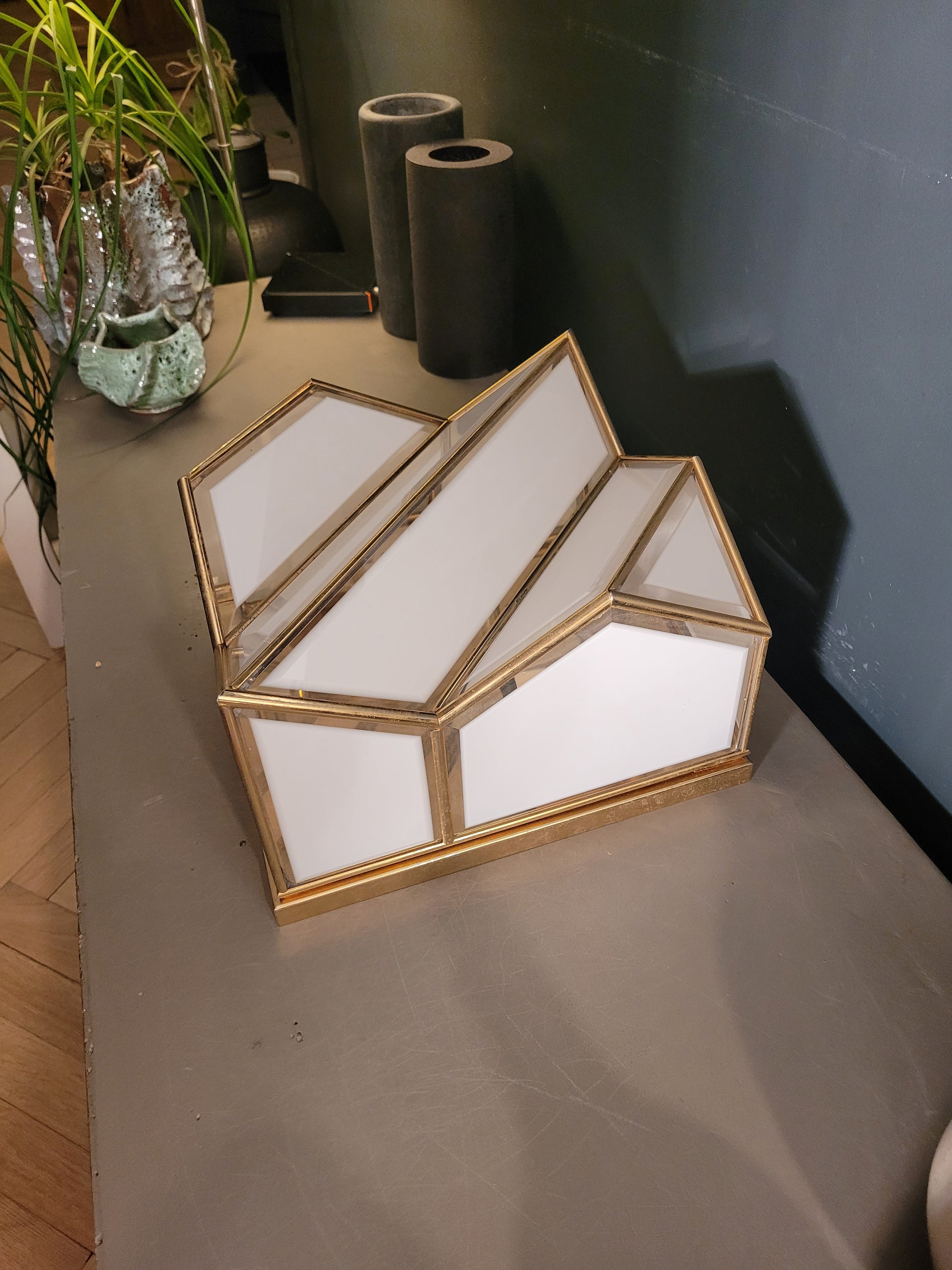 Chaque facette est en verre biseauté bicolore. La partie bisrautée est transparente et la partie centrale blanche.