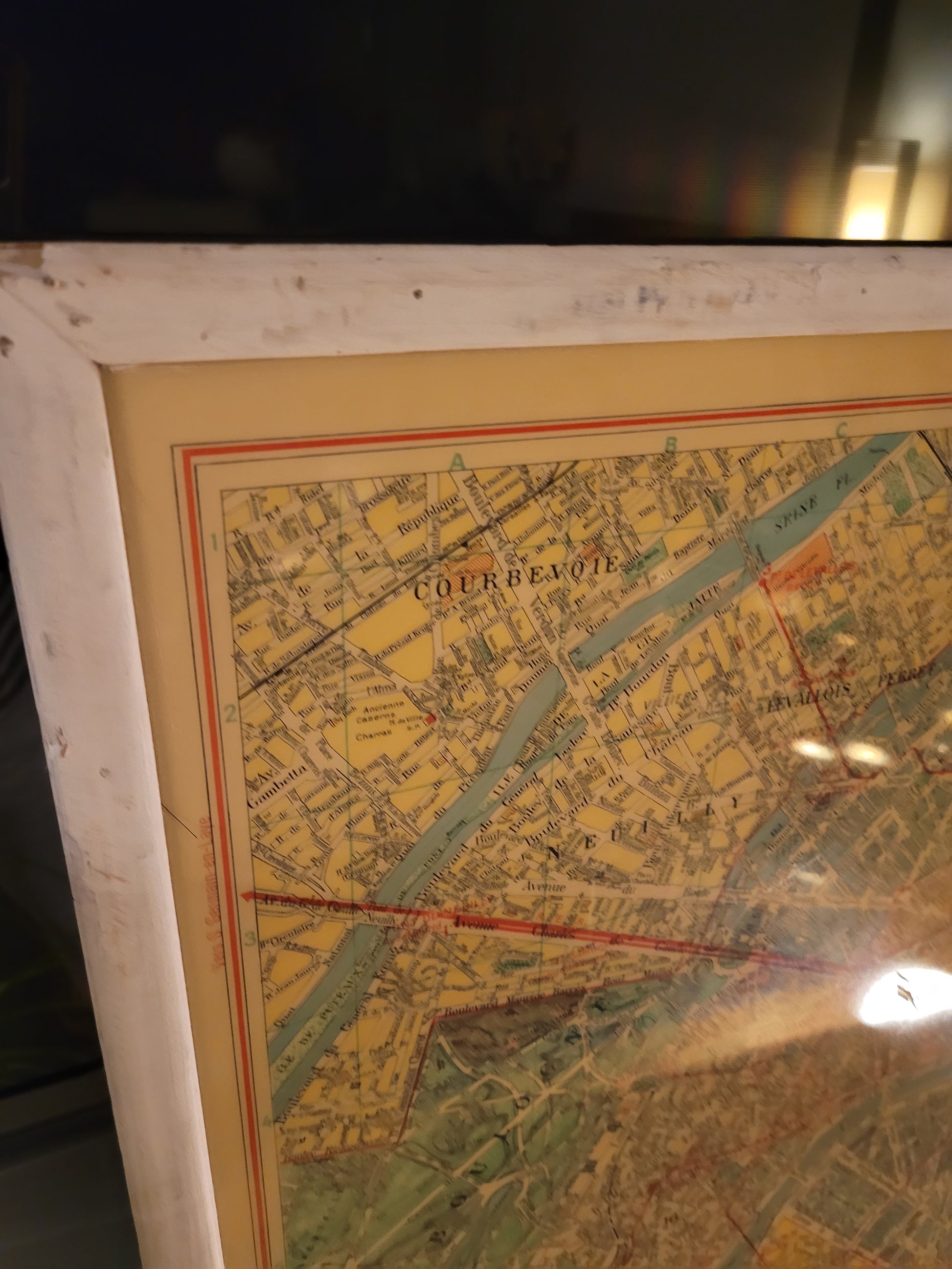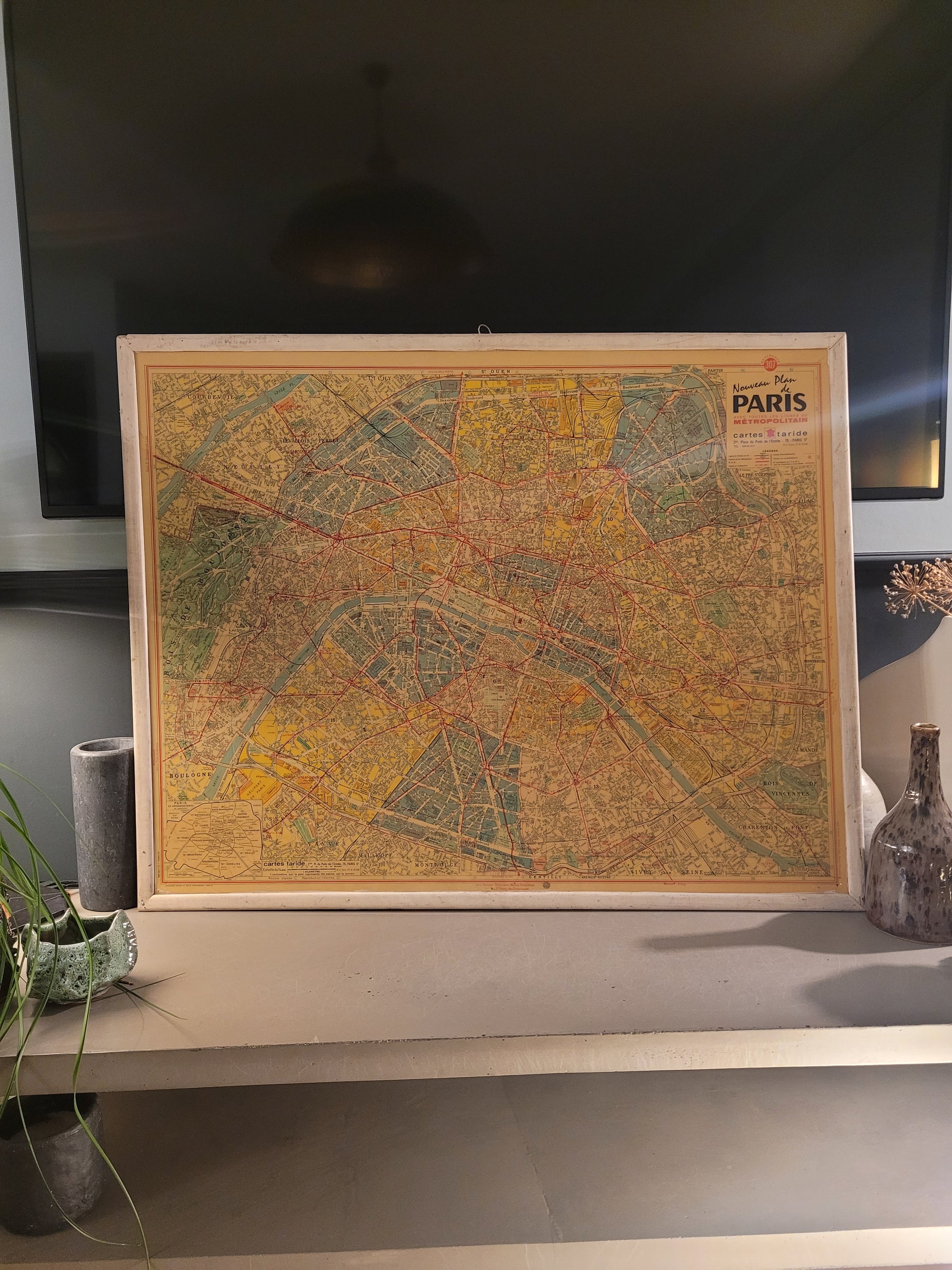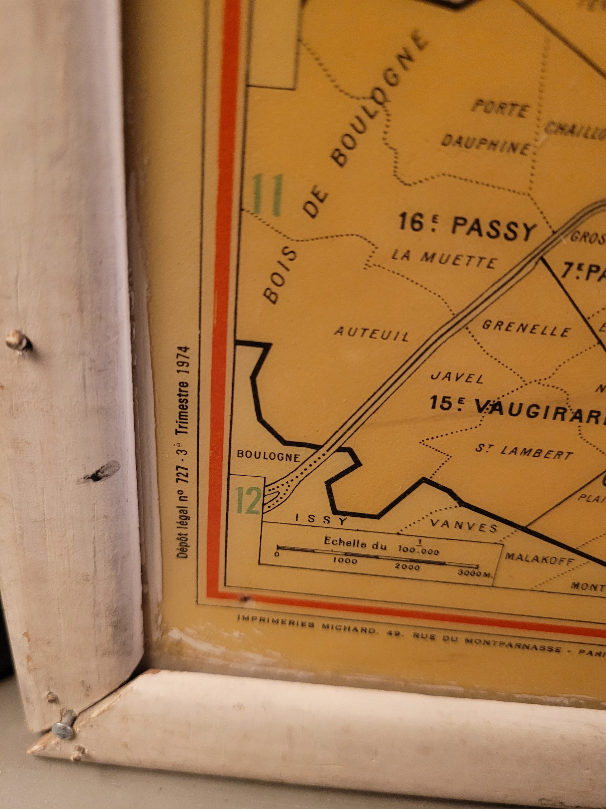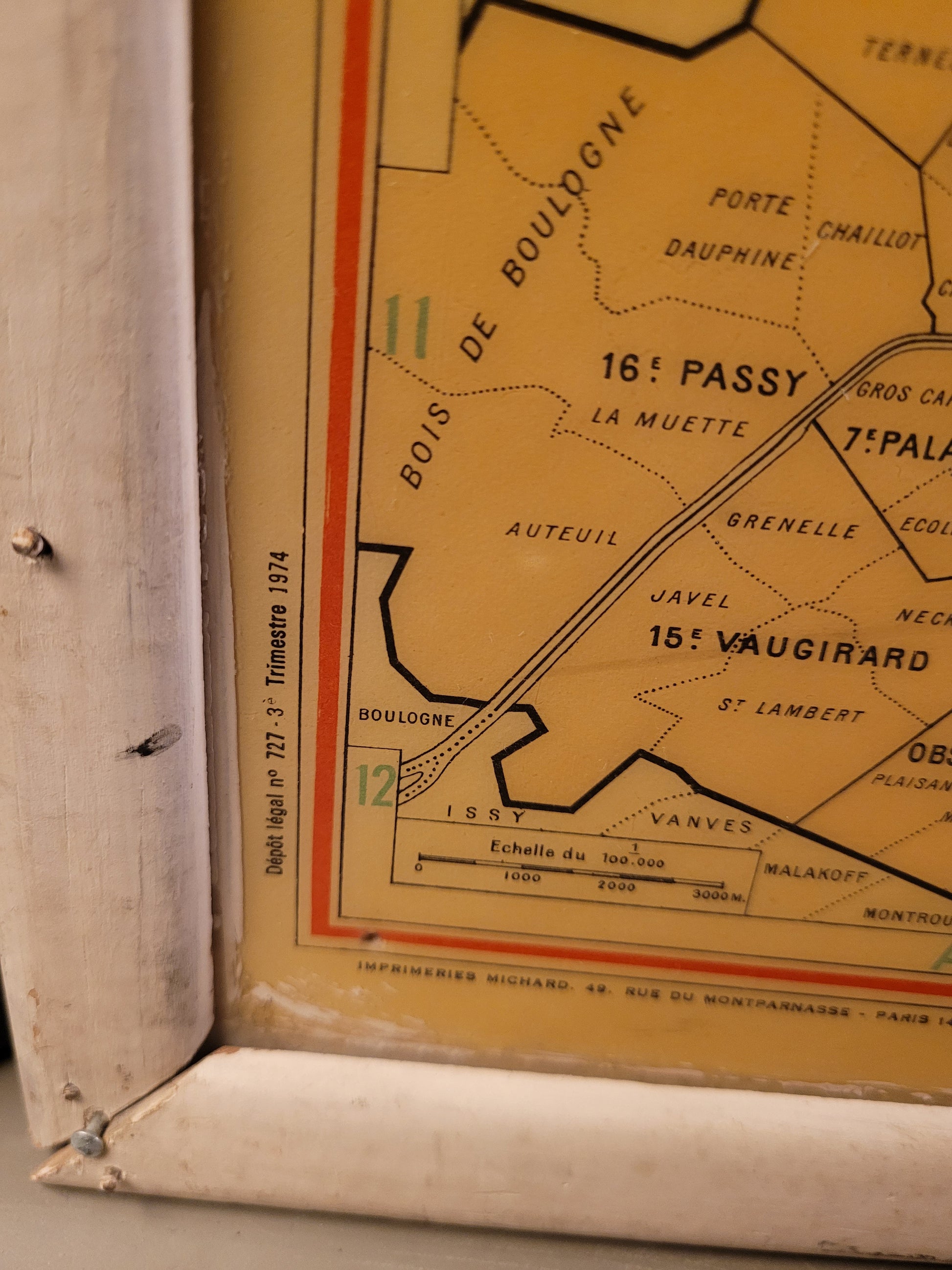 Un plan façon affiche ancienne, jauni par le temps, encadré il y a 5 décennies par de simples baguettes peintes en blanc. Il est dans son jus mais son état est parfaitement compatible avec un accrochage tel quel sans rénovation si on ne craint pas les traces du temps et les petites imperfections.