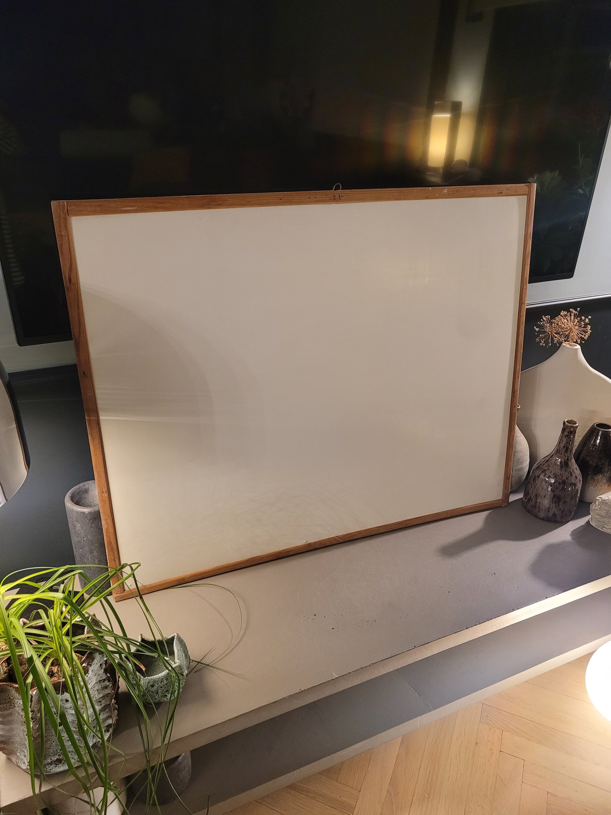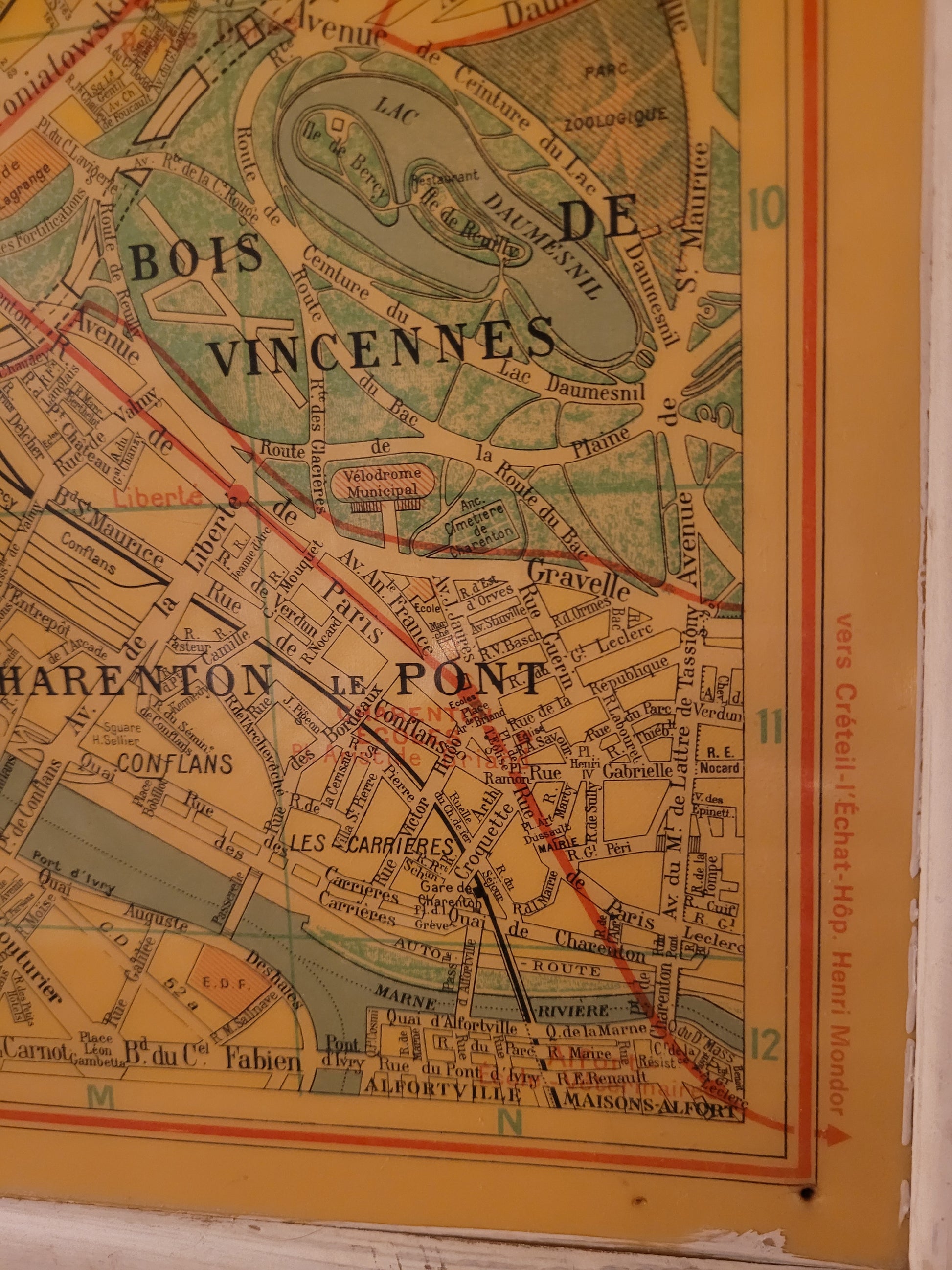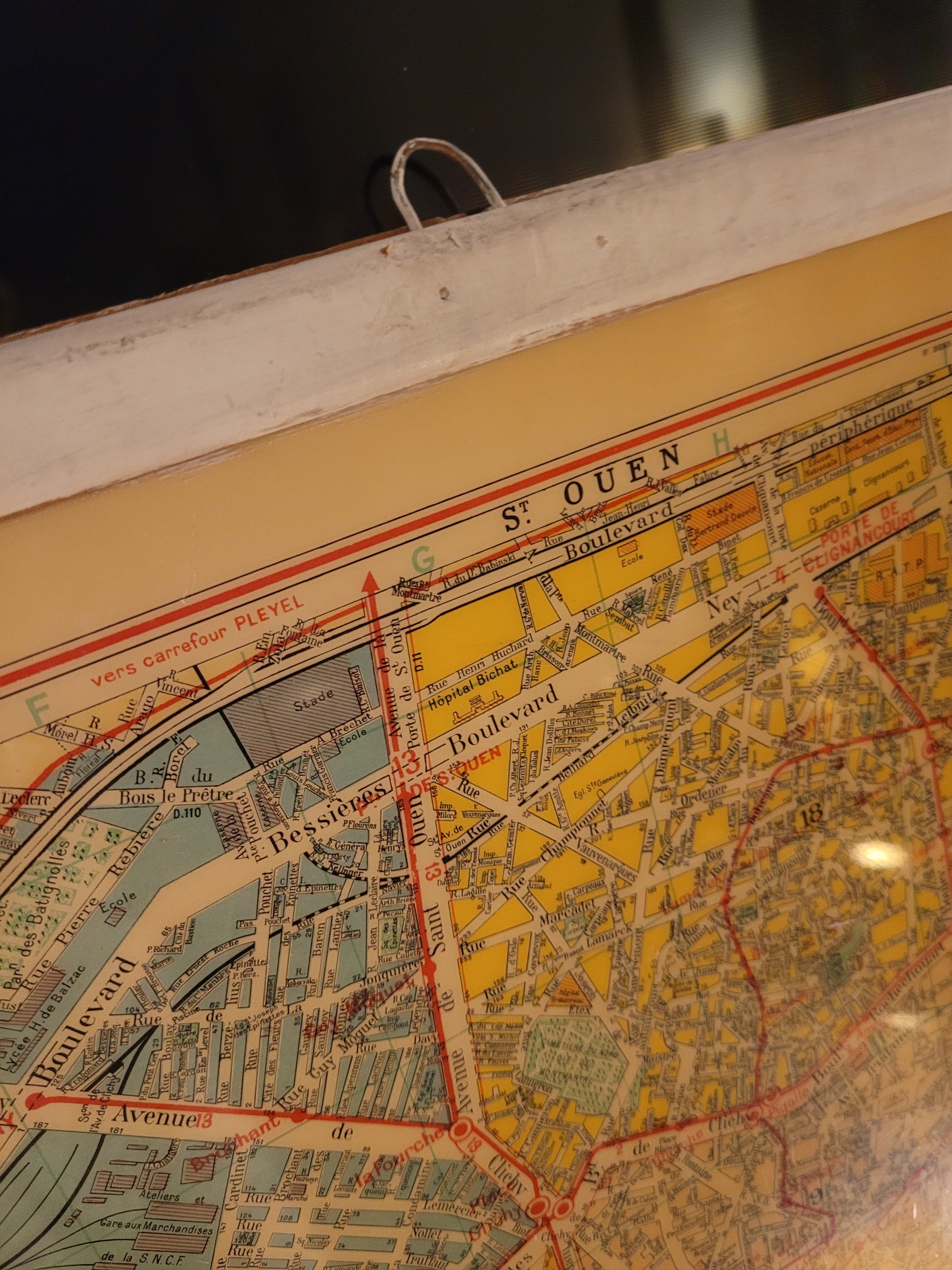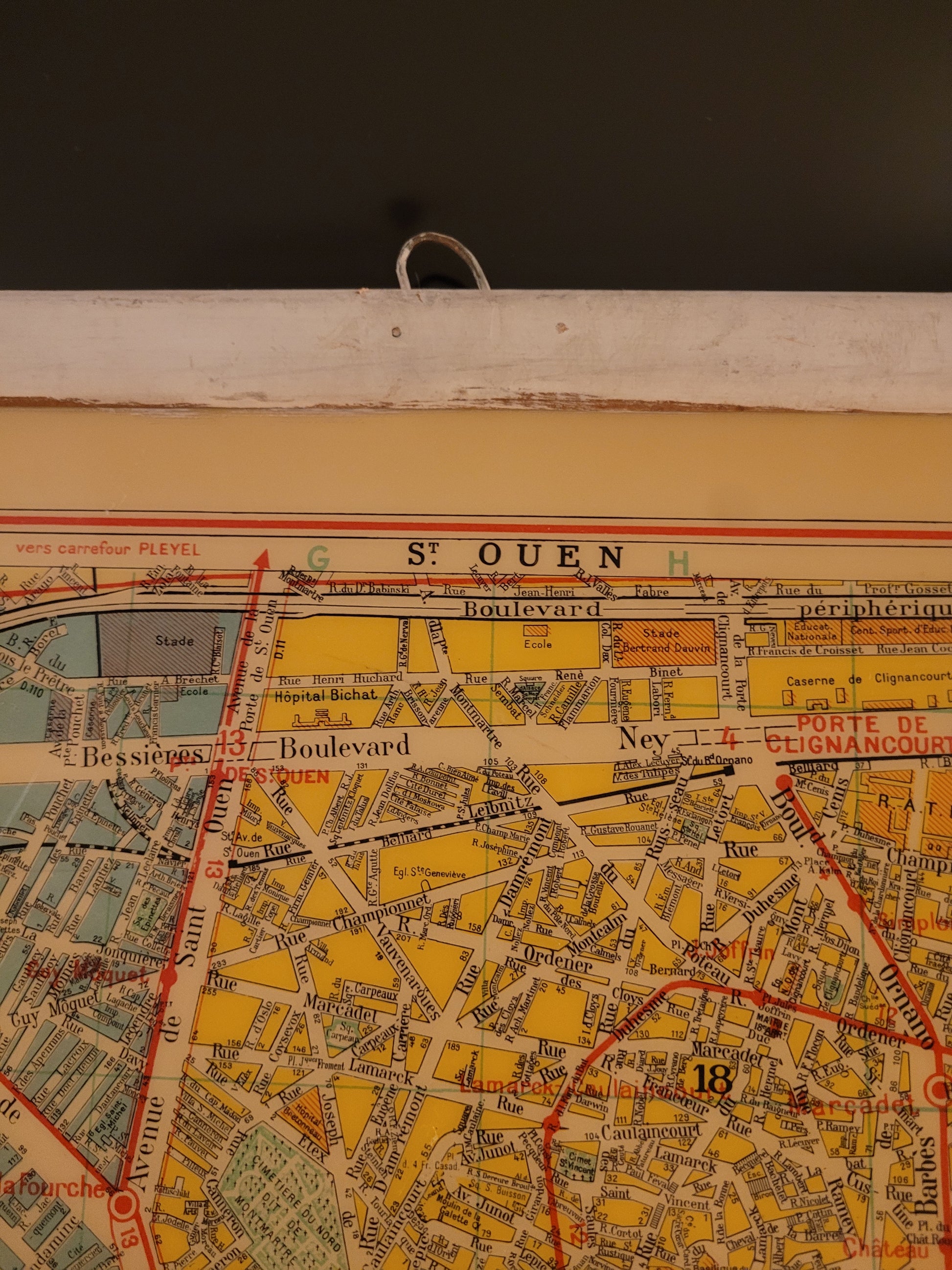 Un plan façon affiche ancienne, jauni par le temps, encadré il y a 5 décennies par de simples baguettes peintes en blanc. Il est dans son jus mais son état est parfaitement compatible avec un accrochage tel quel sans rénovation si on ne craint pas les traces du temps et les petites imperfections.