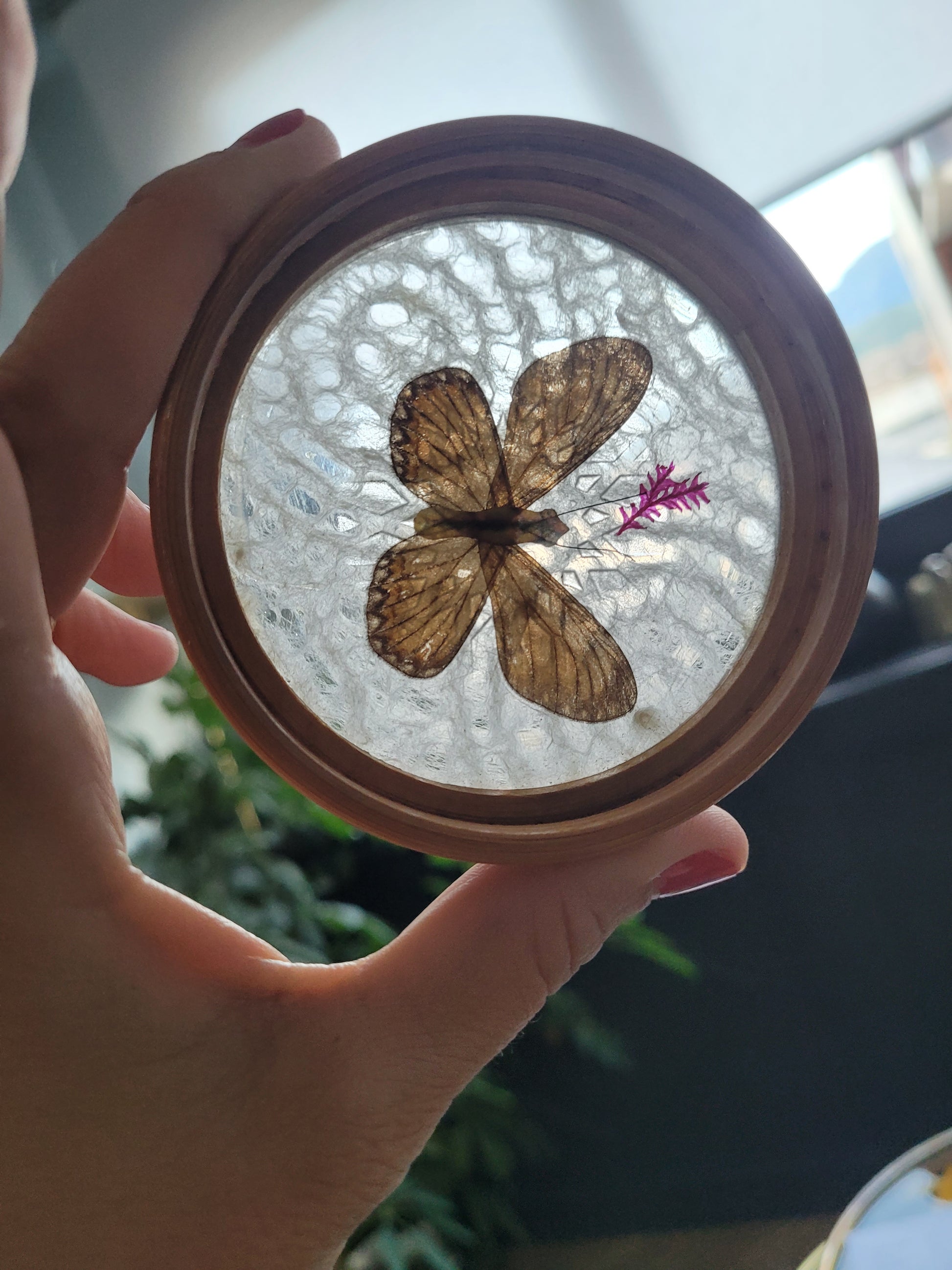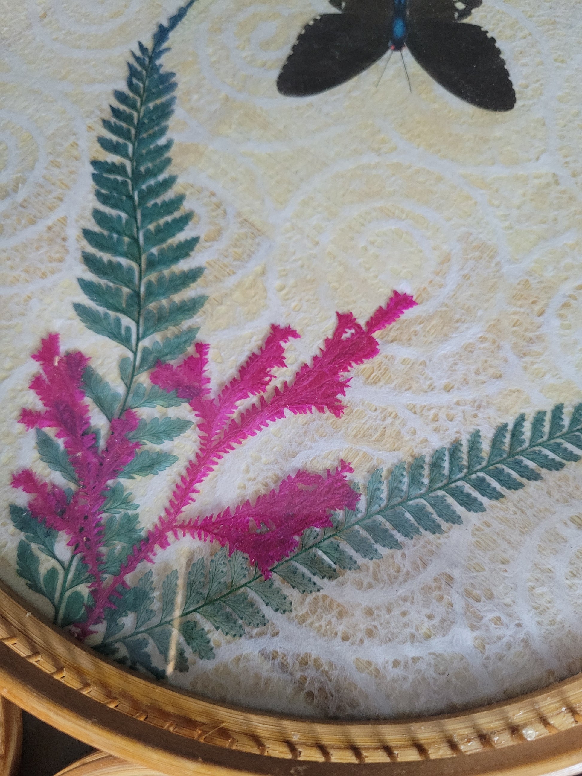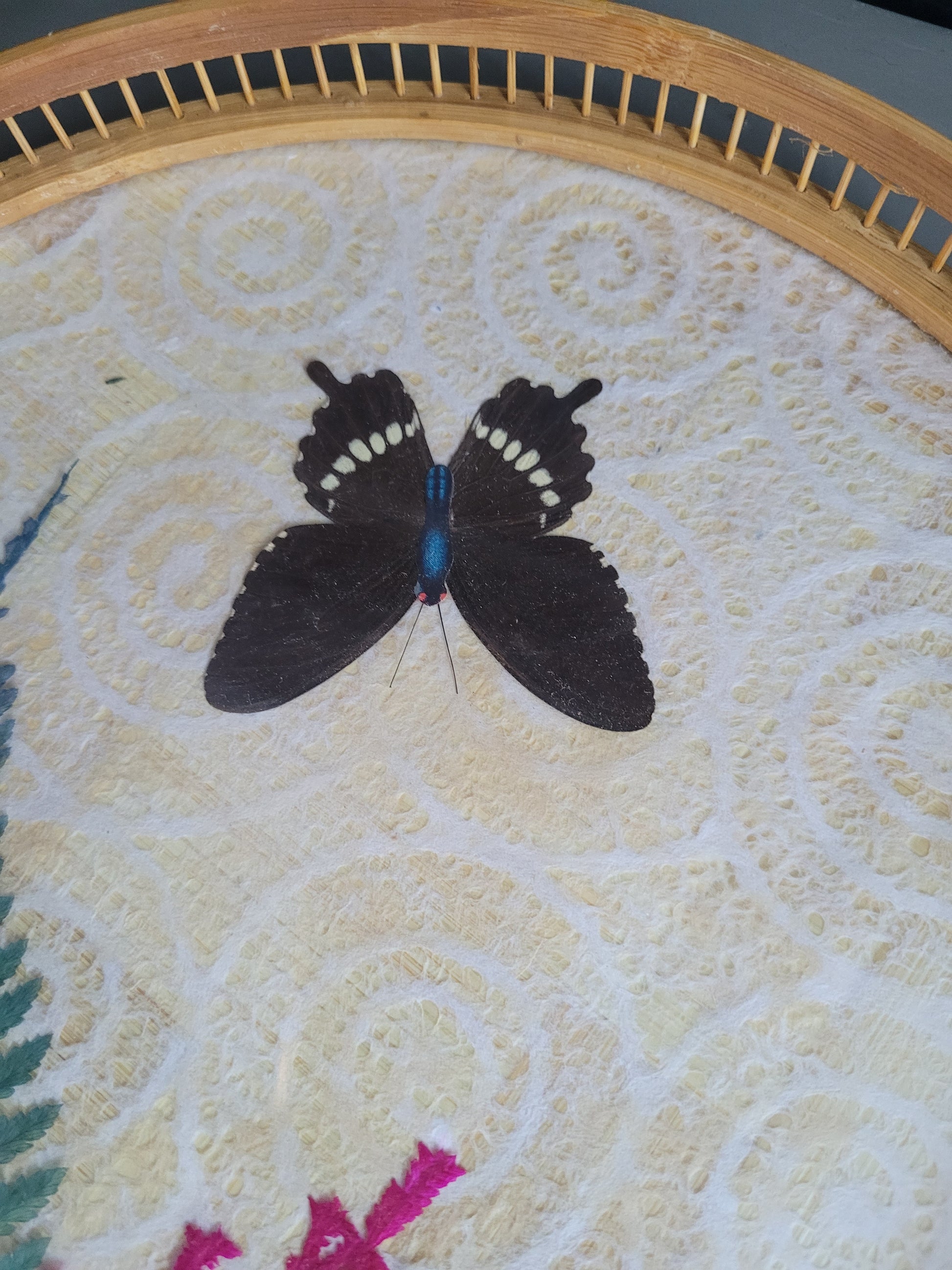 Magnifique ensemble plateau en bambou et ses 6 sous verres, avec décor inclusion papillons et plantes façon insectes naturalisés ou herbier, typique des années 70.
