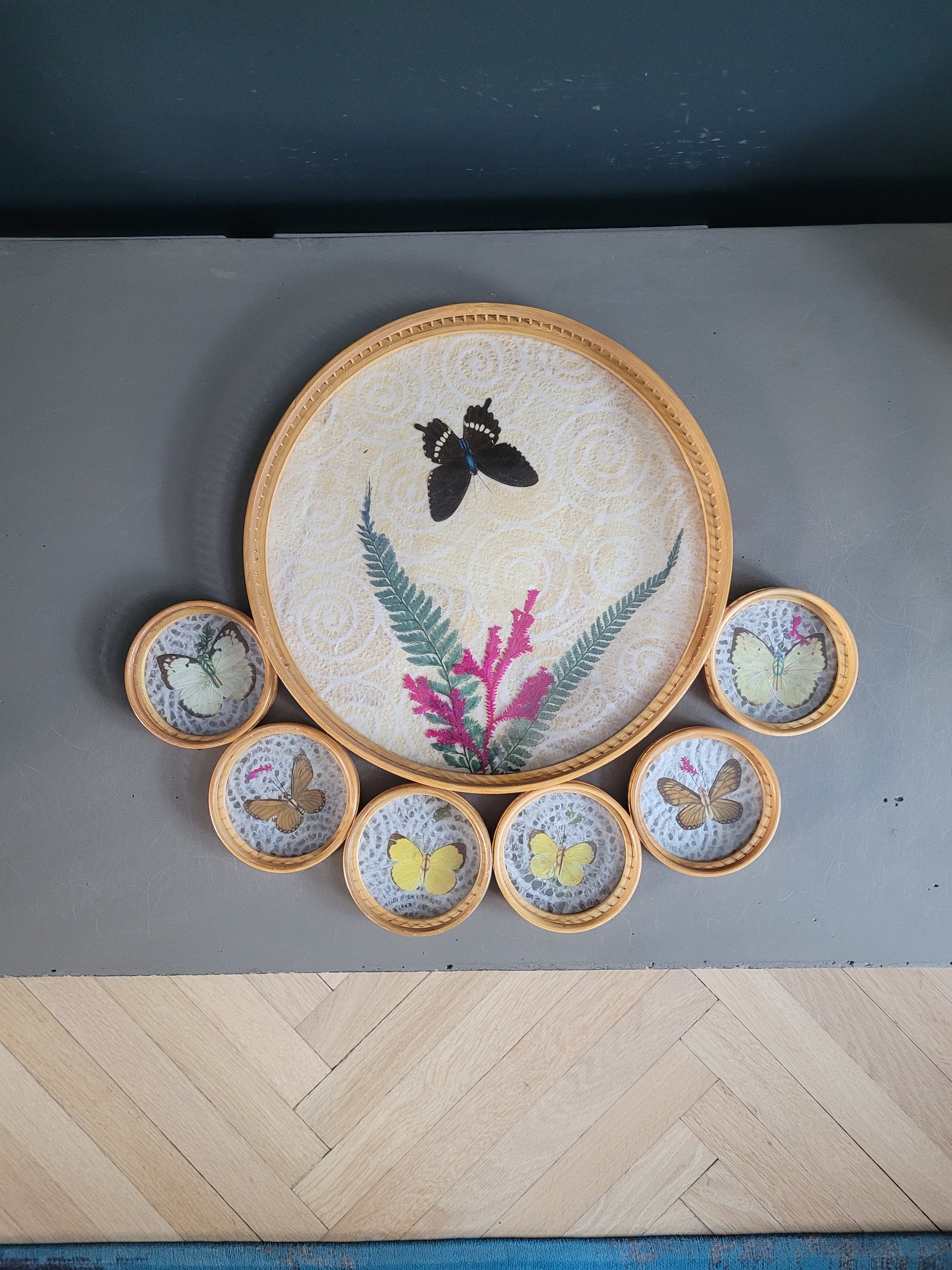 Plateau et 6 sous-verres papillons vintages en bambou - Ref 465