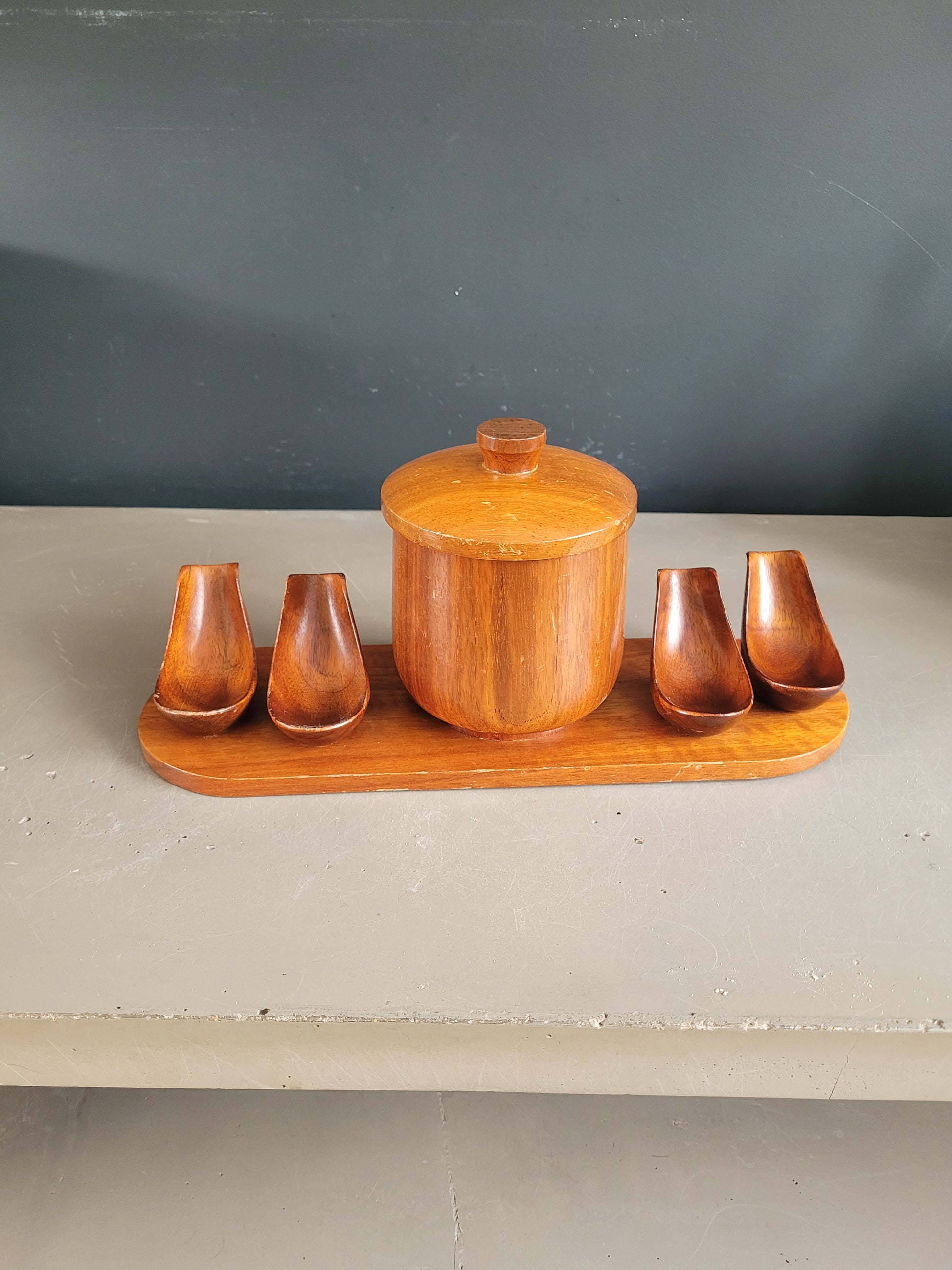 Magnifique ensemble en bois (teck?) comprenant 4 porte-pipes et un pot à tabac.