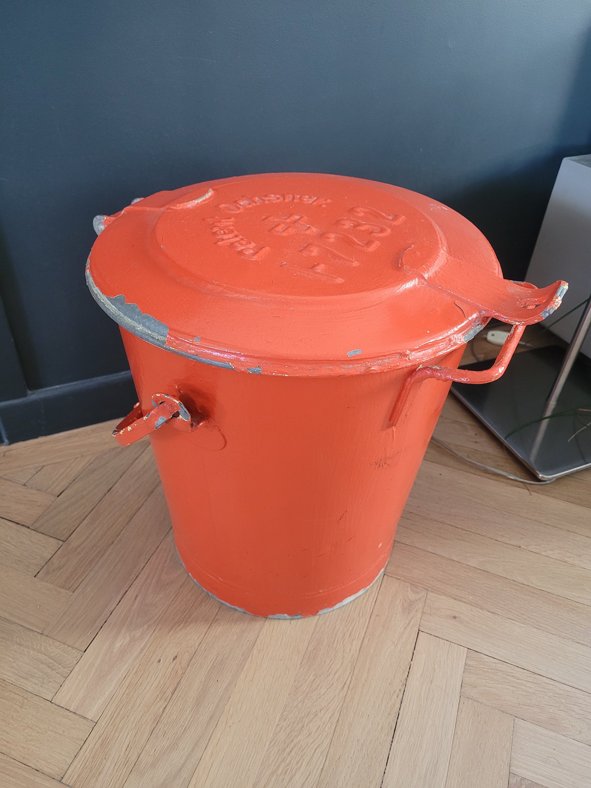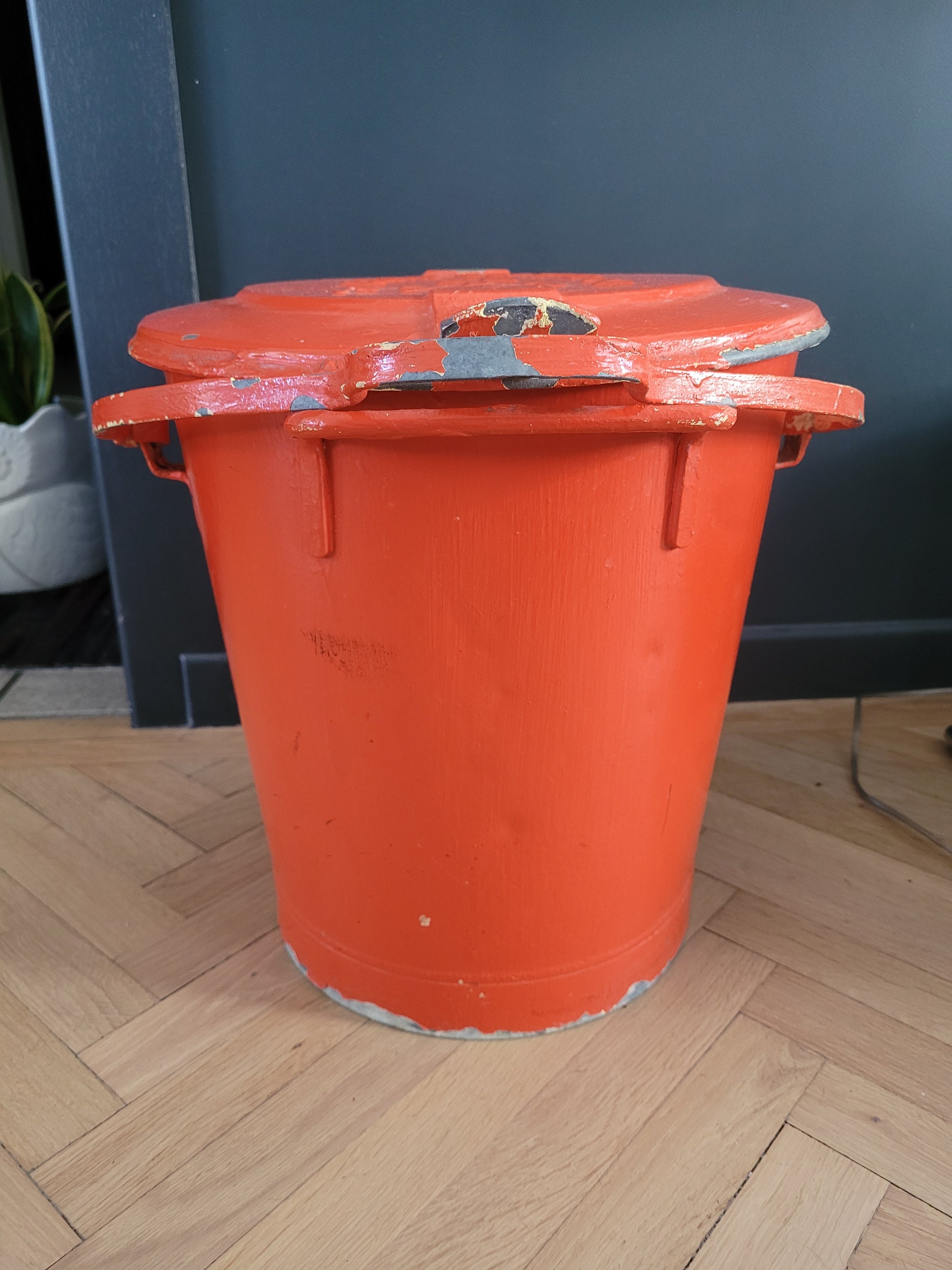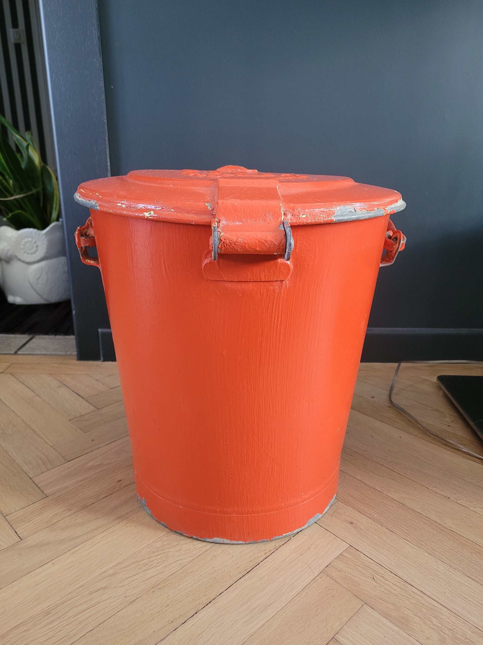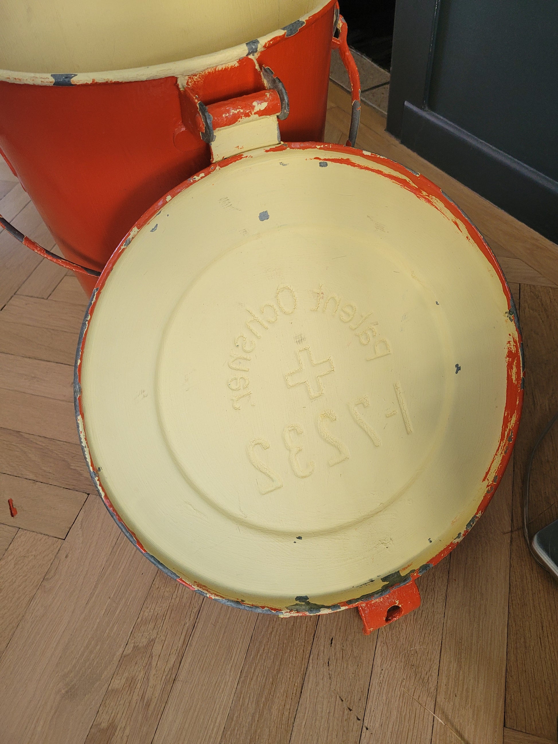 Magnifique poubelle vintage, en métal inoxydable peint en orange (et on distingue une première couche jaune au dessous), de la marque Suisse Ochsner, modèle I - 7232