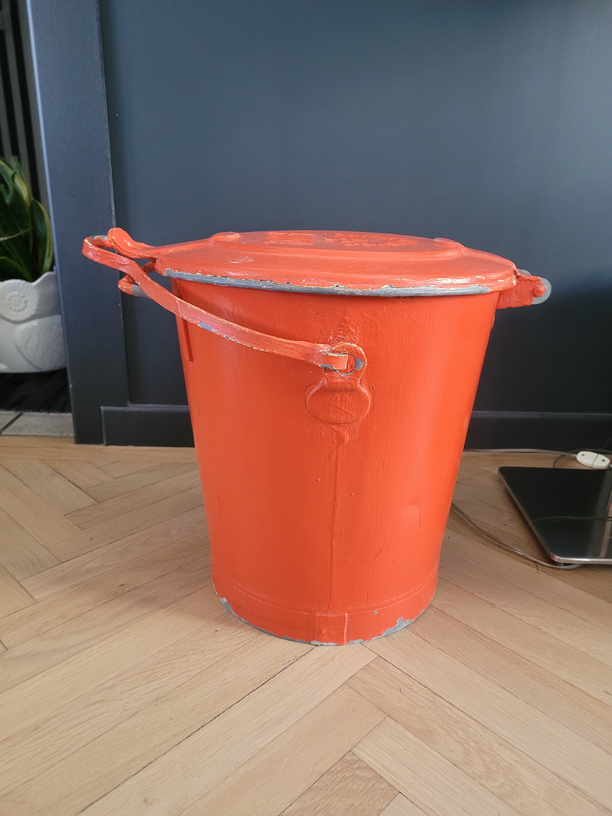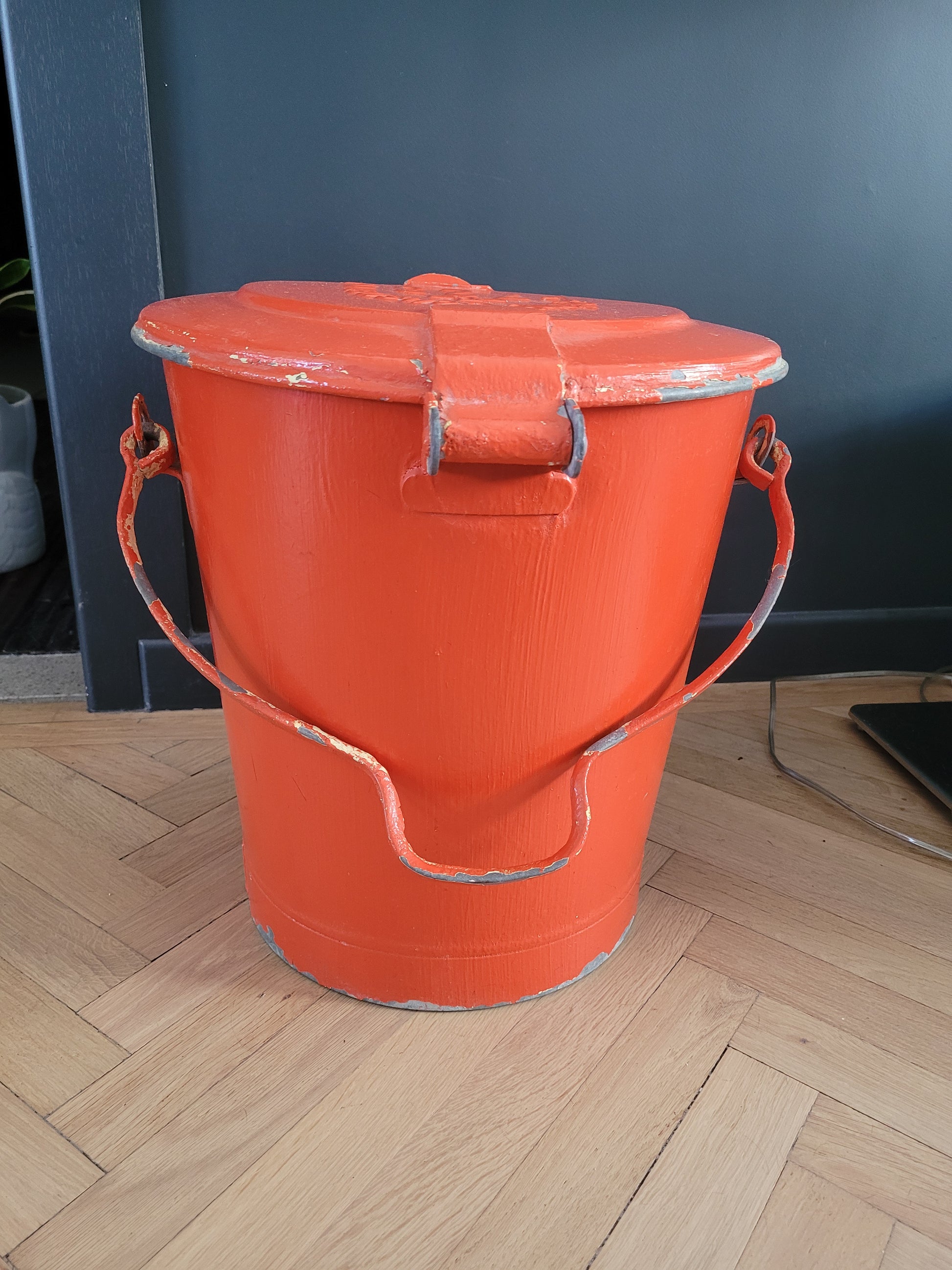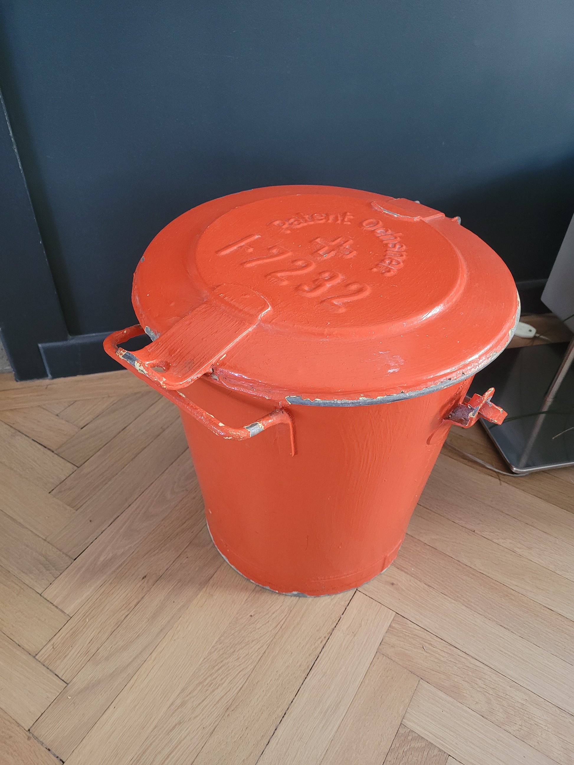 Magnifique poubelle vintage, en métal inoxydable peint en orange (et on distingue une première couche jaune au dessous), de la marque Suisse Ochsner, modèle I - 7232