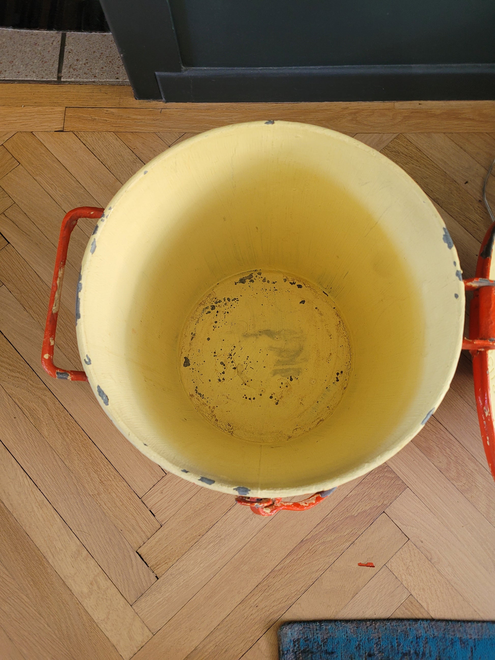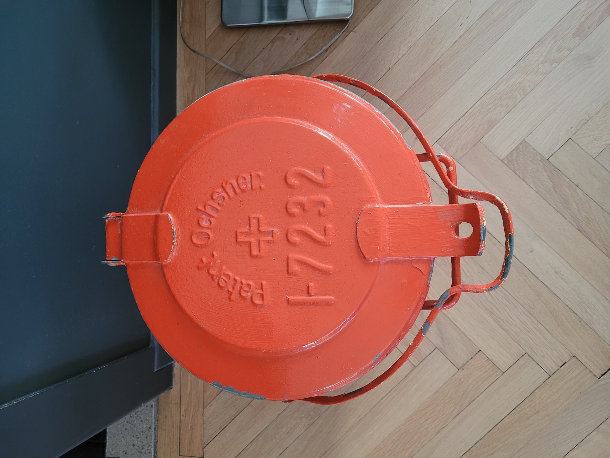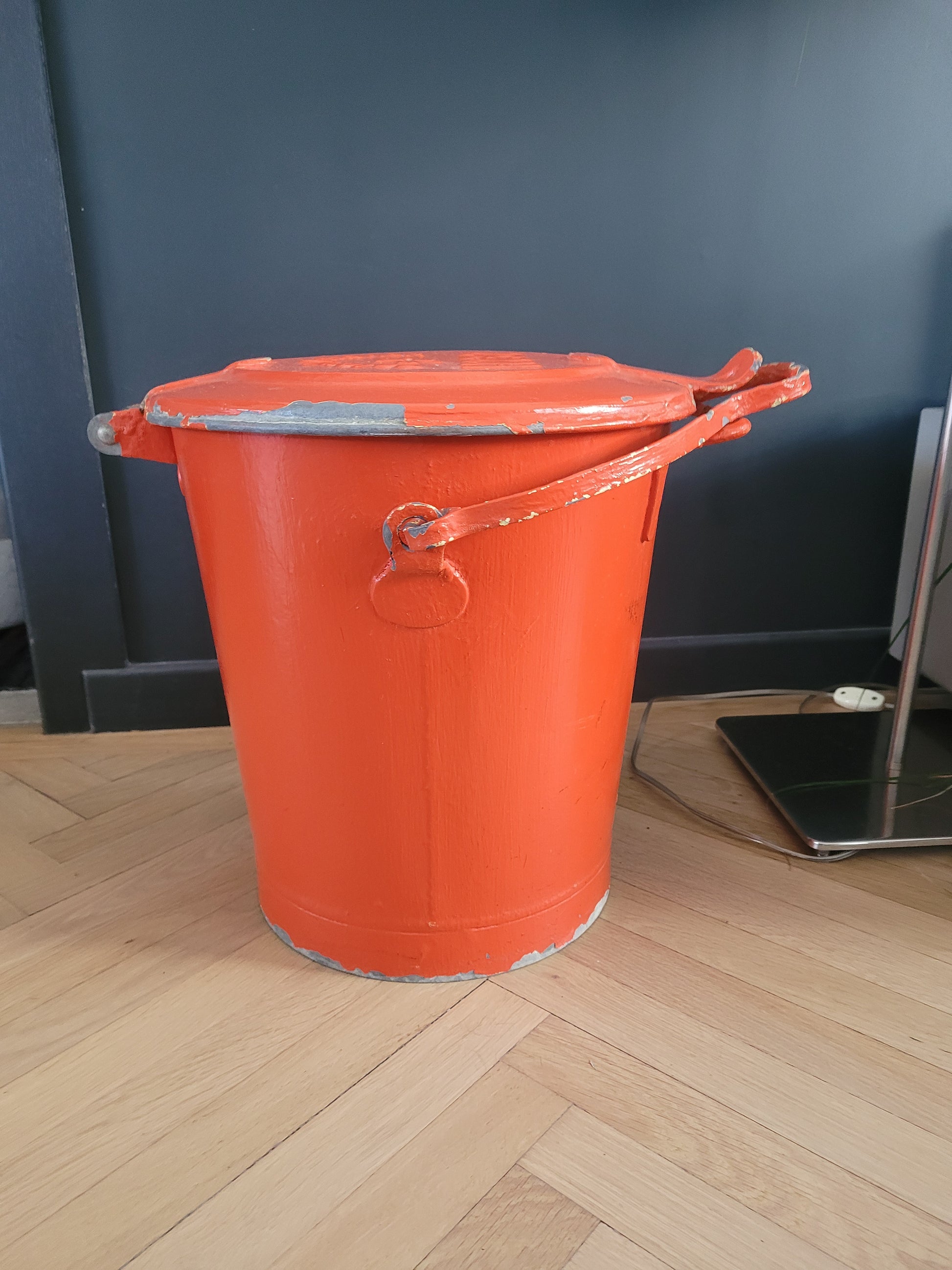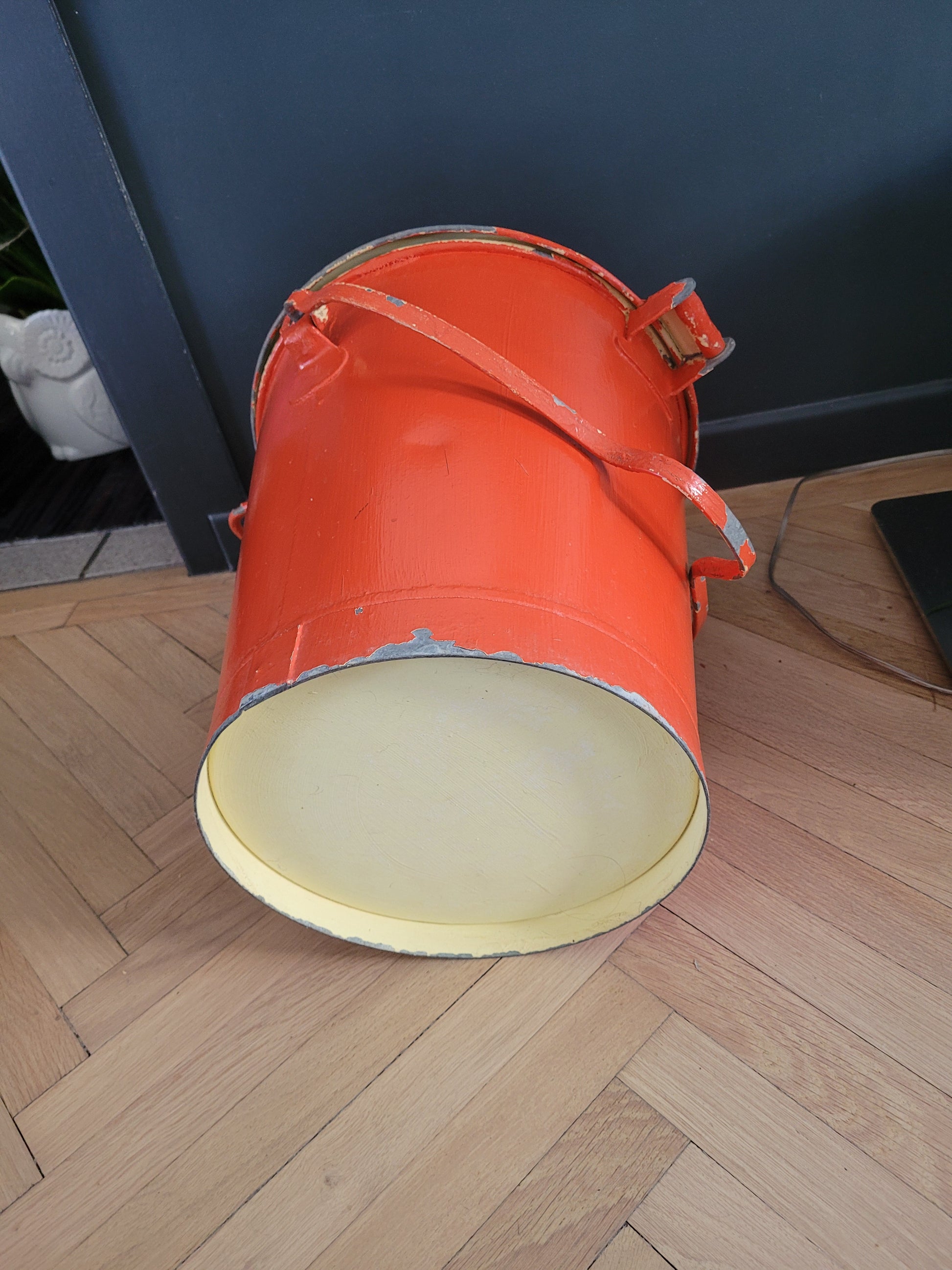 Magnifique poubelle vintage, en métal inoxydable peint en orange (et on distingue une première couche jaune au dessous), de la marque Suisse Ochsner, modèle I - 7232