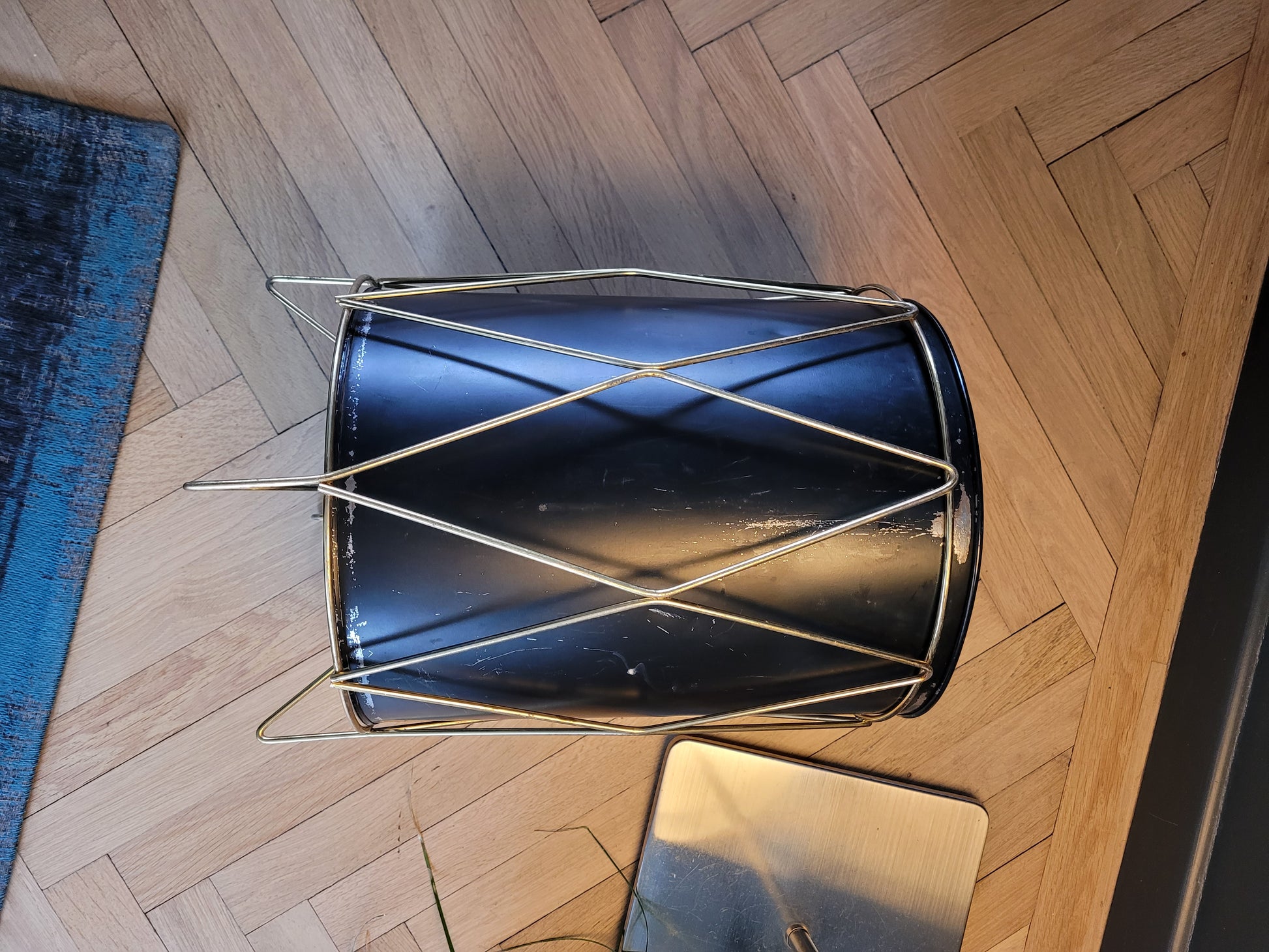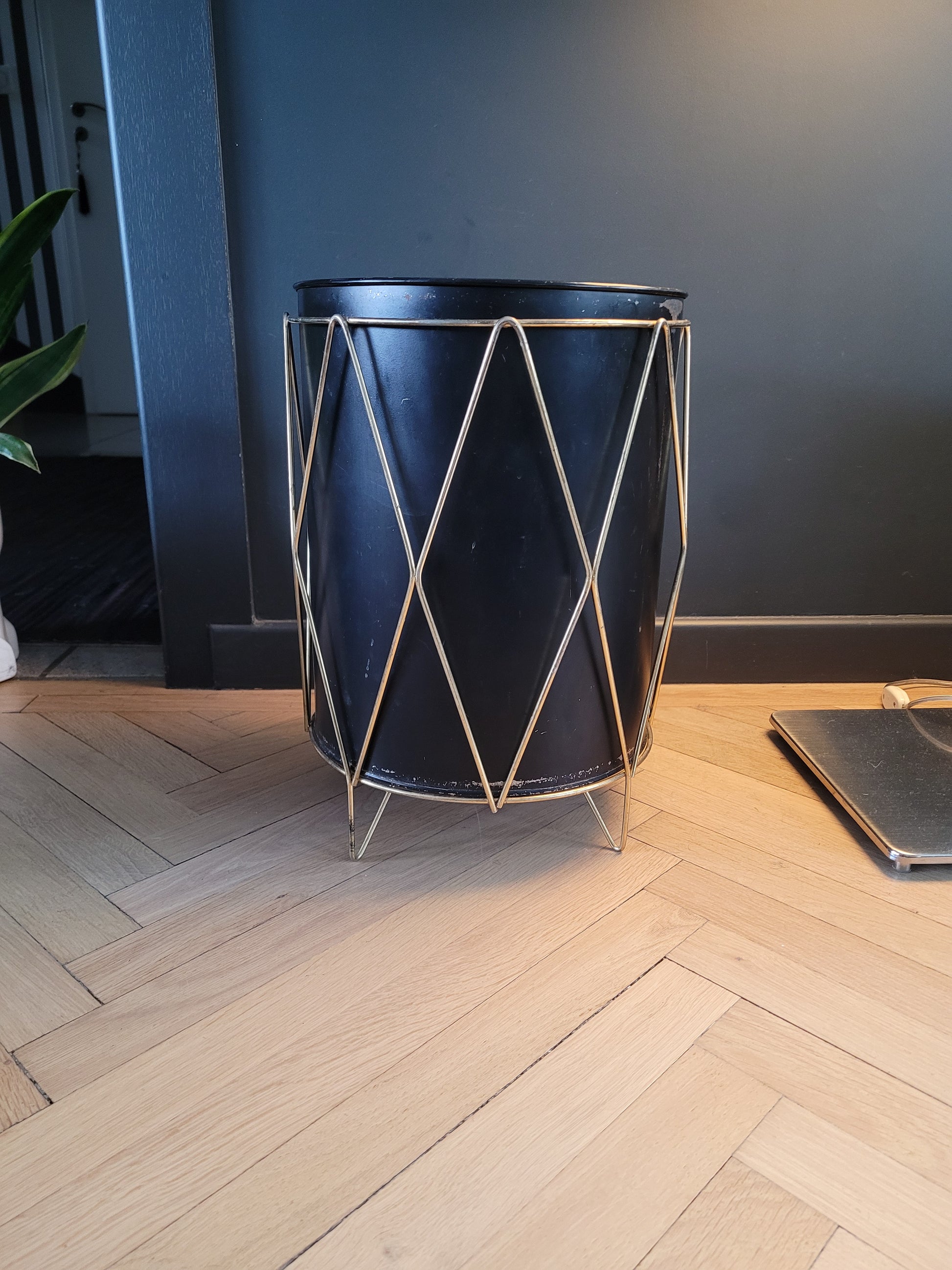 Superbe corbeille en papier en tôle laquée noire et structure en fil laiton, des années 70.