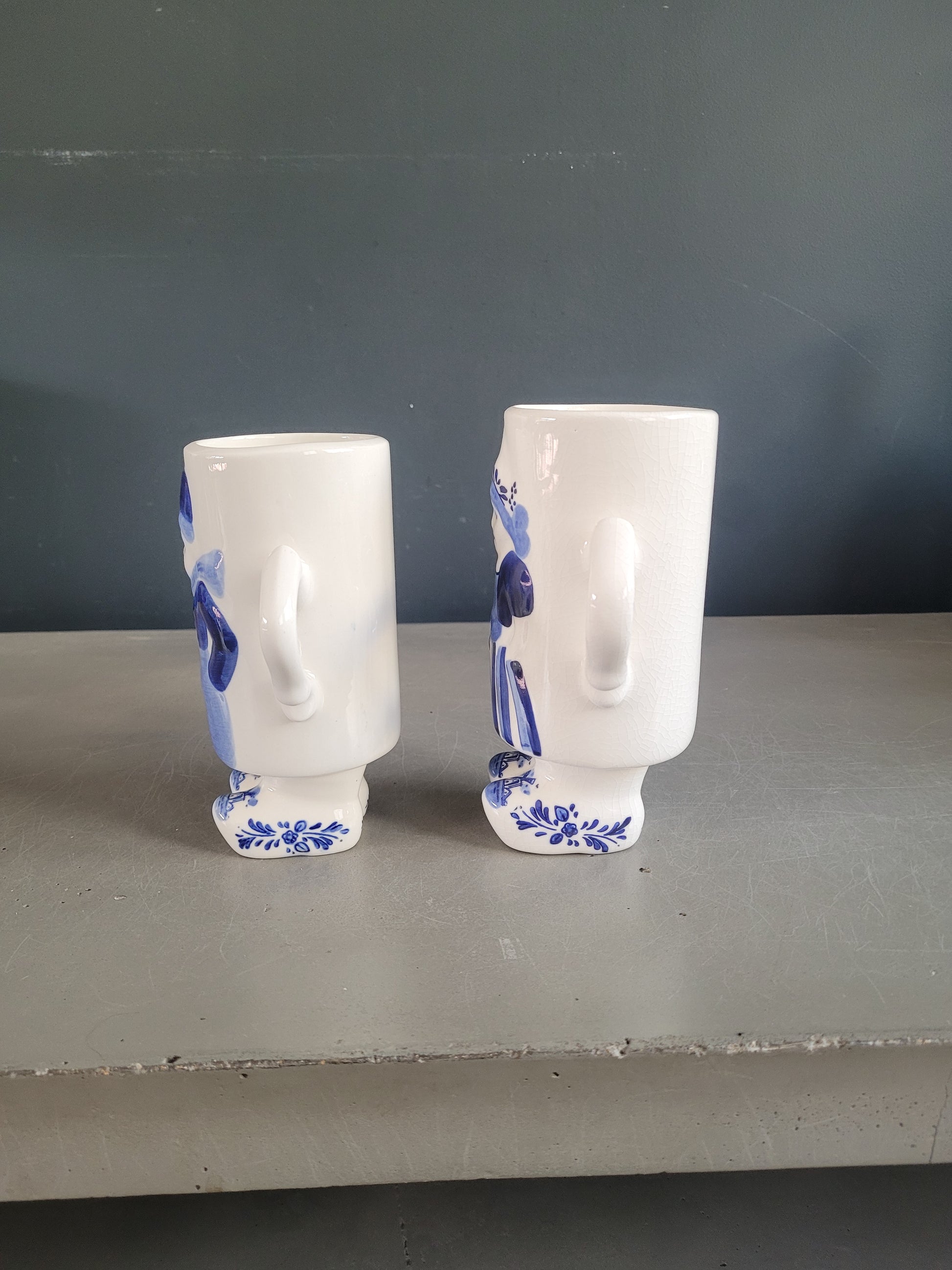 Paire de mugs néerlandais en céramique de Delft. Peints à la main dans le bleu de cobalt typique de Delft, signes Delft Blaw et numérotés (045084 et 045085) ils figurent un garçon et une fille en tenue traditionnelle, posés sur leurs sabots décorés de moulins.