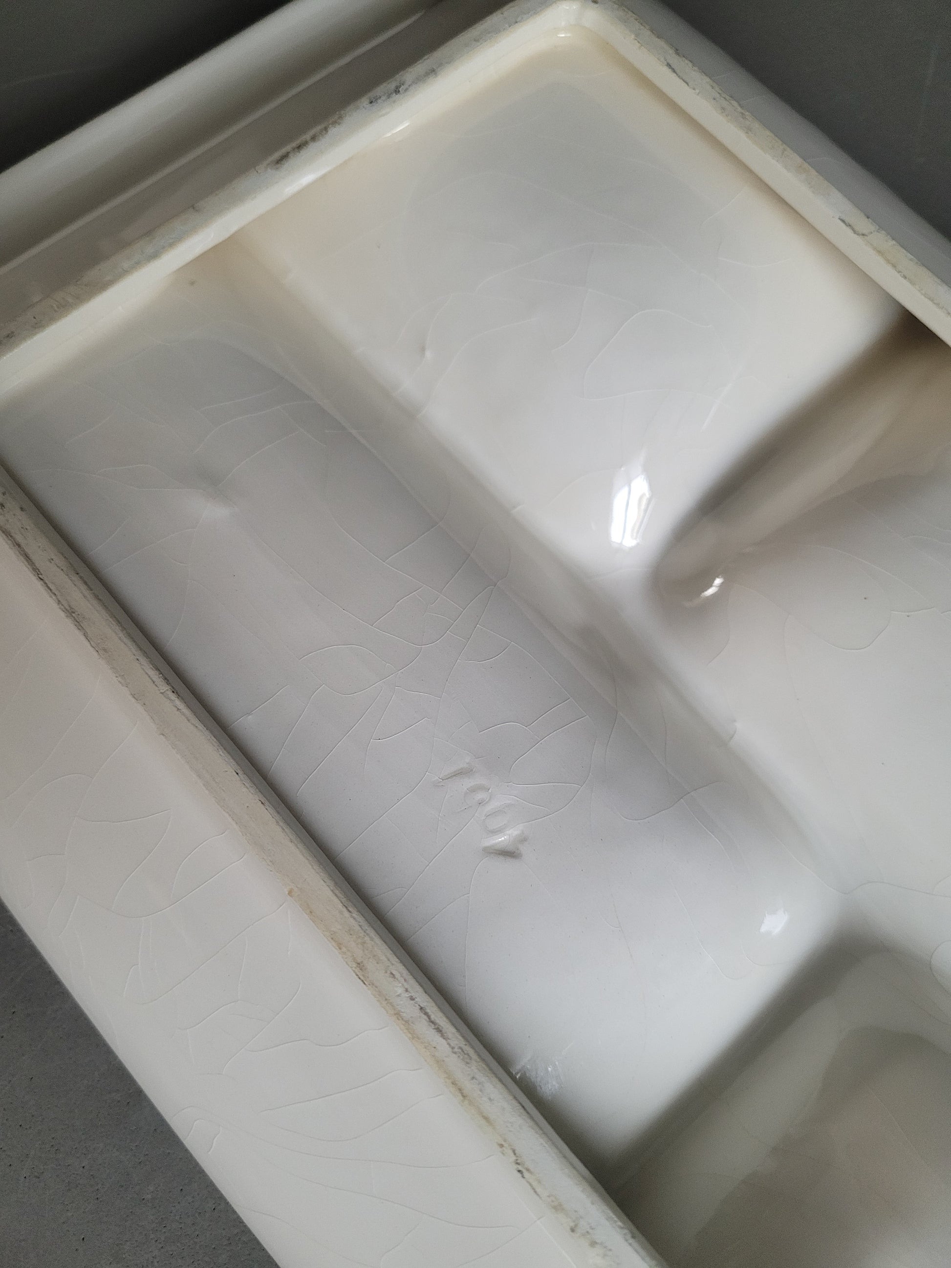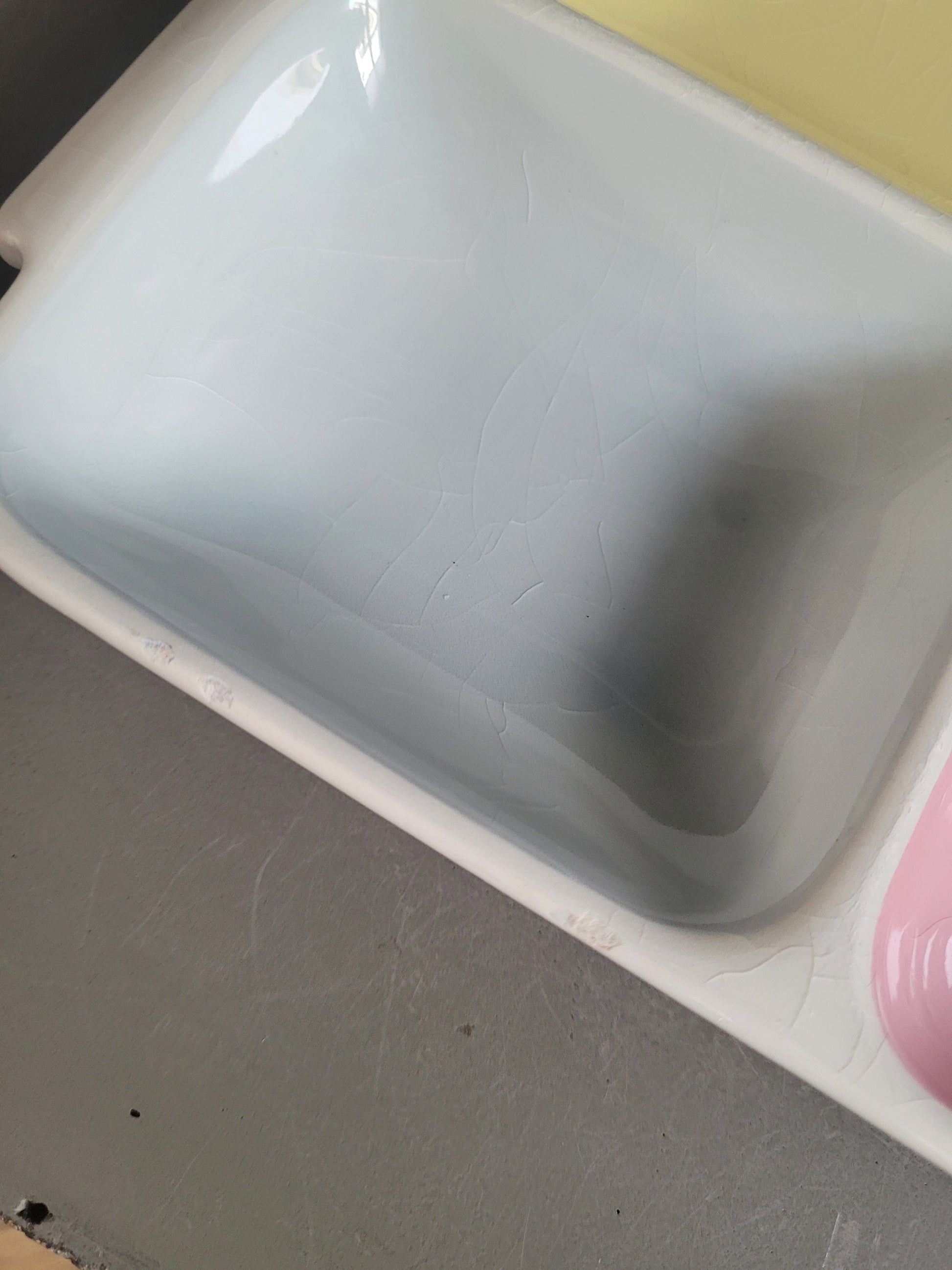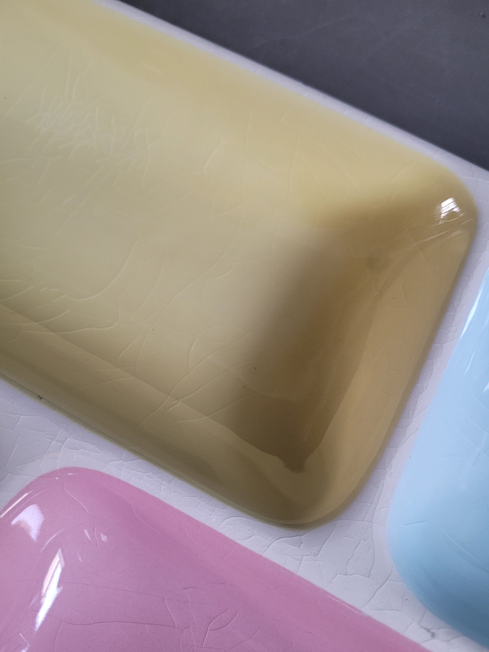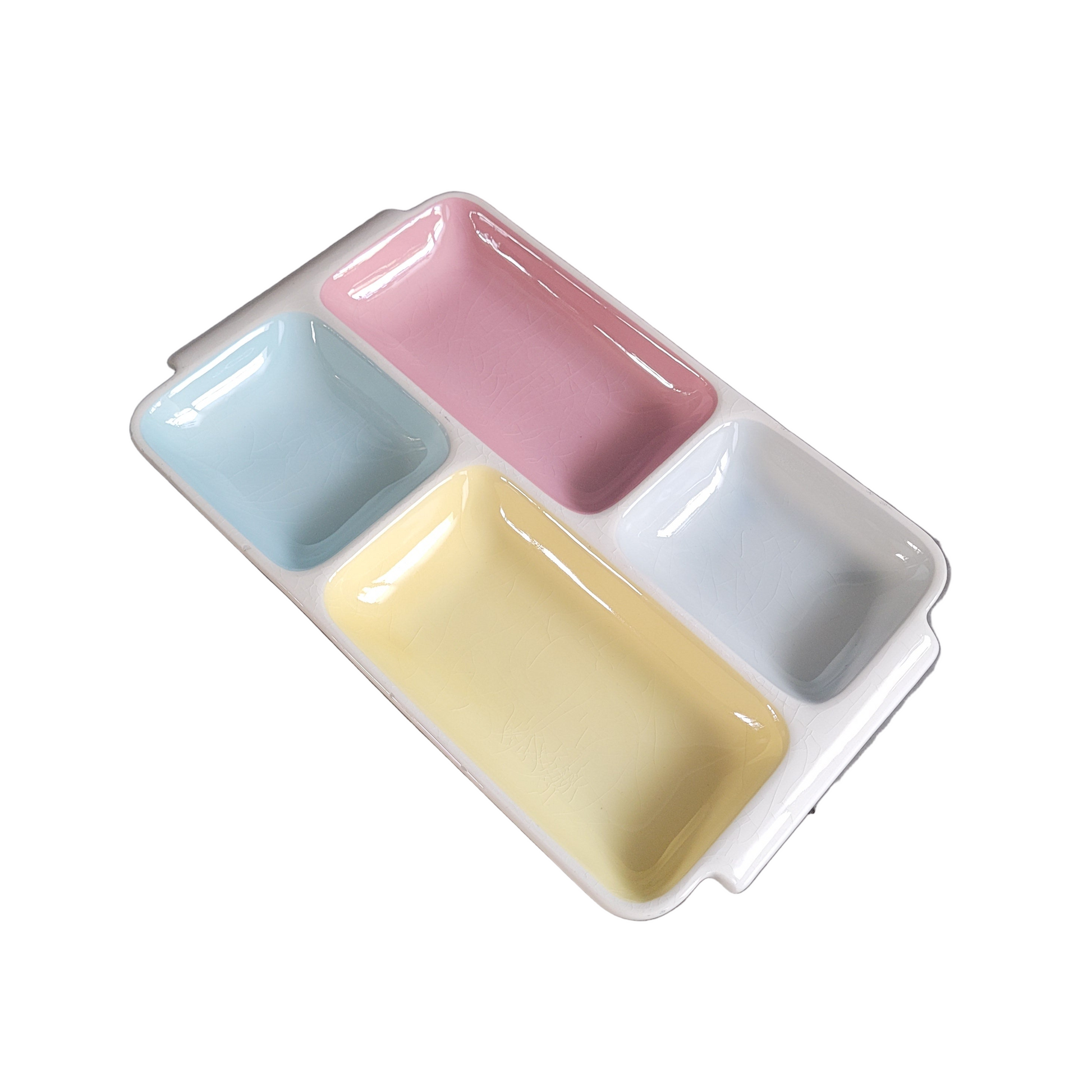 C'est l'émaillage des compartiments qui fait toute son originalité, dans des teintes pastel, rose tendre, bleu ciel, jaune doux et gris perle, il change des couleurs franches utilisée habituellement à cette période.