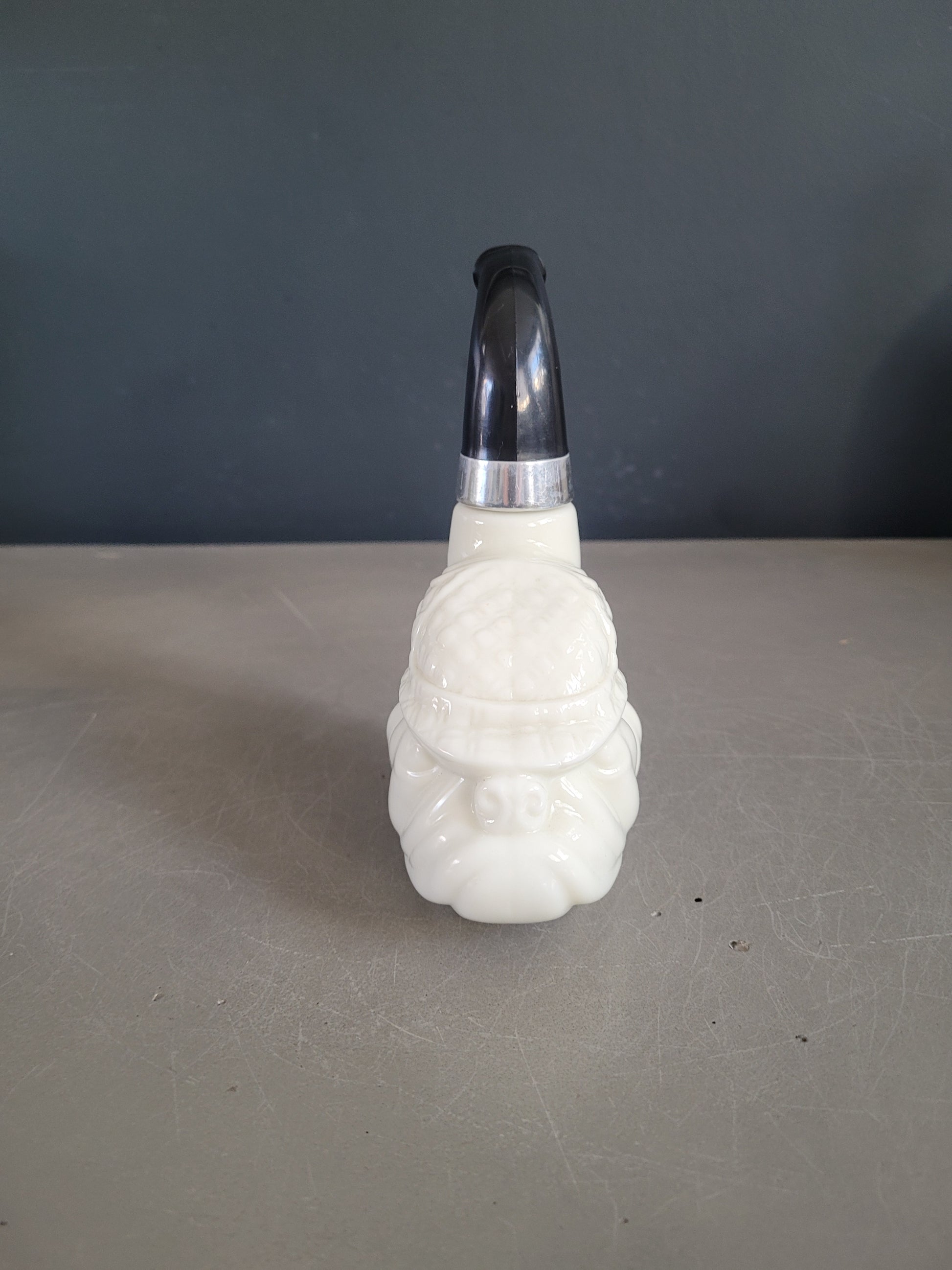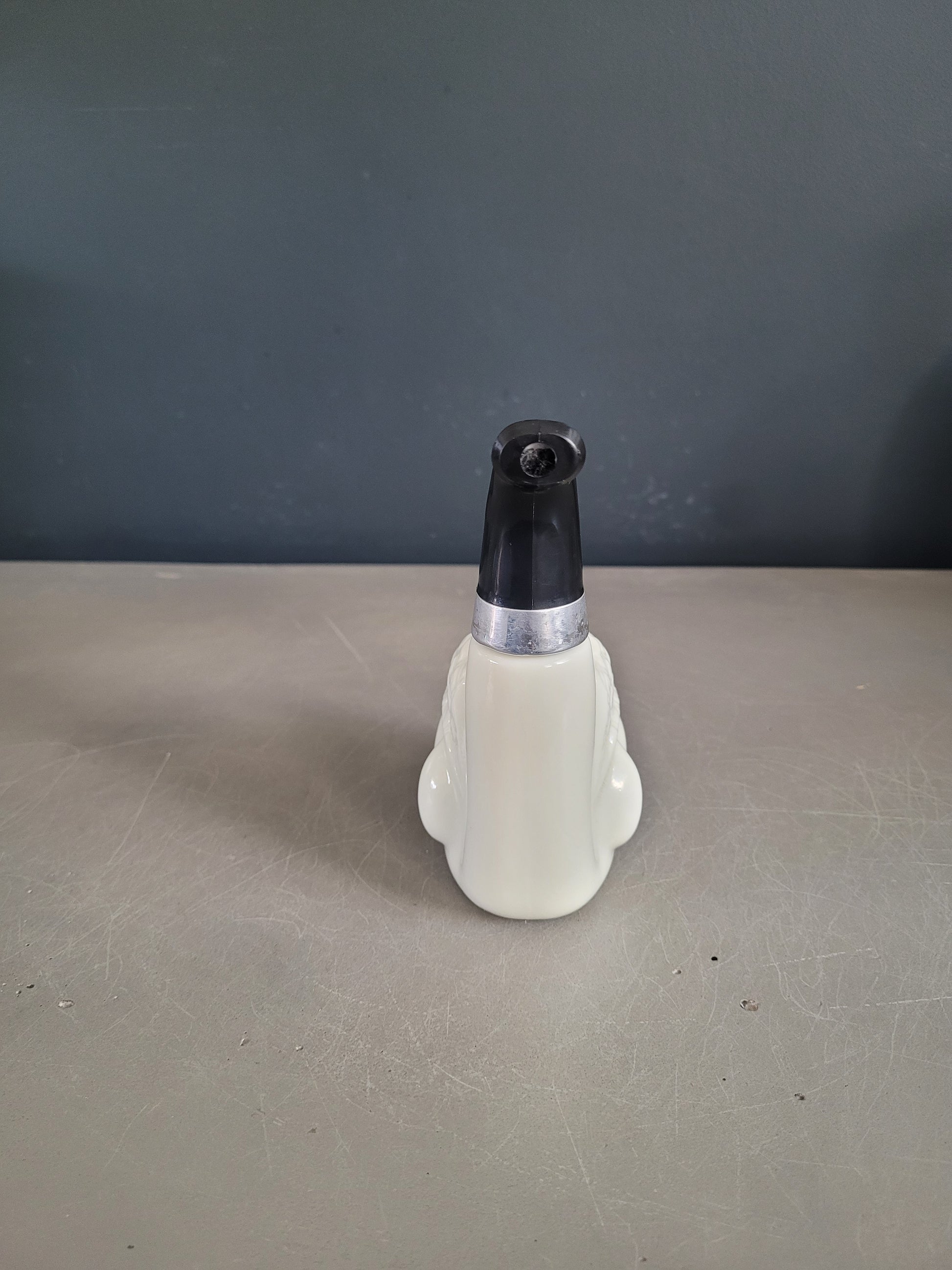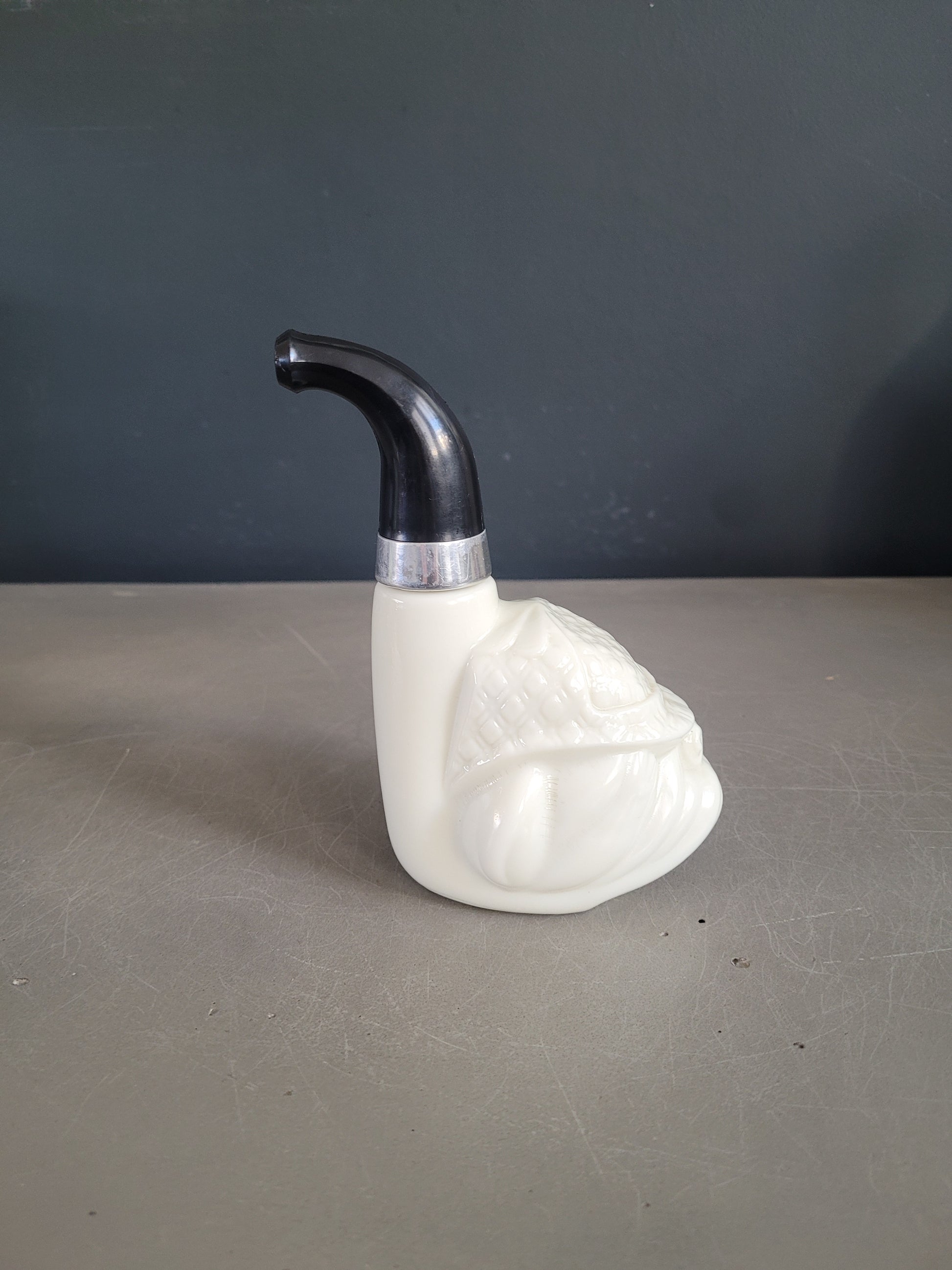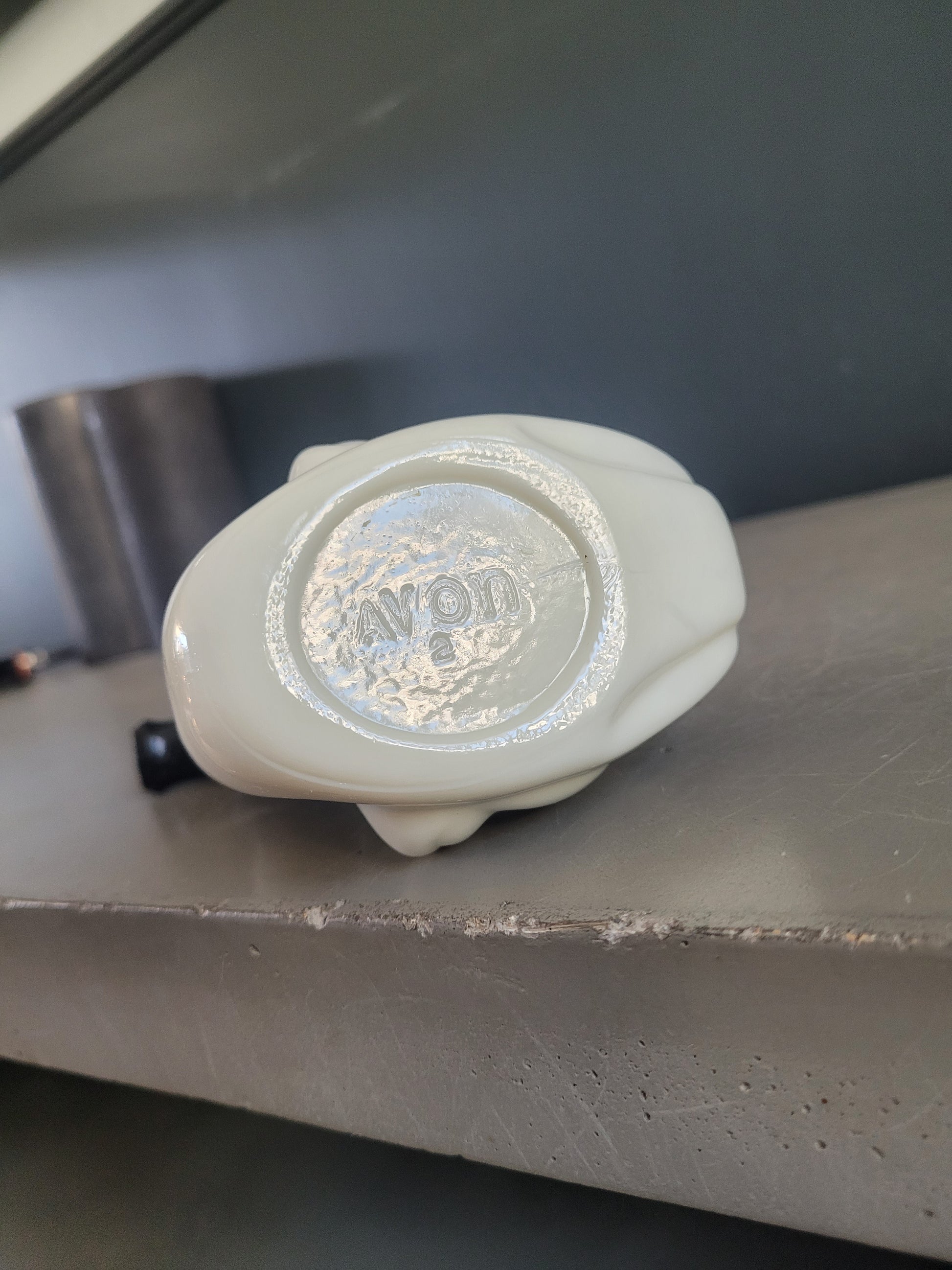 Très original ce flacon d'after-shave (après-rasage) de la marque Avon, en opaline couleur crème et embout plastique noir.