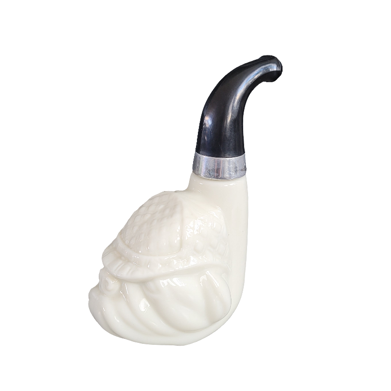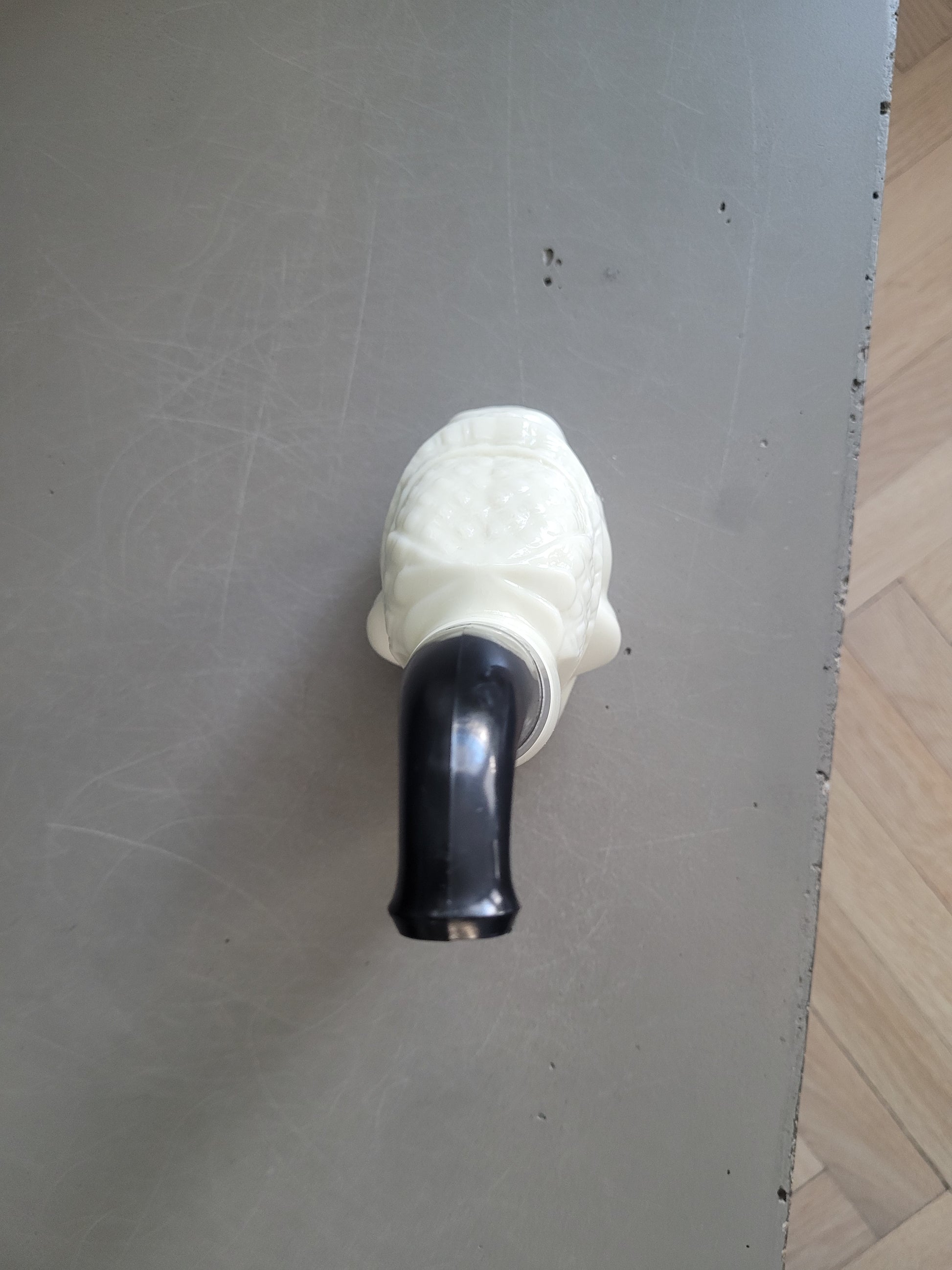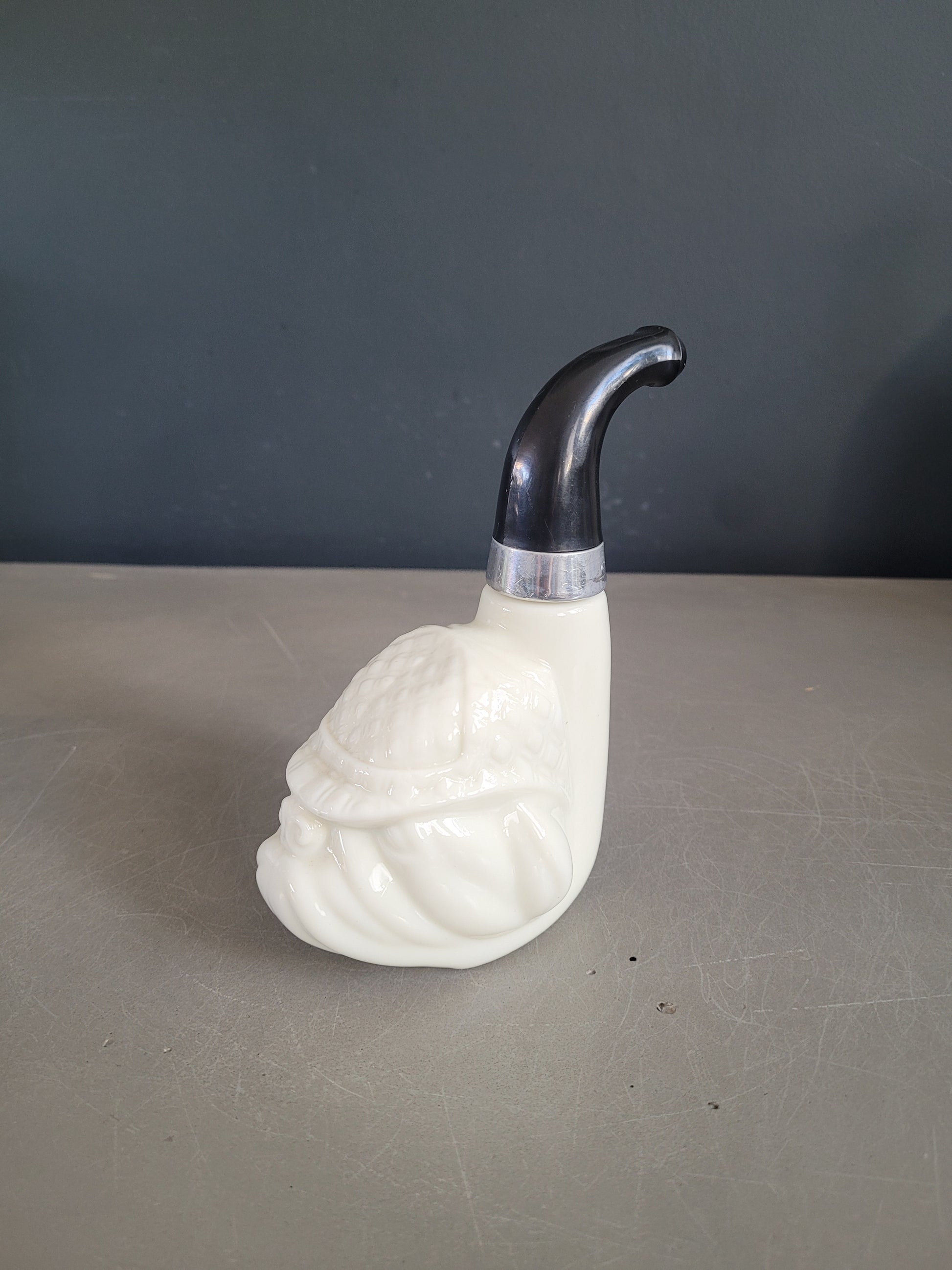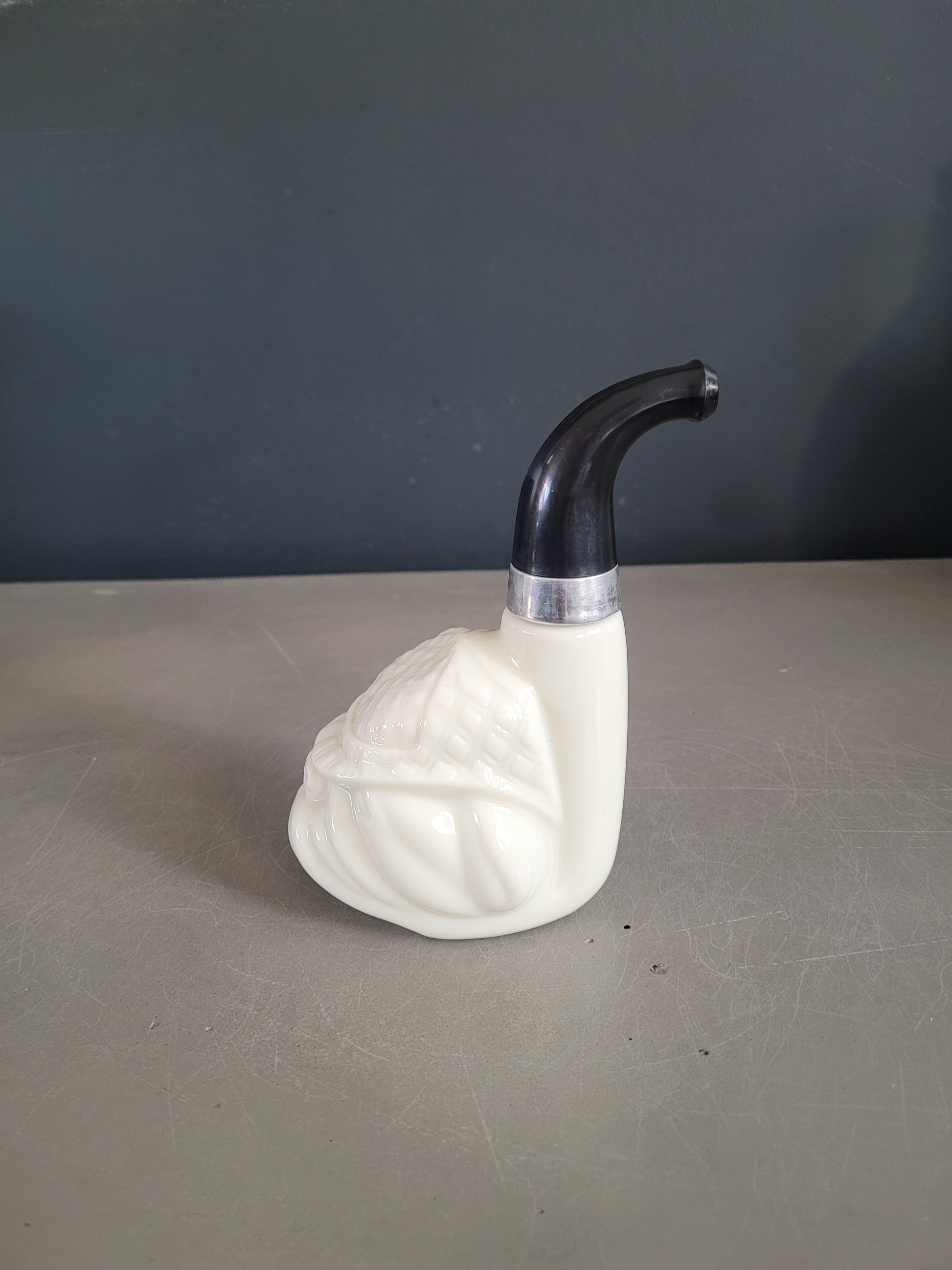Très original ce flacon d'after-shave (après-rasage) de la marque Avon, en opaline couleur crème et embout plastique noir.