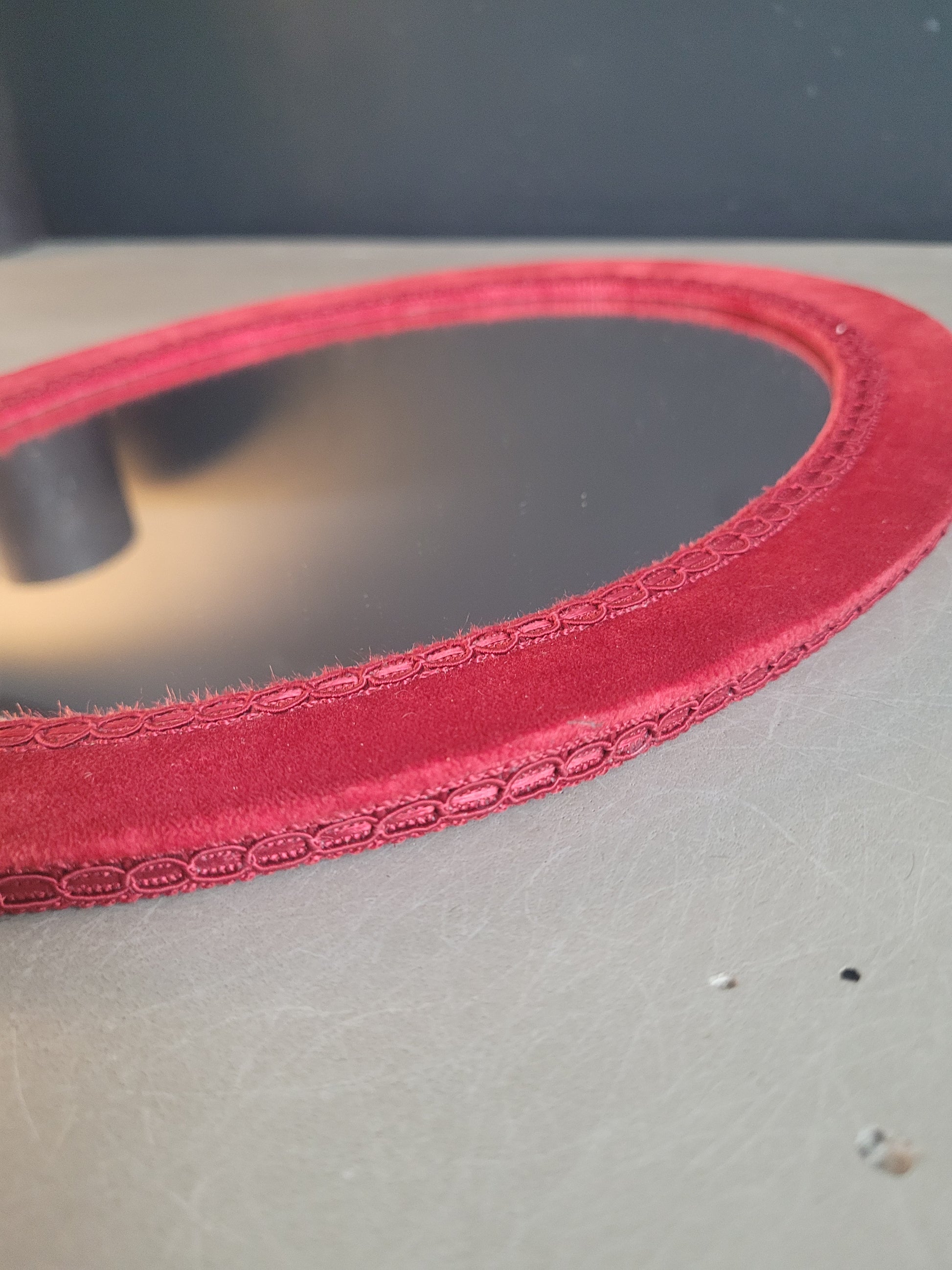 Très décoratif ce miroir ovale encadré de bois recouvert de velours grenat, agrémenté de galons sur le pourtour et sur le bord intérieur.