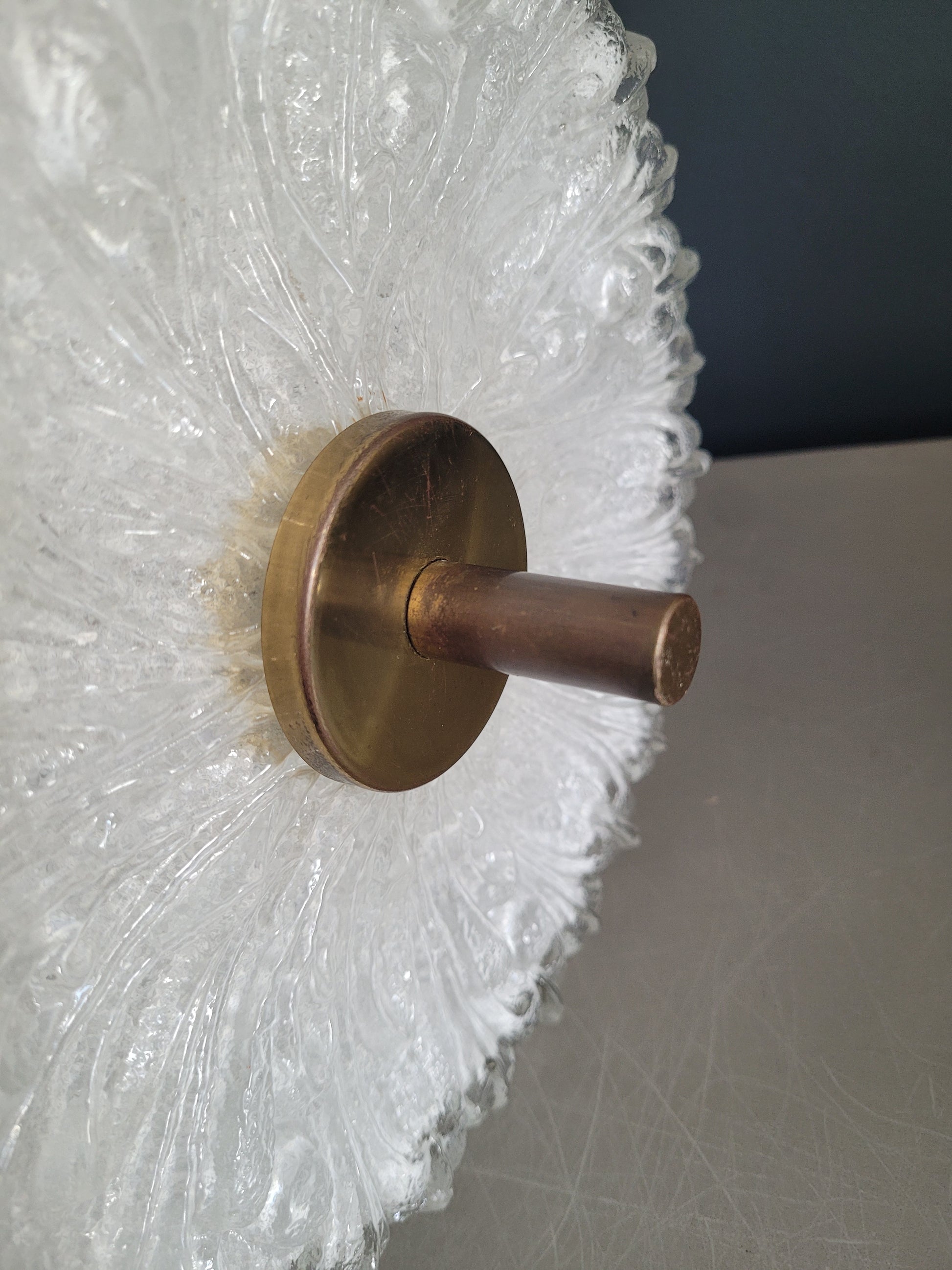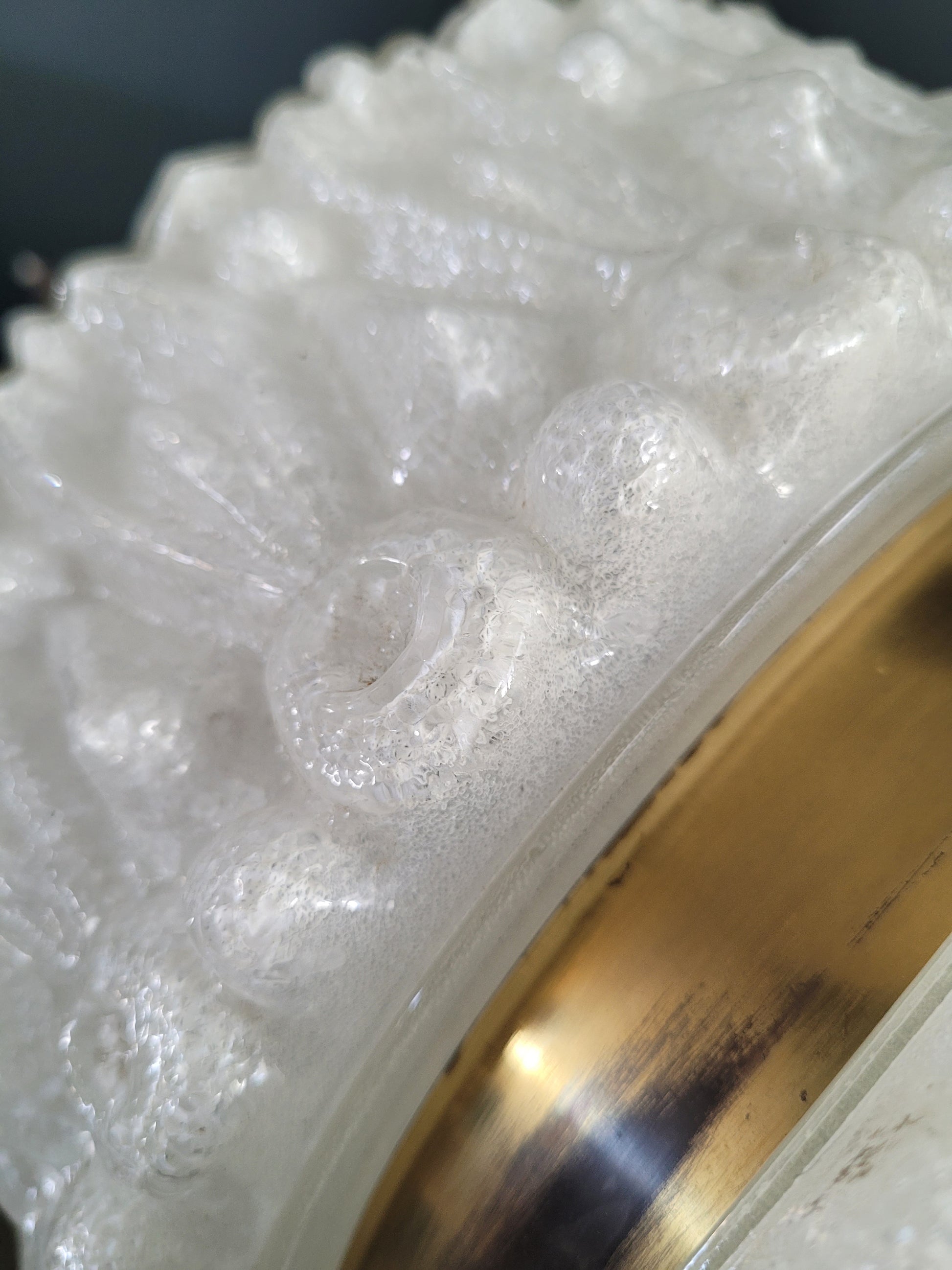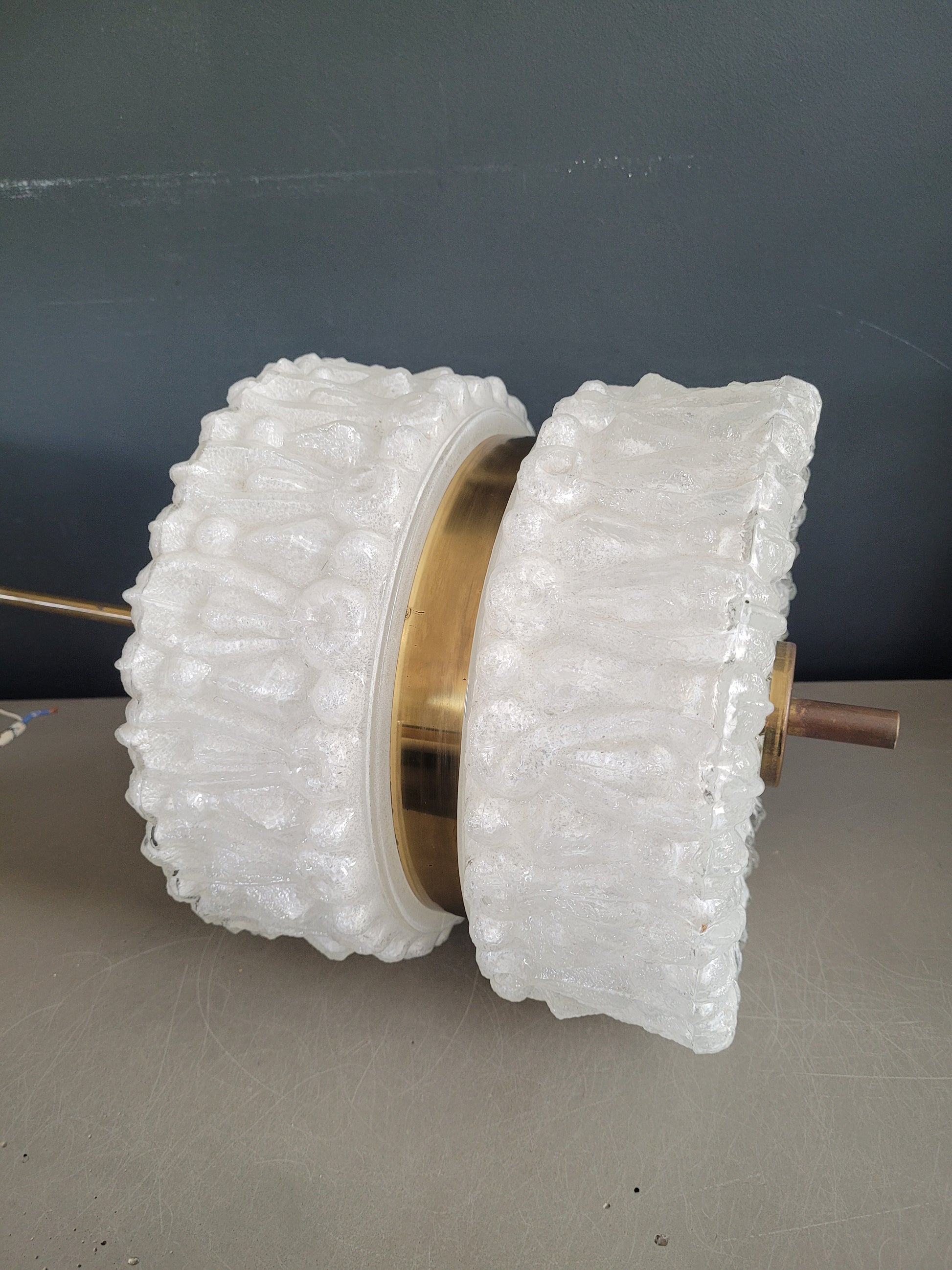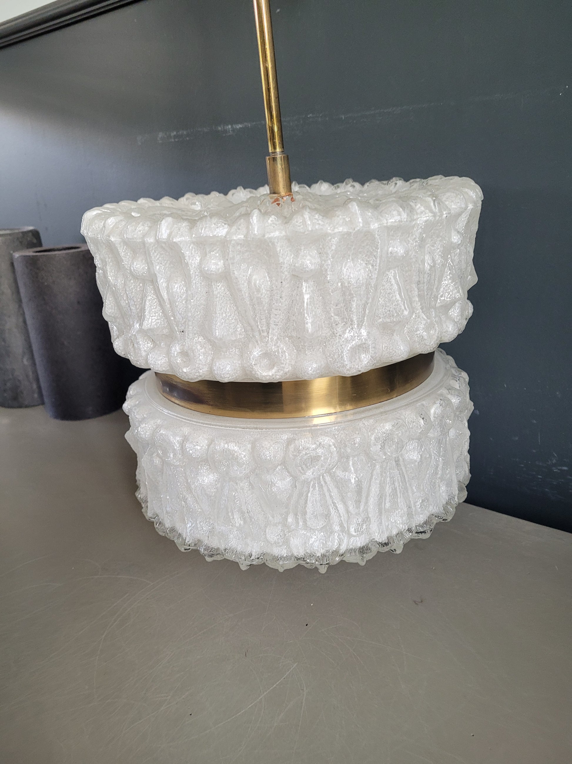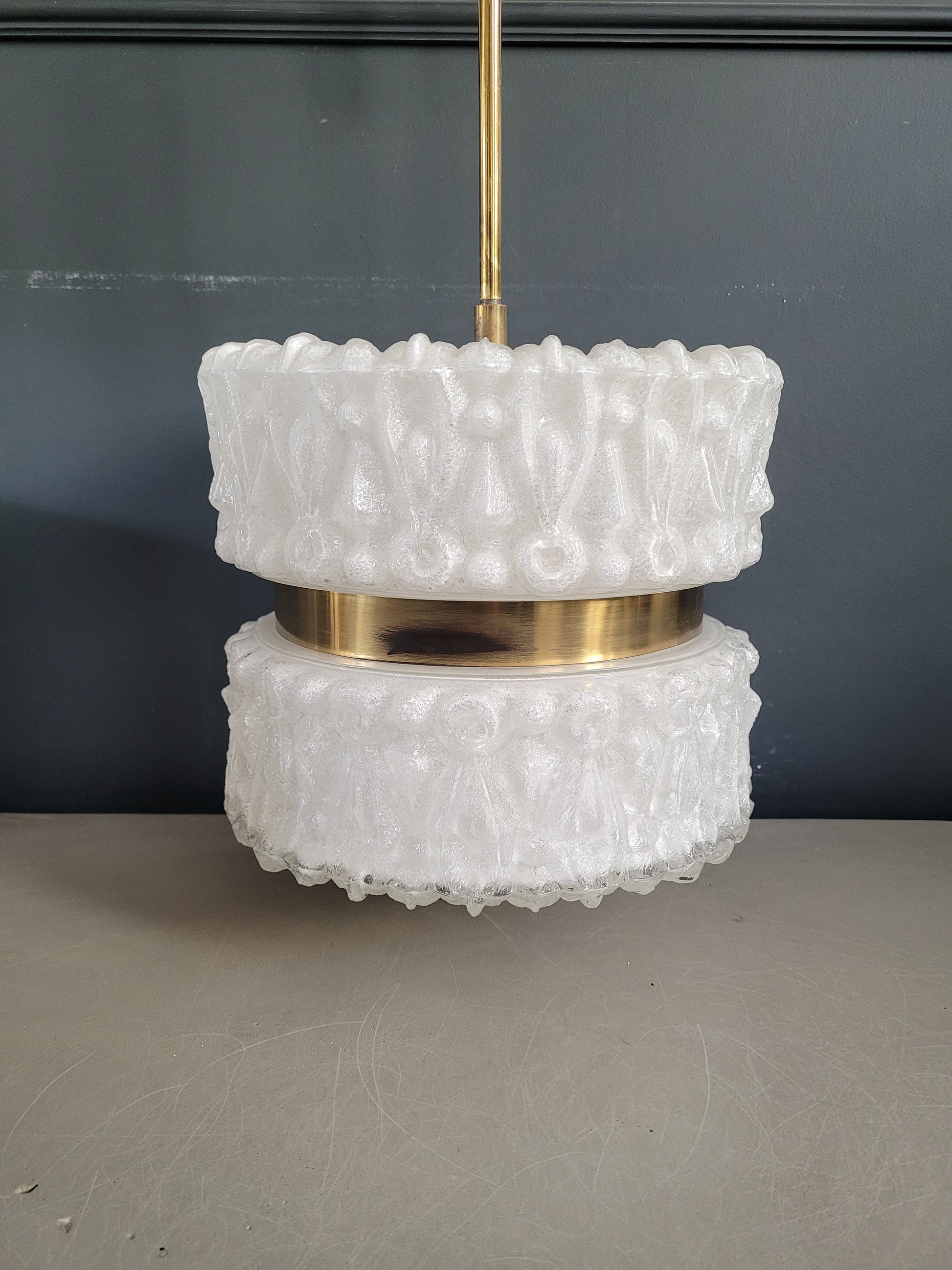 Sublime suspension en verre moulé des années 50-60, en 2 parties, ceinturées par une bande laiton, et suspendue par une tige en laiton également.