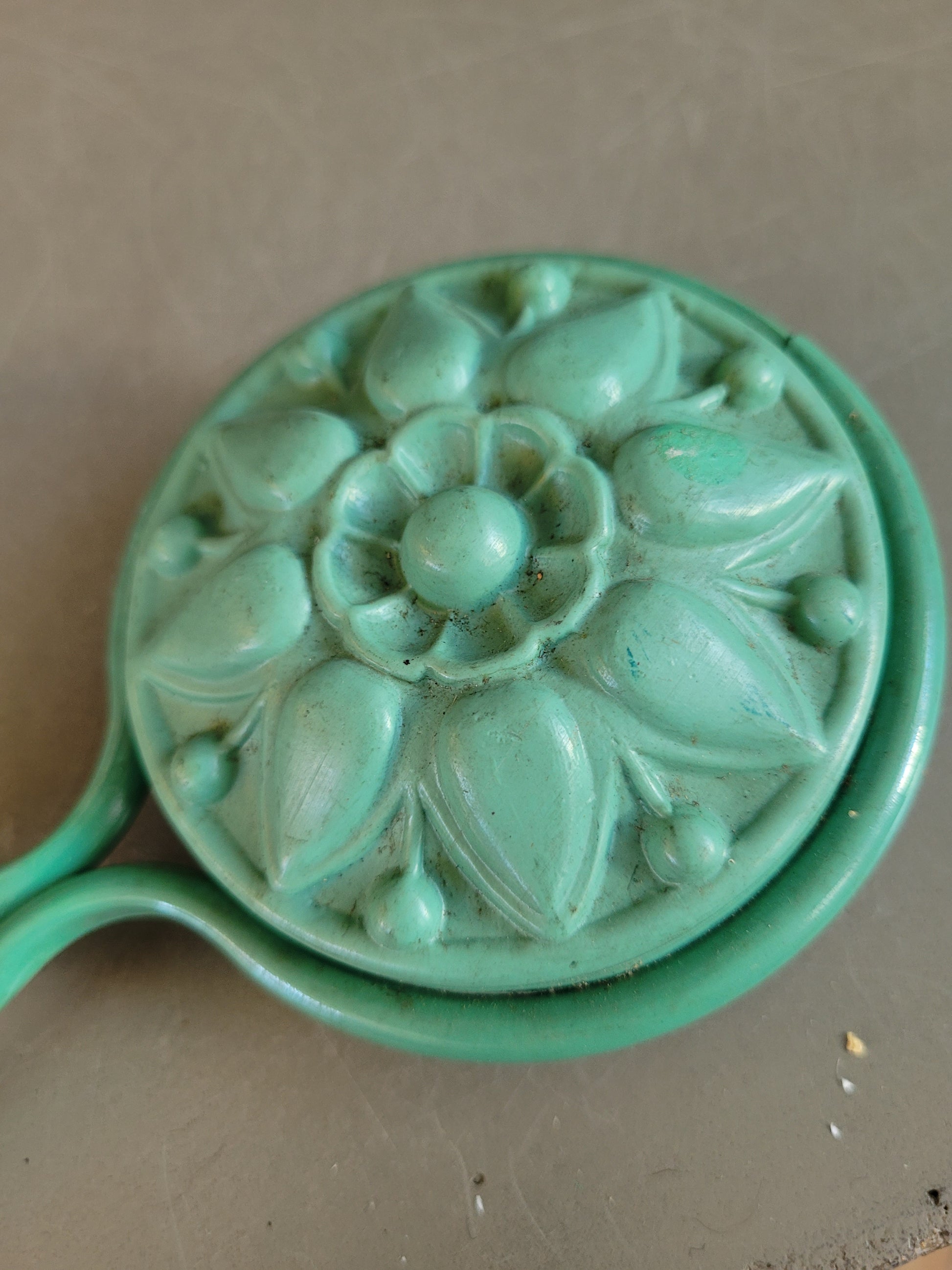 Son design fleuri en relief, sa poignée arrondie en boucle typique de l'époque en font une jolie pièce de collection ou un bel objet déco.