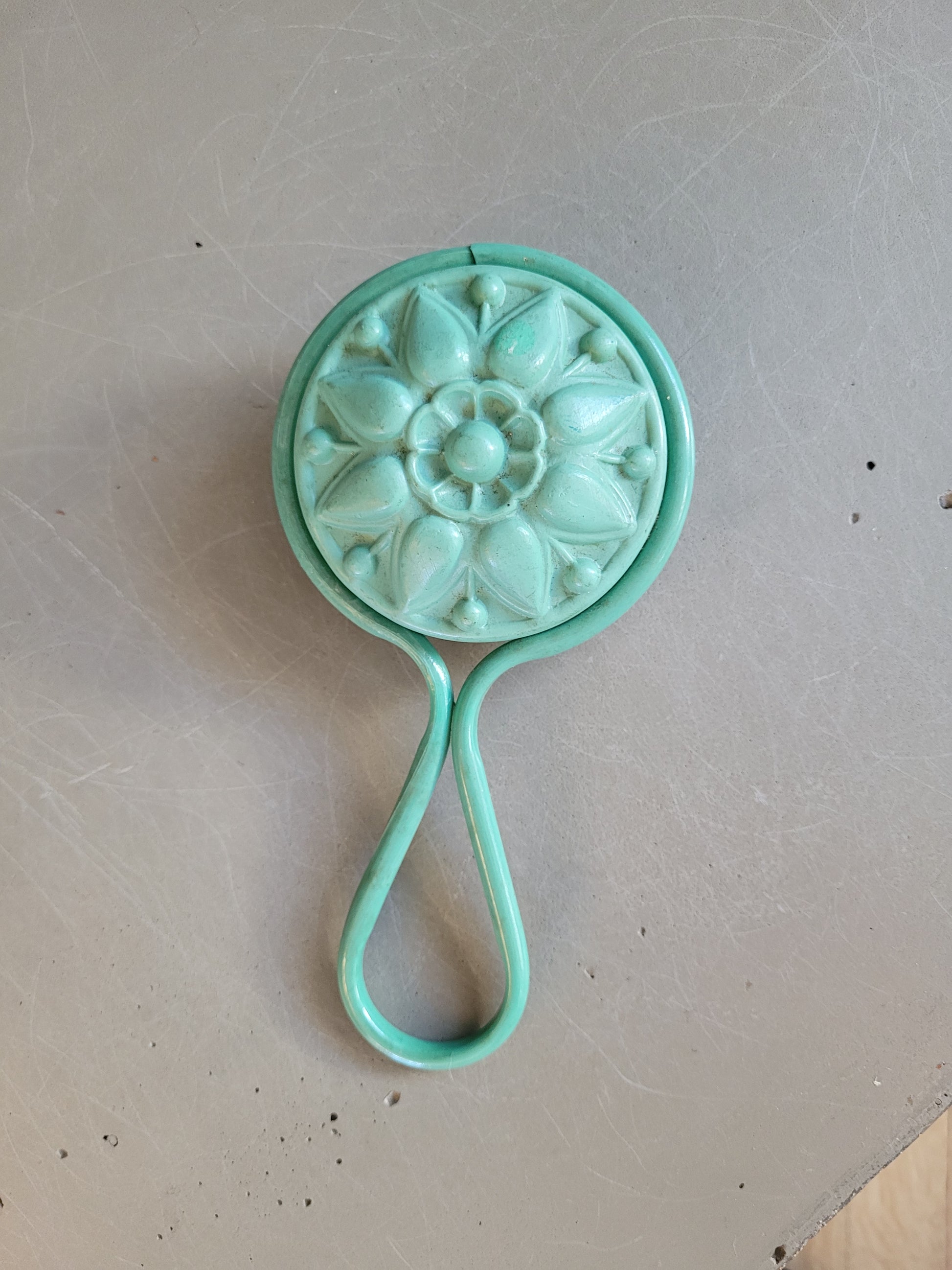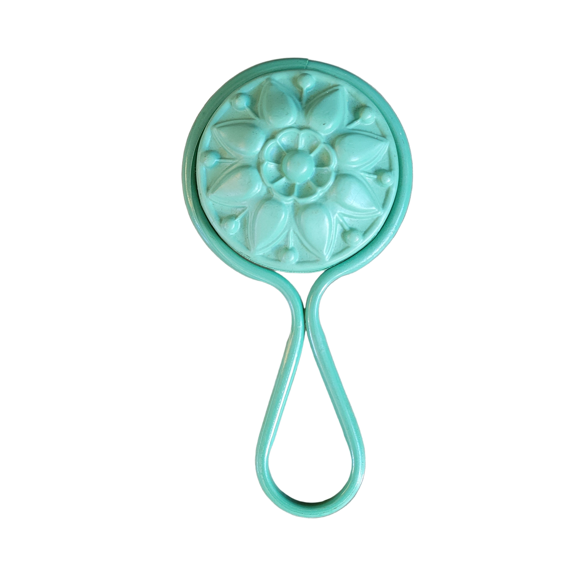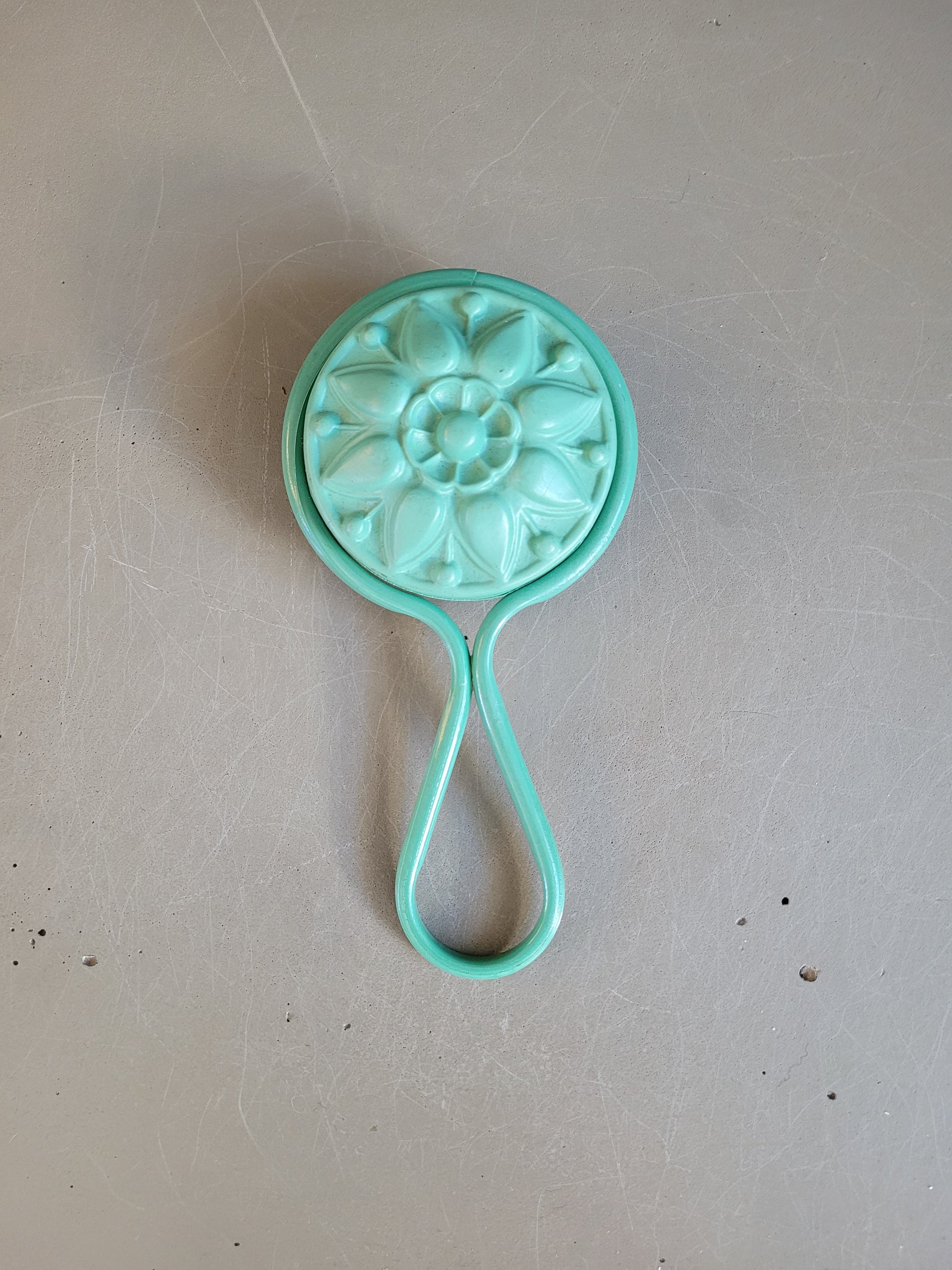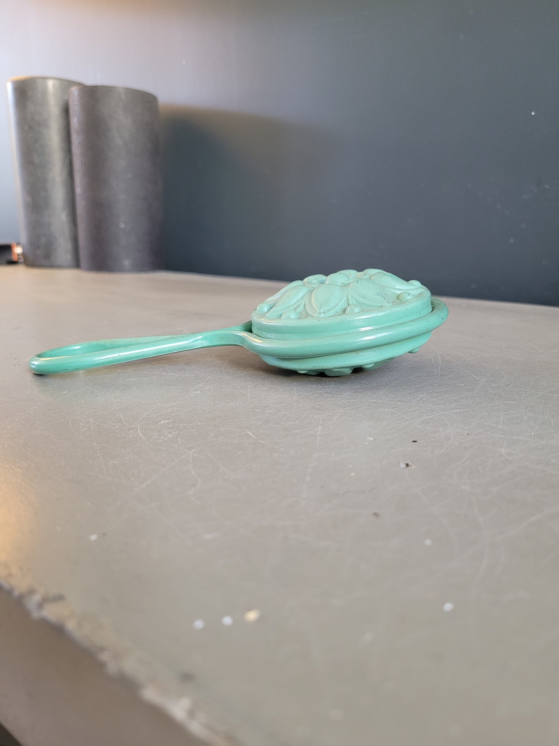 Superbe hochet pour bébé en celluloïd des années 50, couleur vert d'eau.