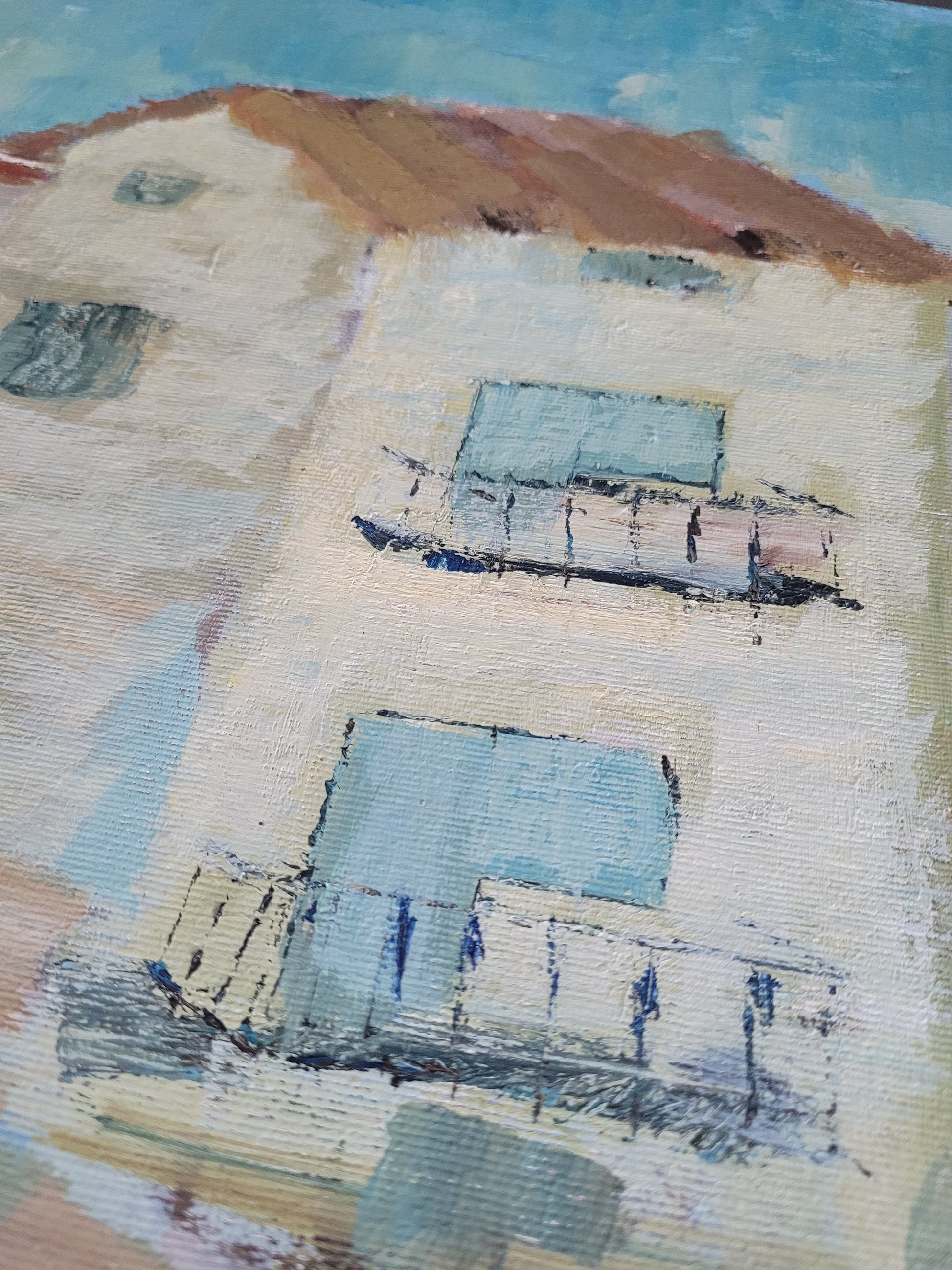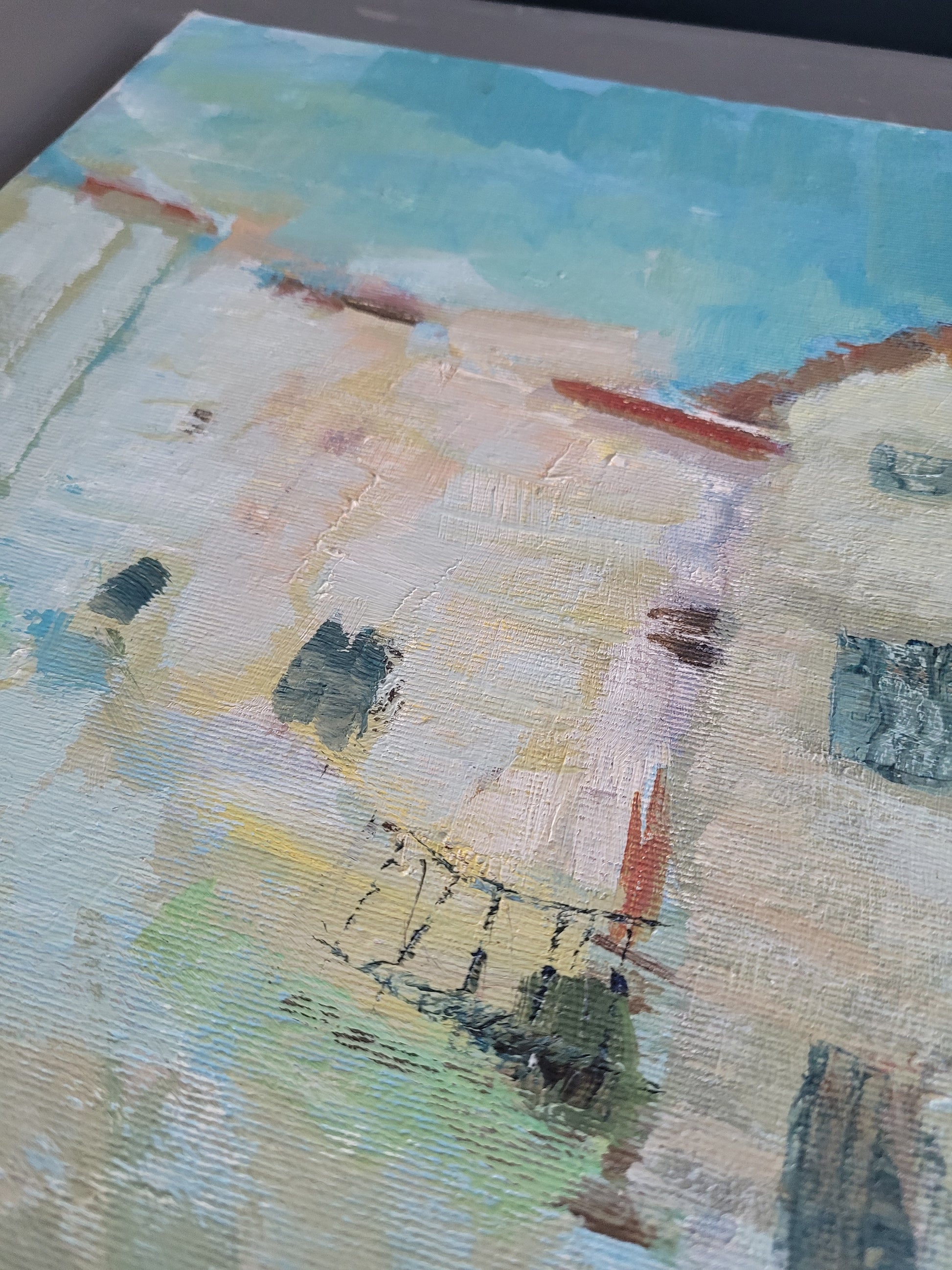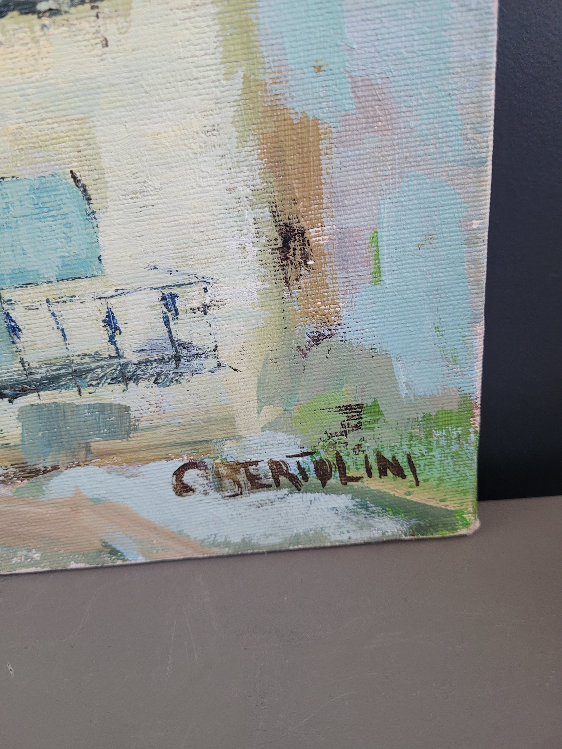 Magnifique tableau, huile sur toile montée sur châssis bois, signé C. Bertolini et représentant une vue sur une rue et une maison. On devine une étendue d'eau en arrière plan. Le tout est réalisé dans des tons très doux, rendant le tableau lumineux et reposant, très agréable à regarder!