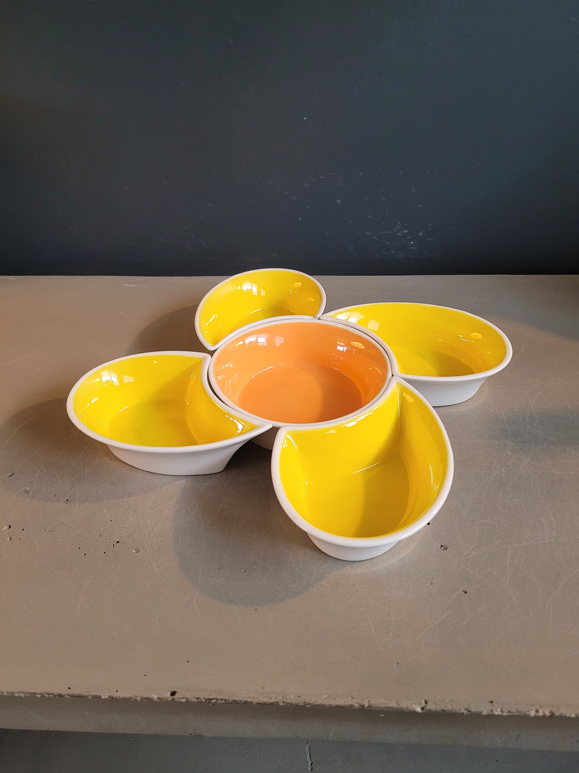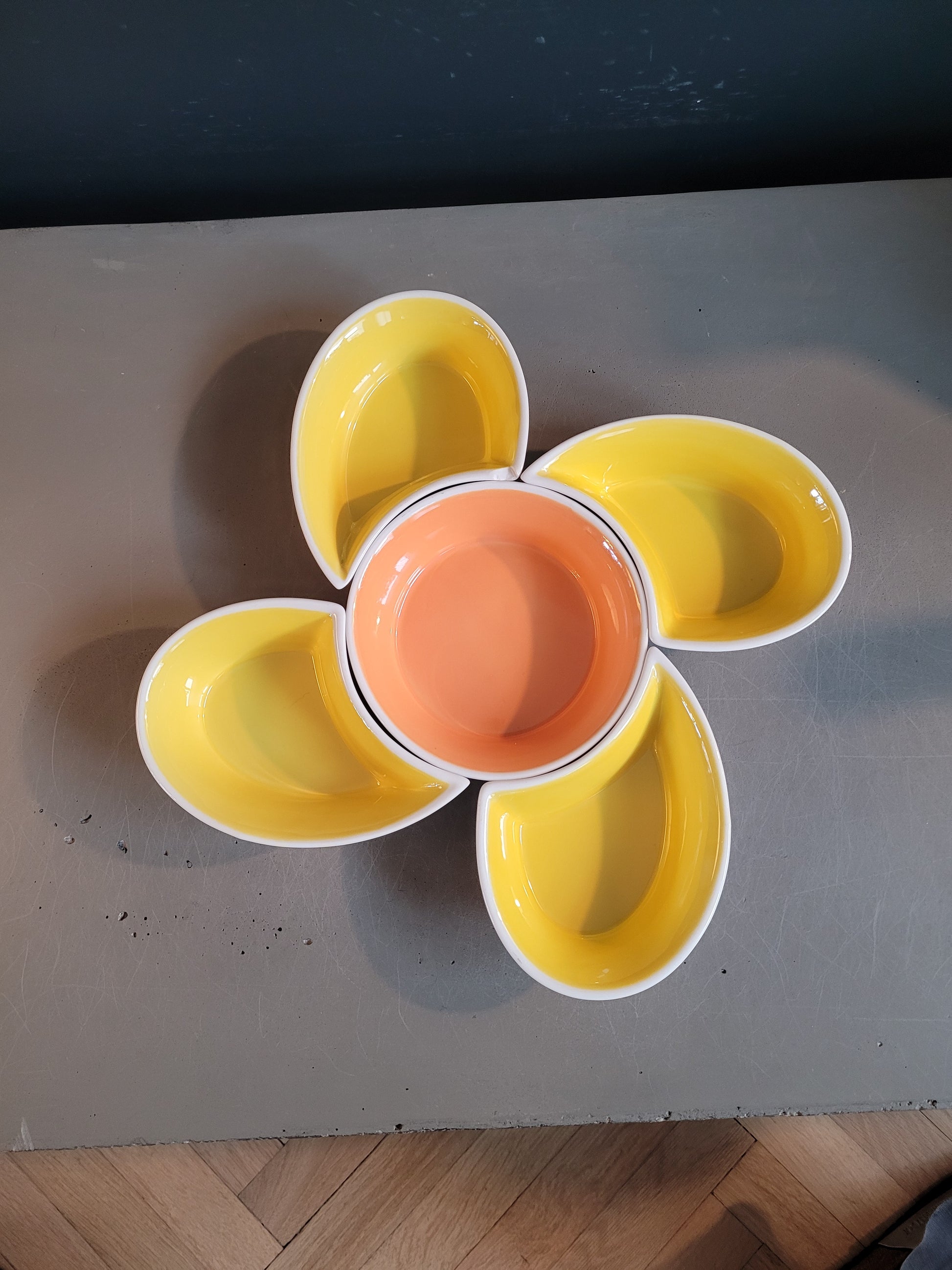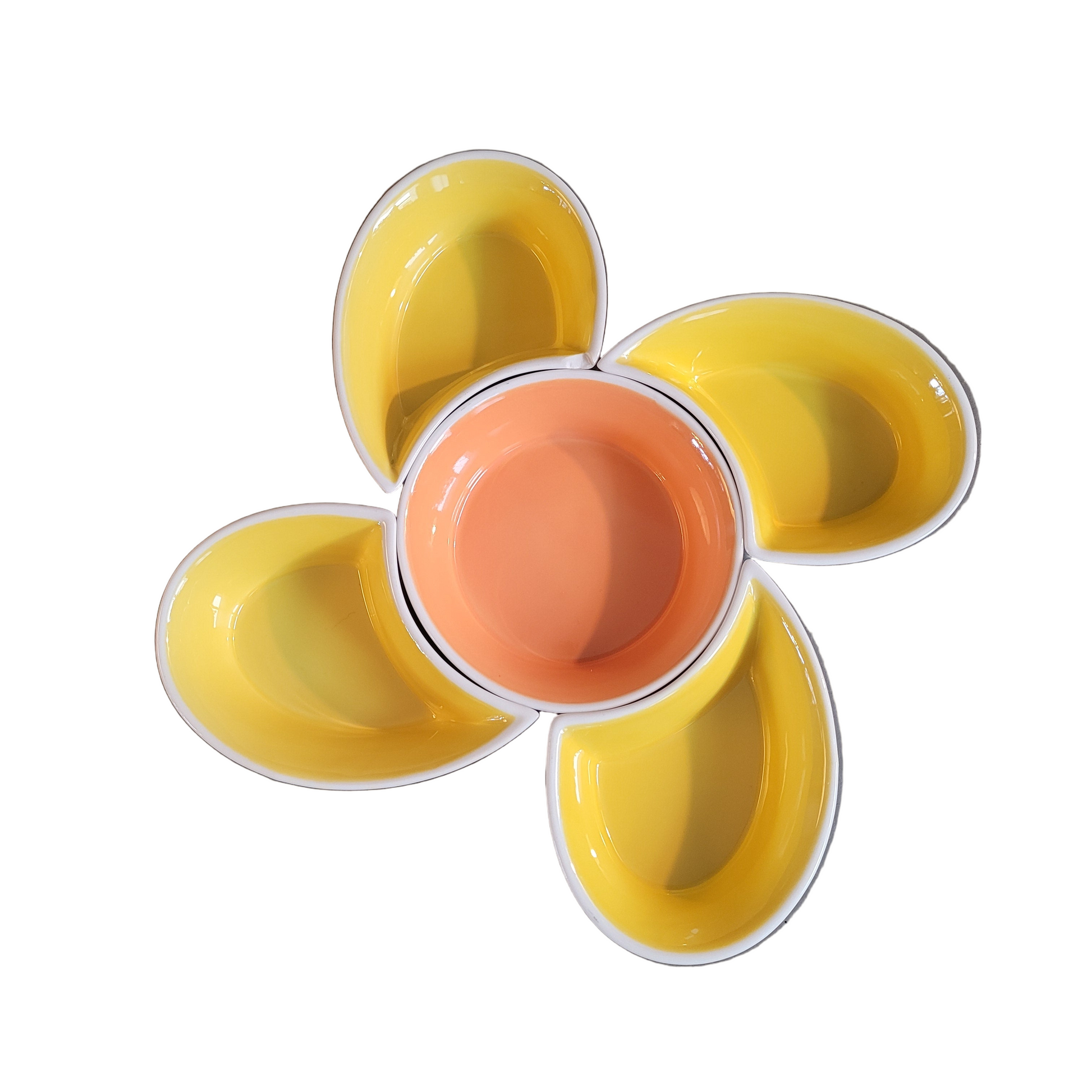 5 coupelles à associer pour former une fleur, les 4 pétales sont jaune vif à l'intérieur et le cœur est abricot. Elles sont toutes blanches à l'extérieur.