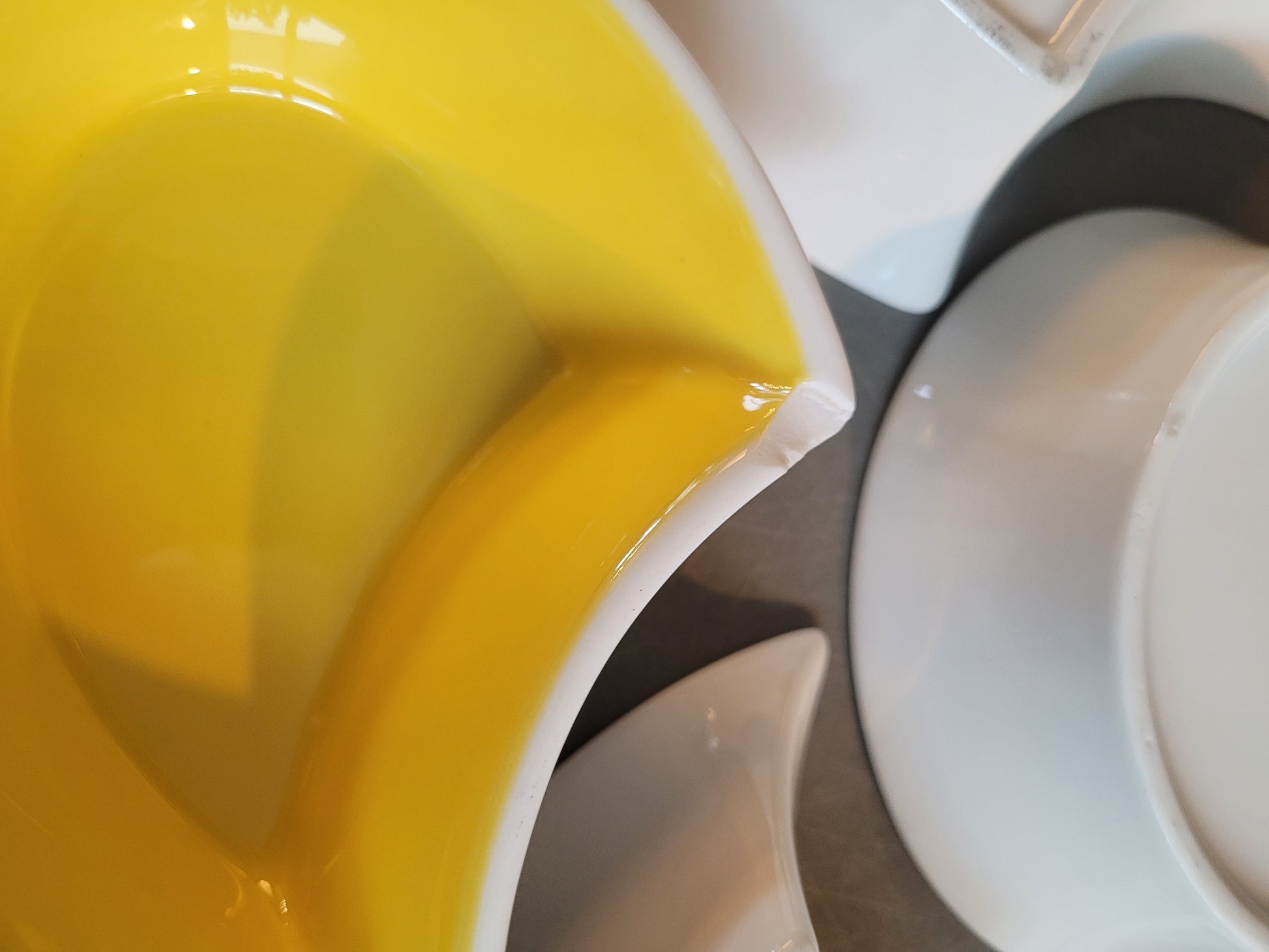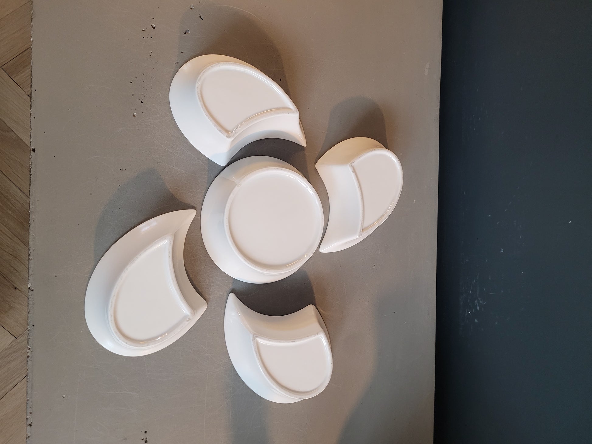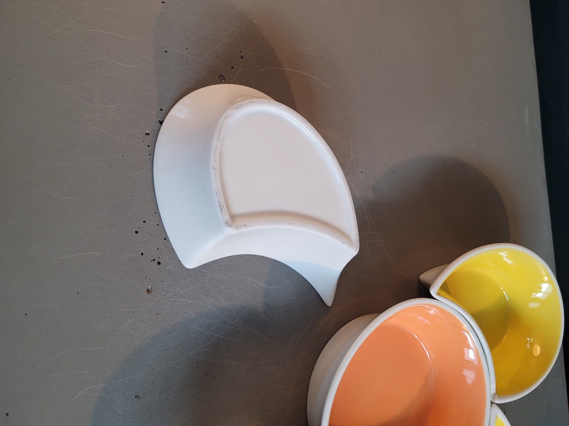 5 coupelles à associer pour former une fleur, les 4 pétales sont jaune vif à l'intérieur et le cœur est abricot. Elles sont toutes blanches à l'extérieur.