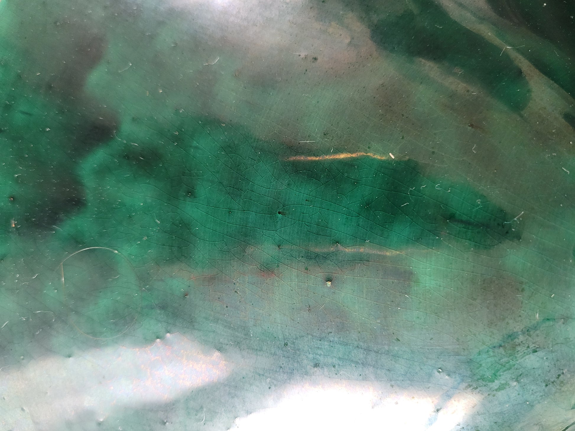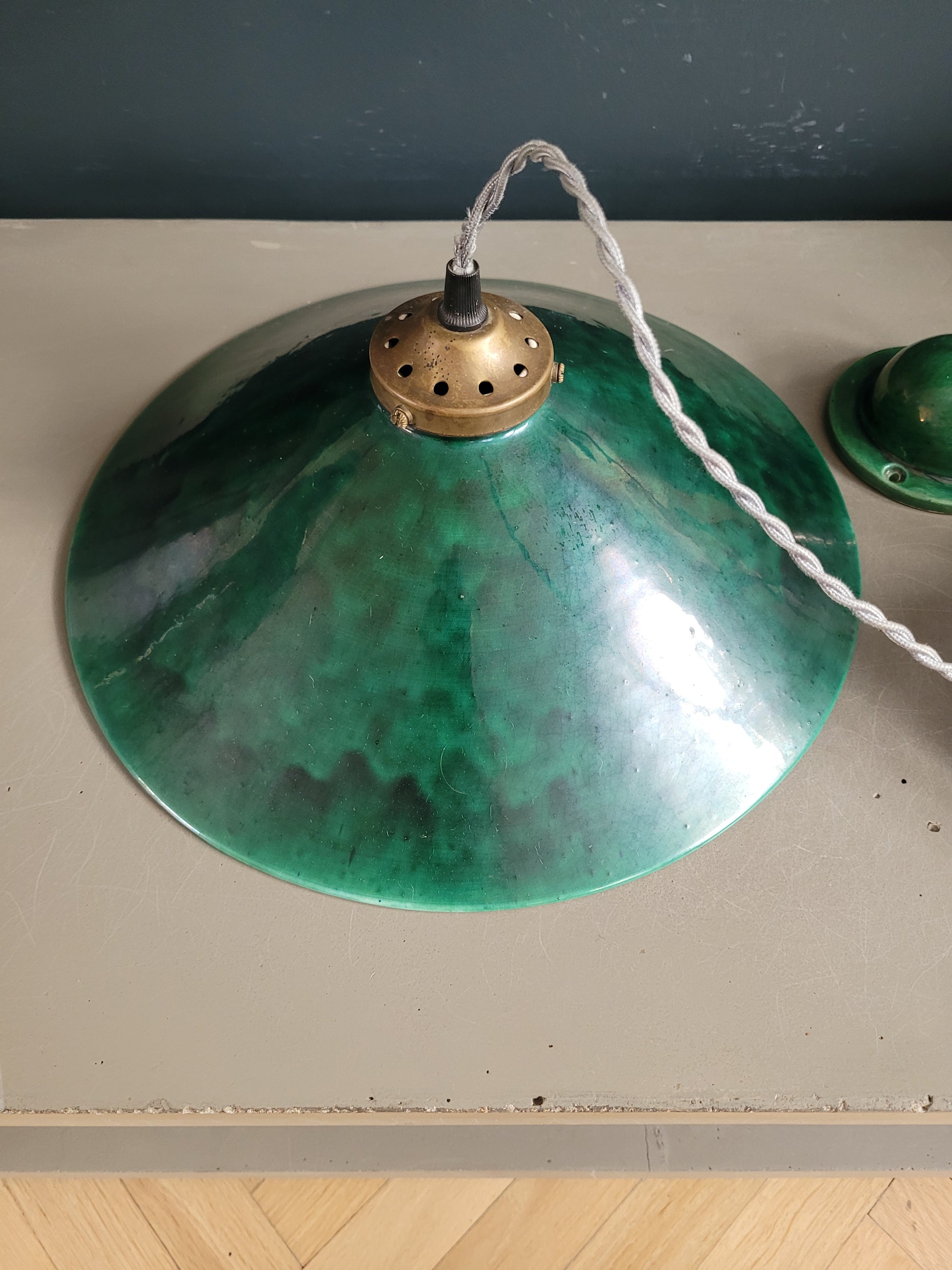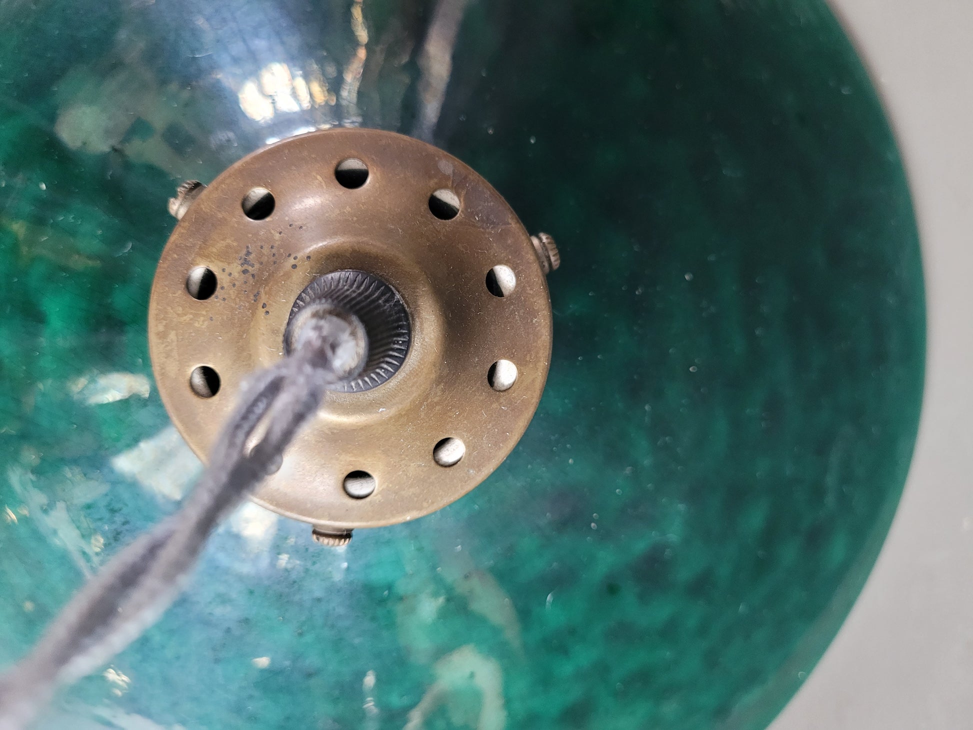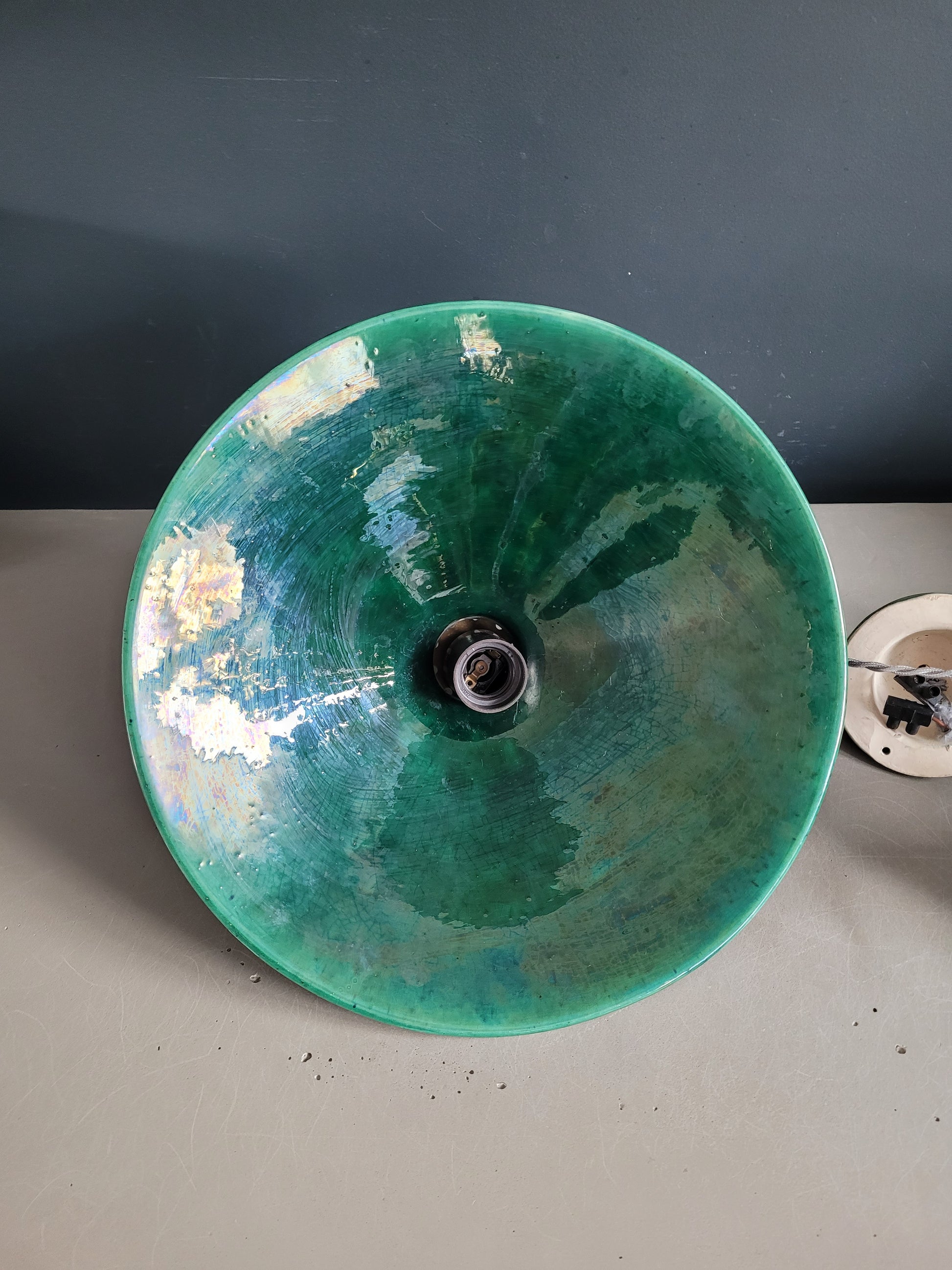 Sublime suspension en céramique émaillée verte à poulies, contrepoids, rosace et abat-jour en céramique.