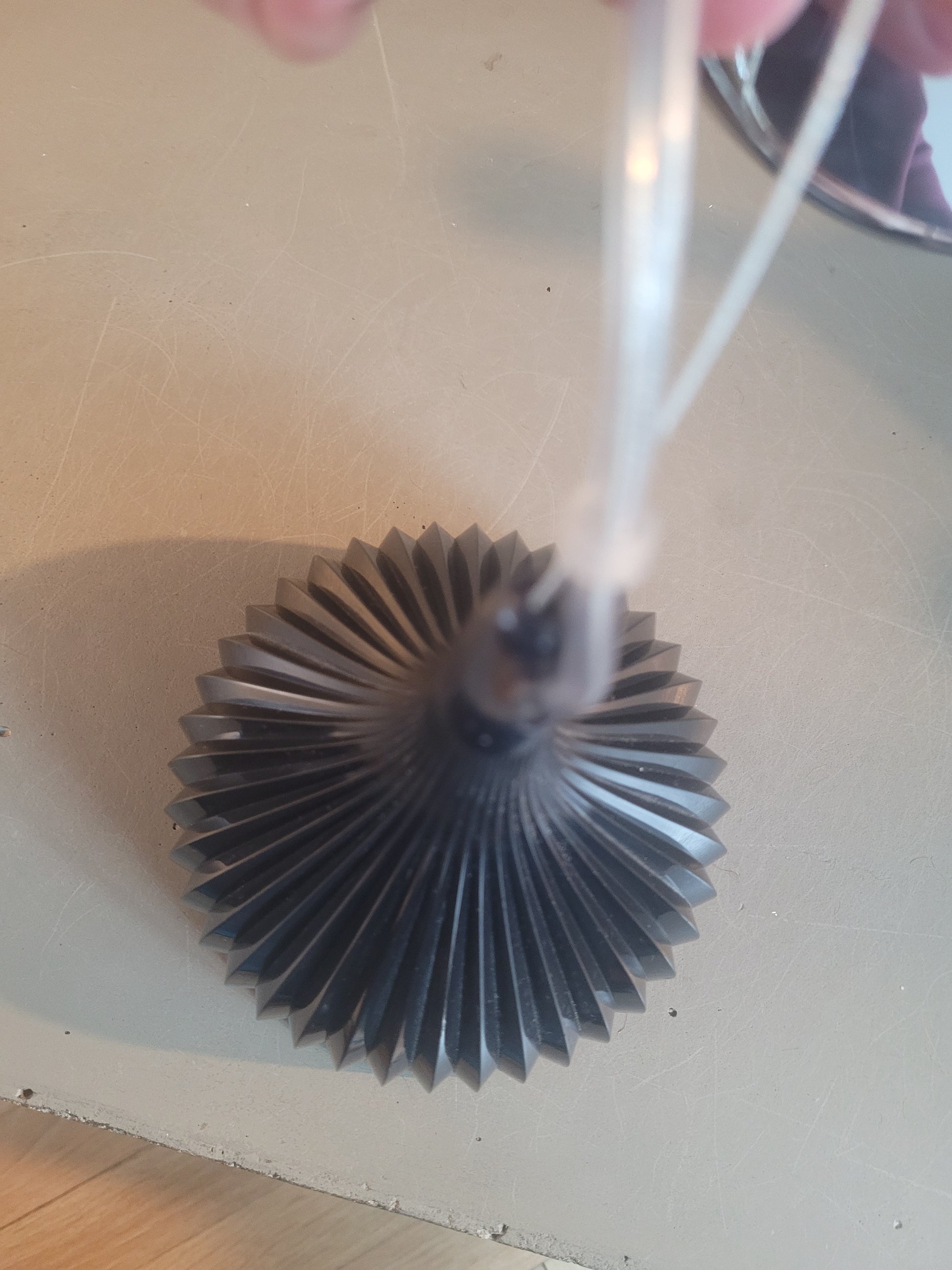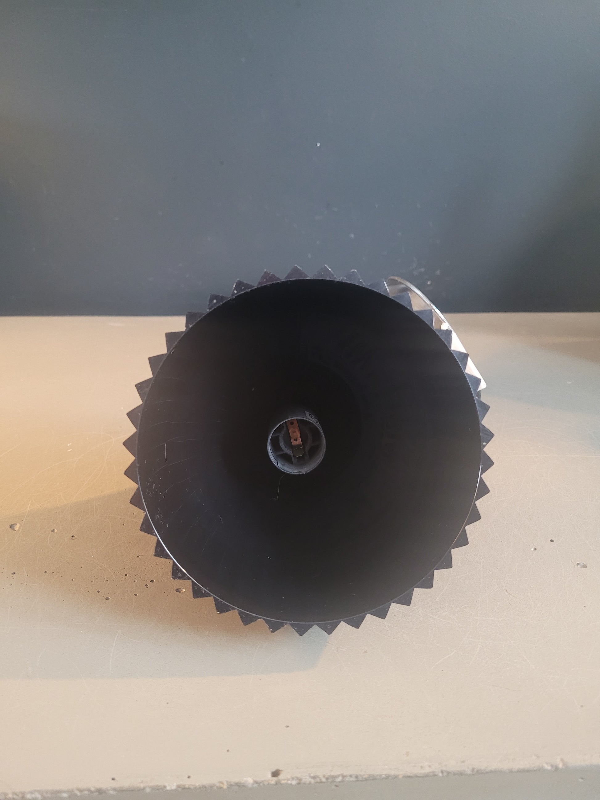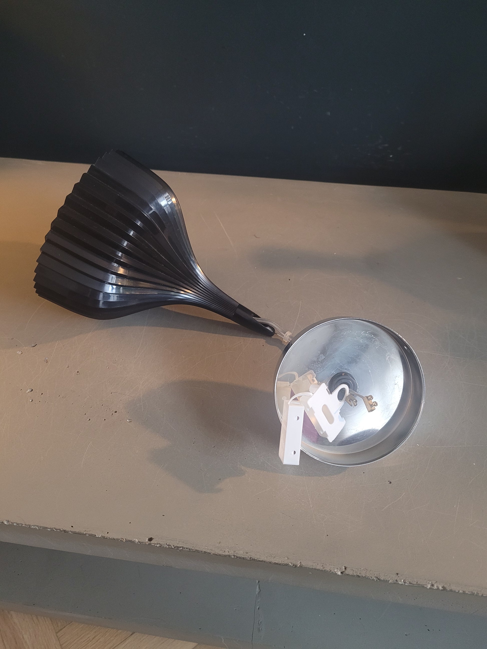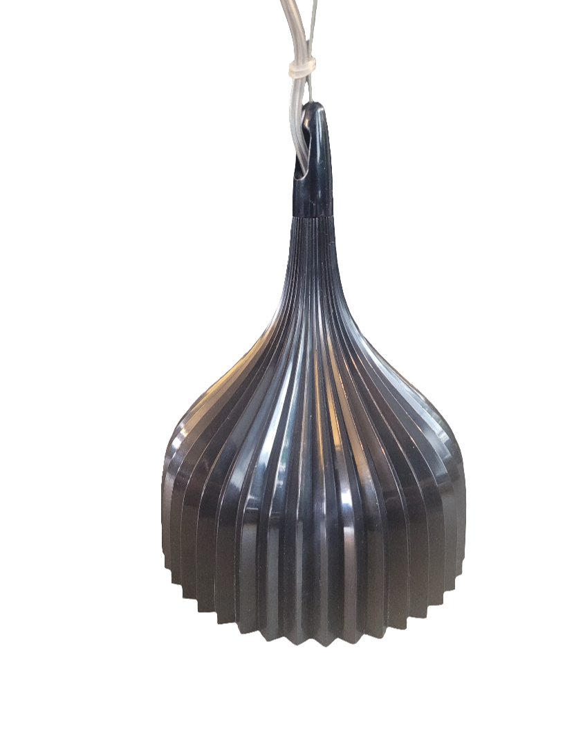 En plastique noir, l'abat-jour en forme de goutte à la surface entièrement plissée. La lumière qui se reflète sur les plis lui confère une présence lumineuse et scintillante.
