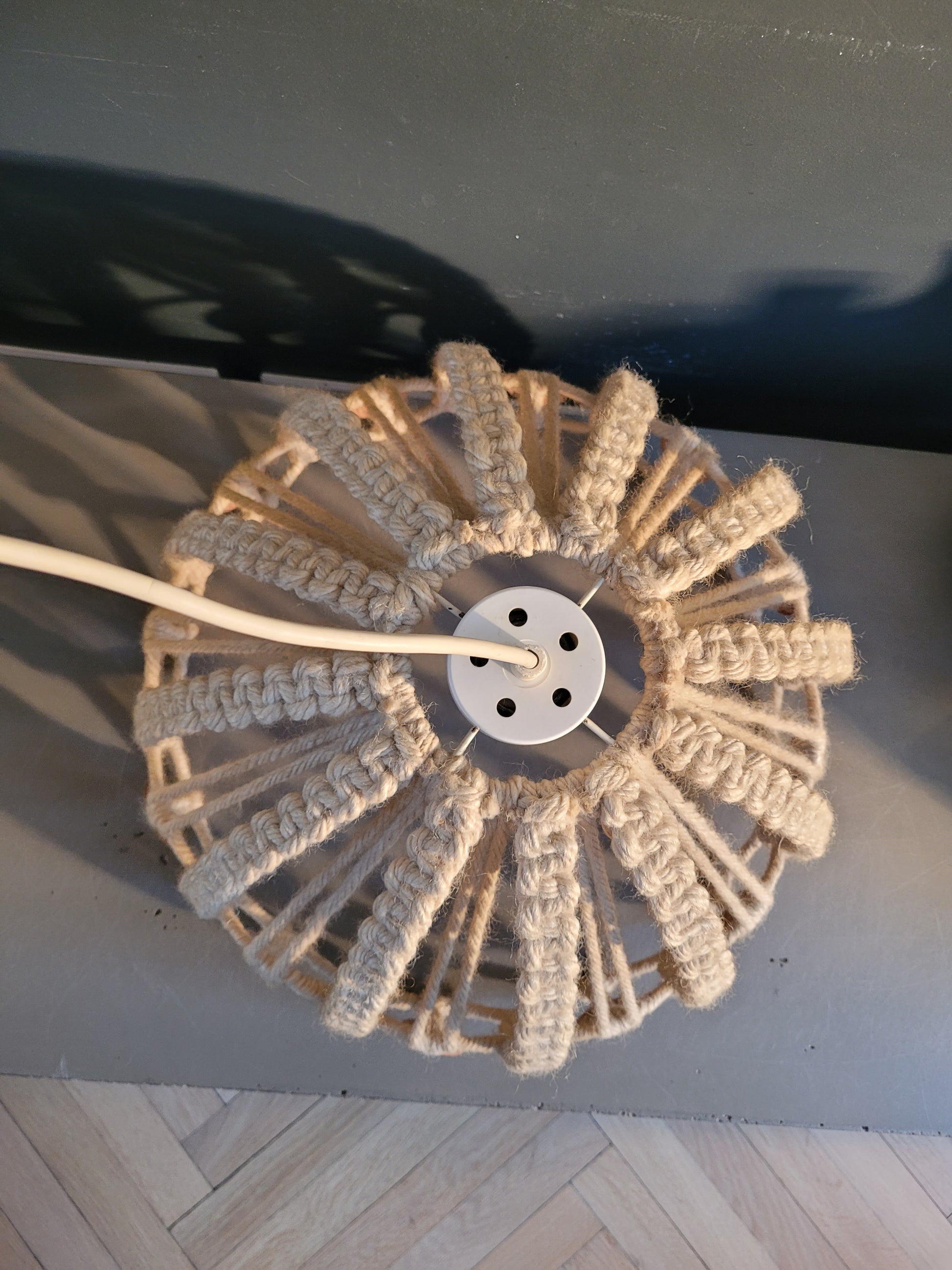 Sublime suspension vintage en macramé de laine et bois.
