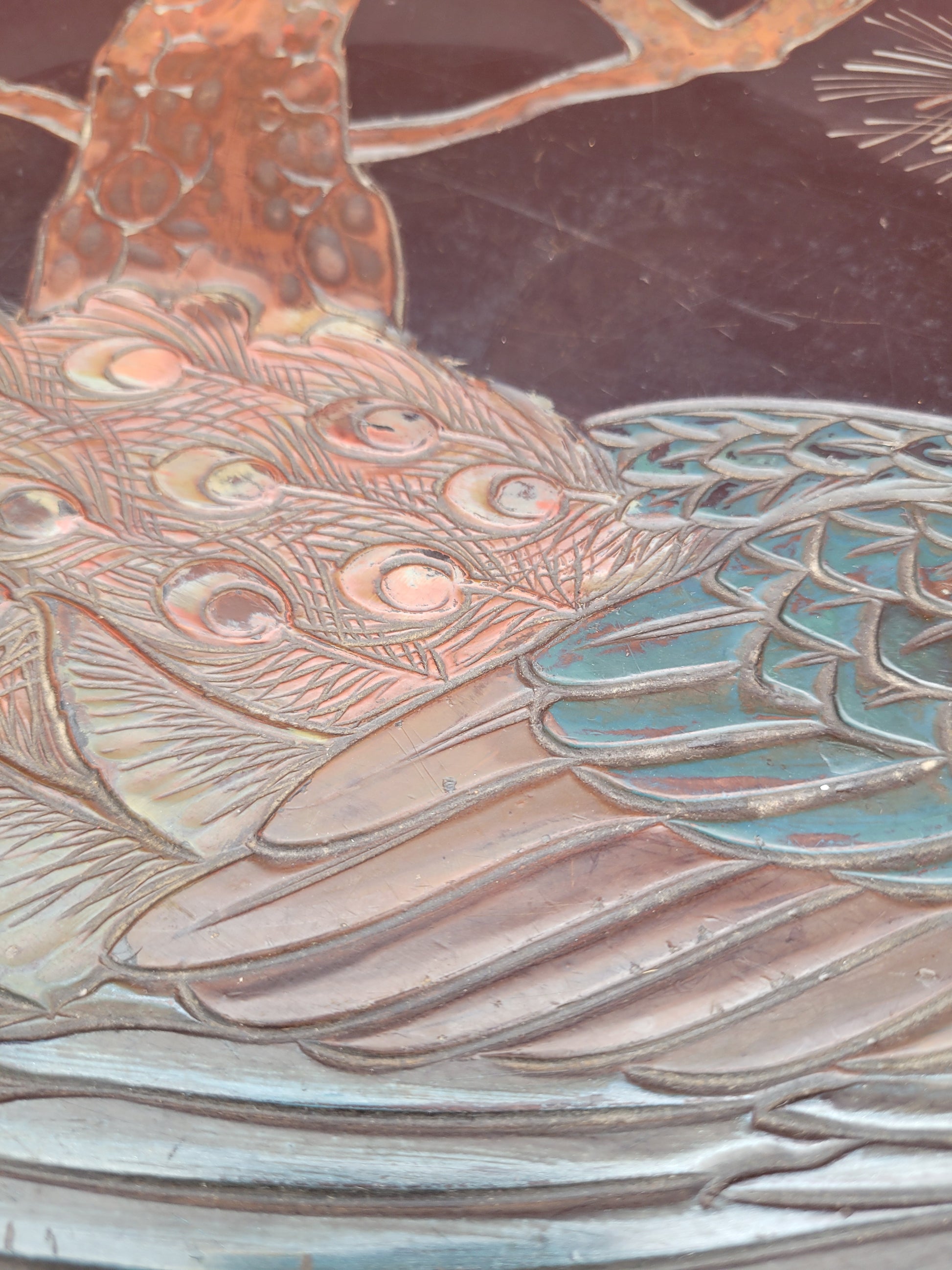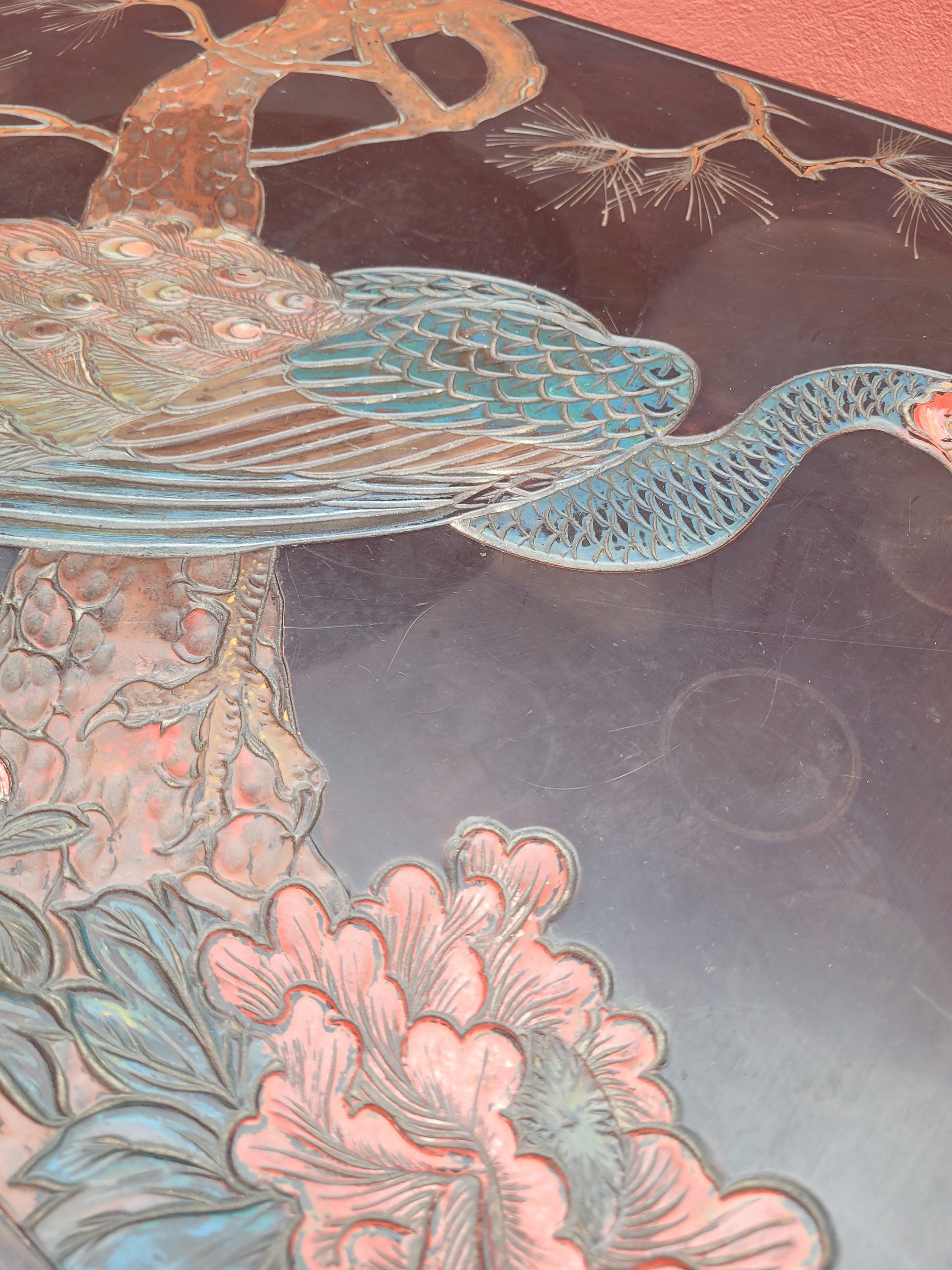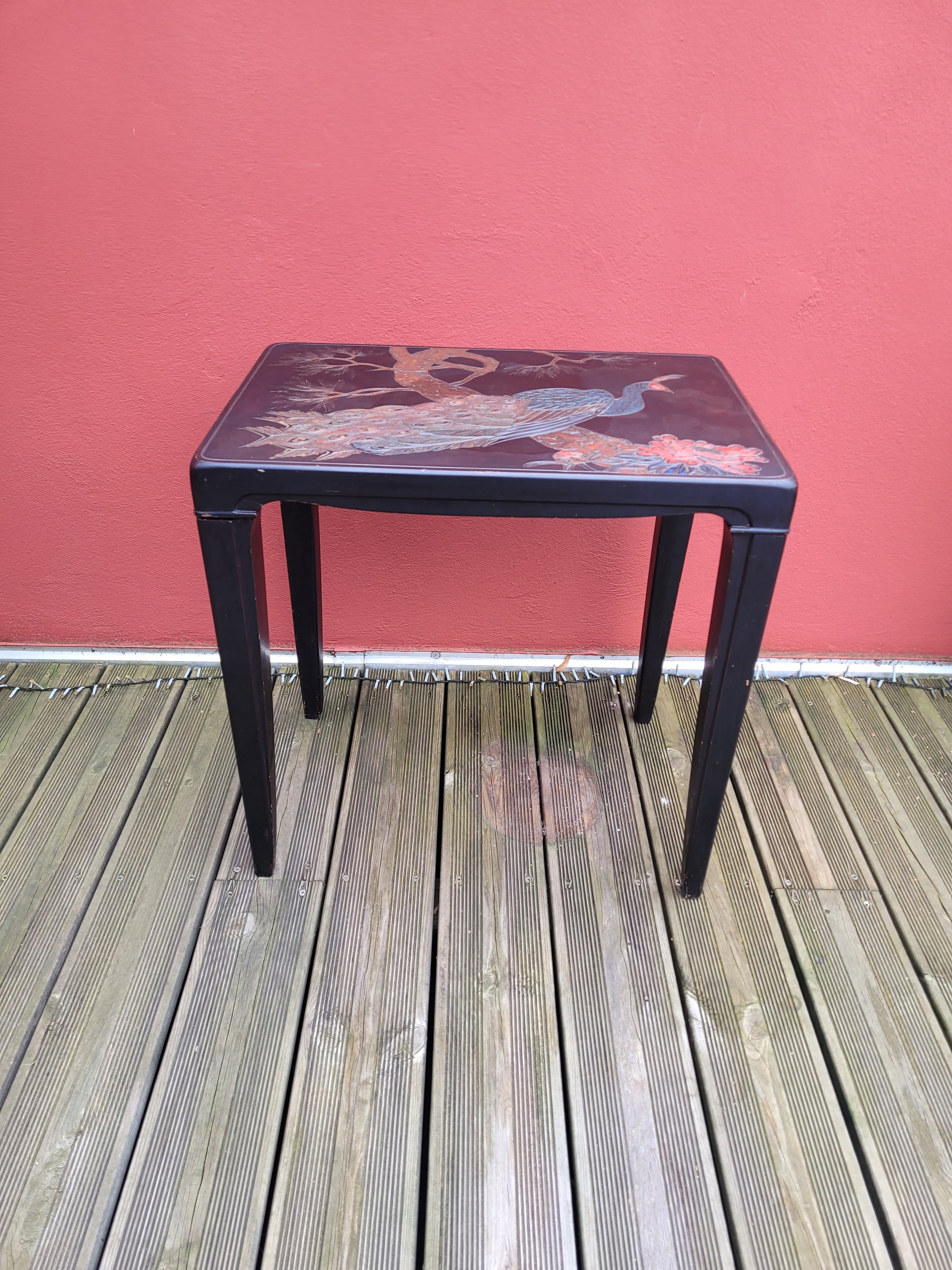Superbe table japonaise des années 70 en bois, laquée noir et gravée d'un magnifique motif paon polychrome sur une branche.