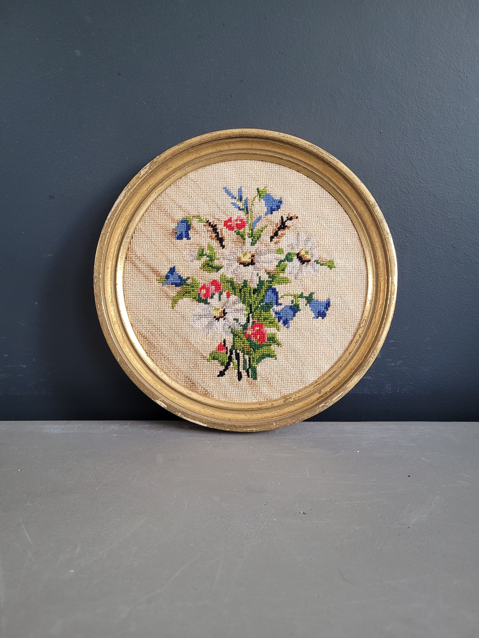 Superbe travail de broderie au point de croix, très fin et délicat, représentant un bouquet champêtre, encadré dans un magnifique petit cadre rond en bois peint en doré.