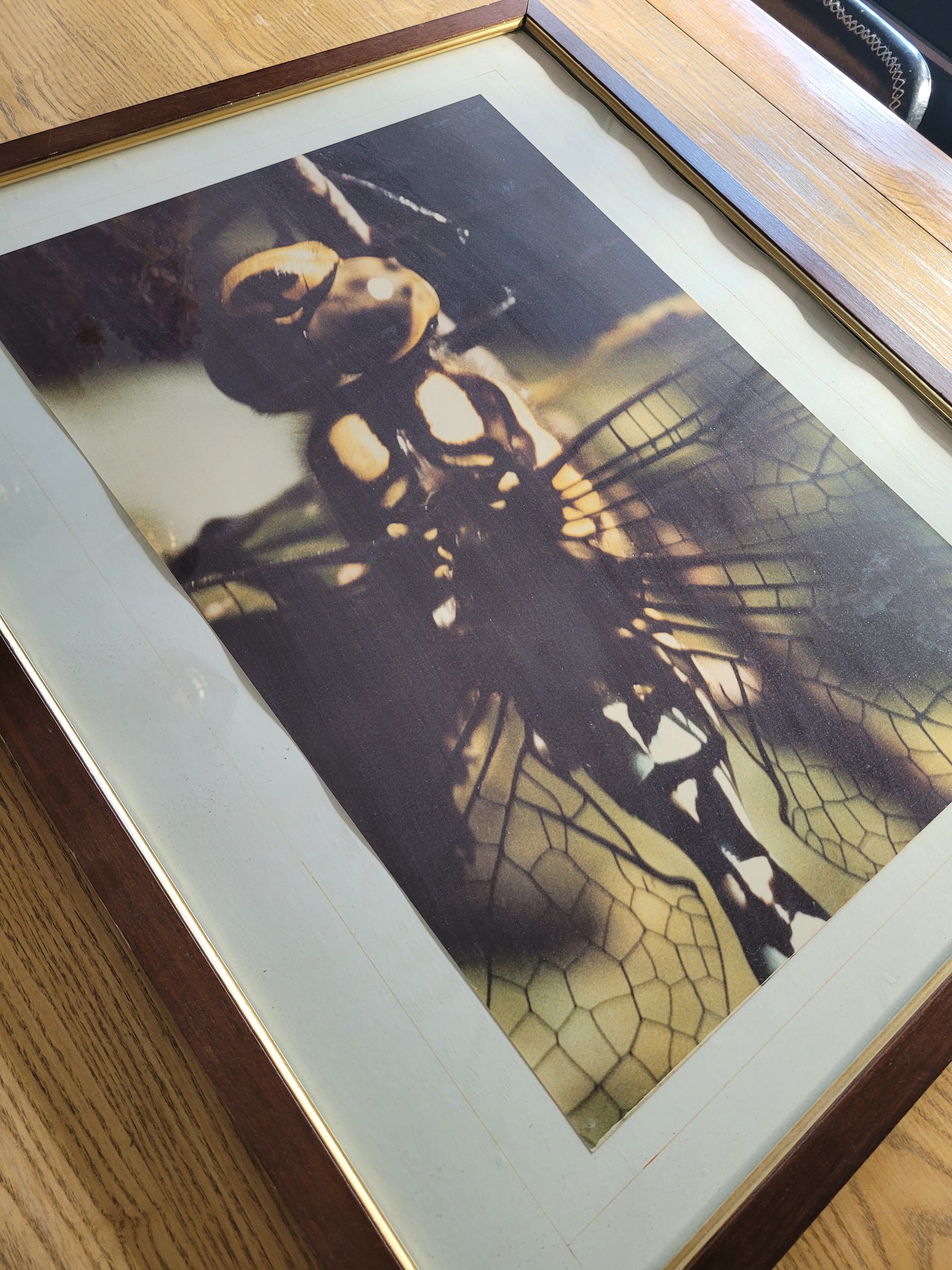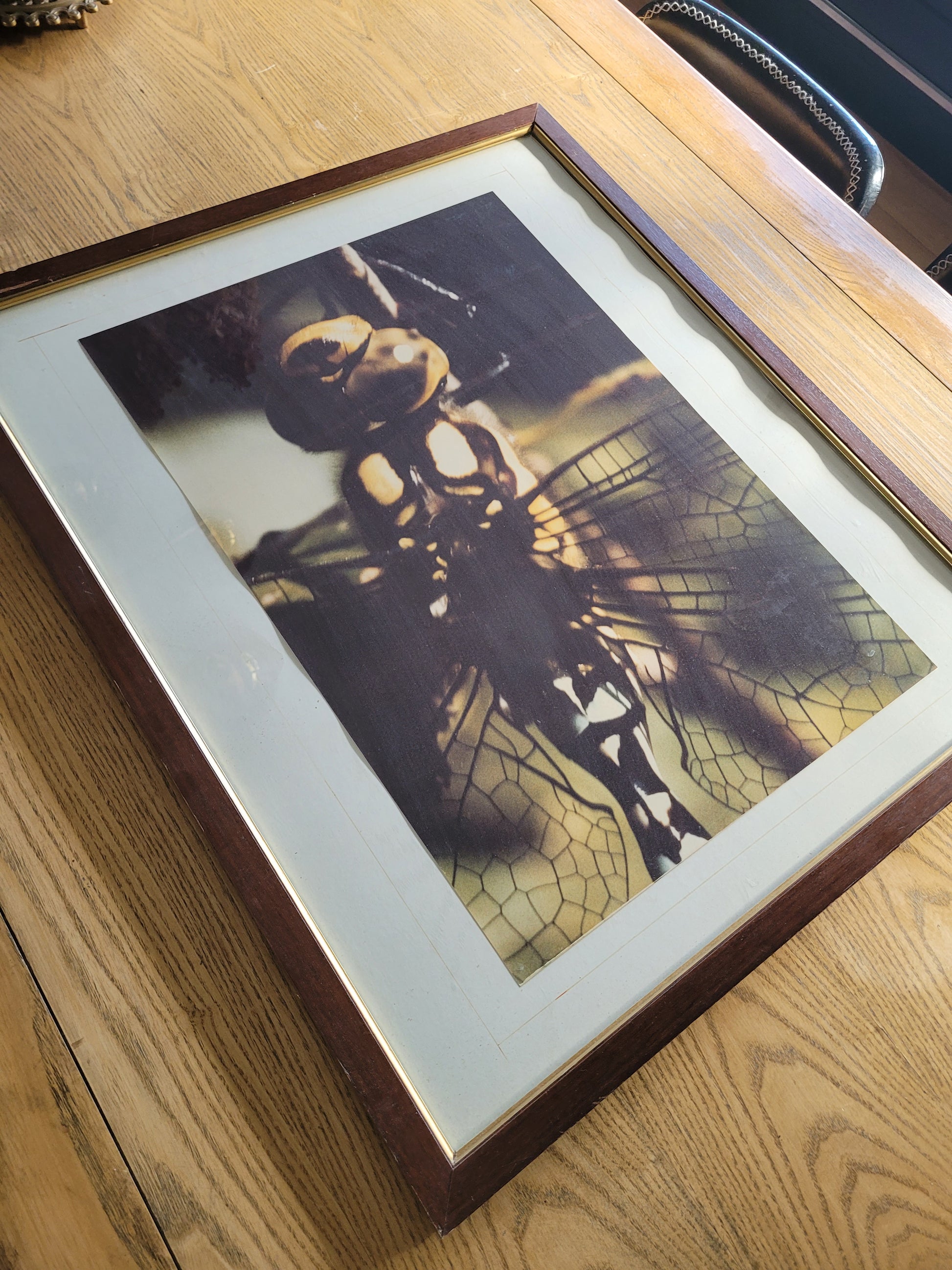 Photographie encadrée vintage représentant une Libellule en gros plan dans les tons brun, kaki et noir