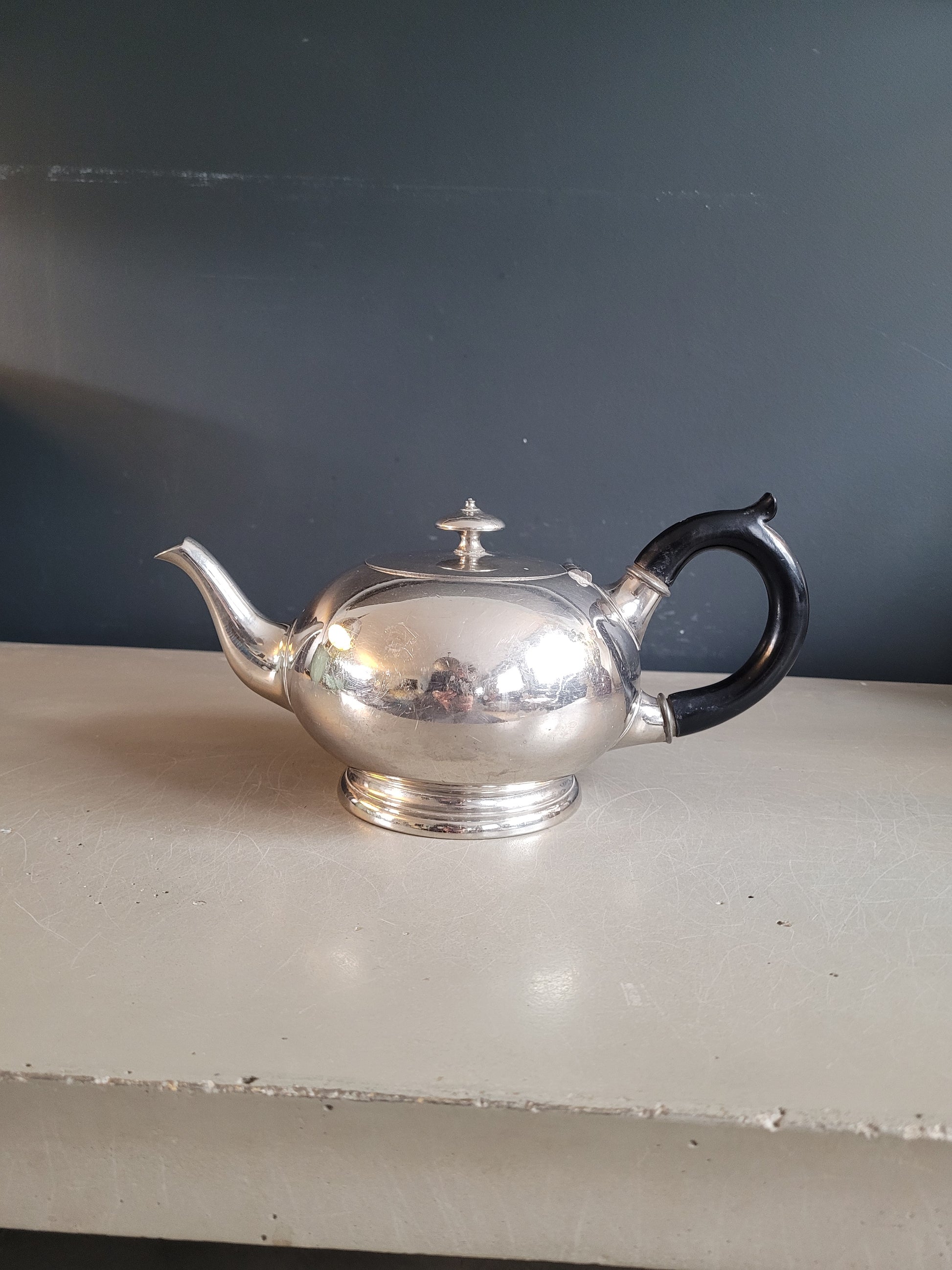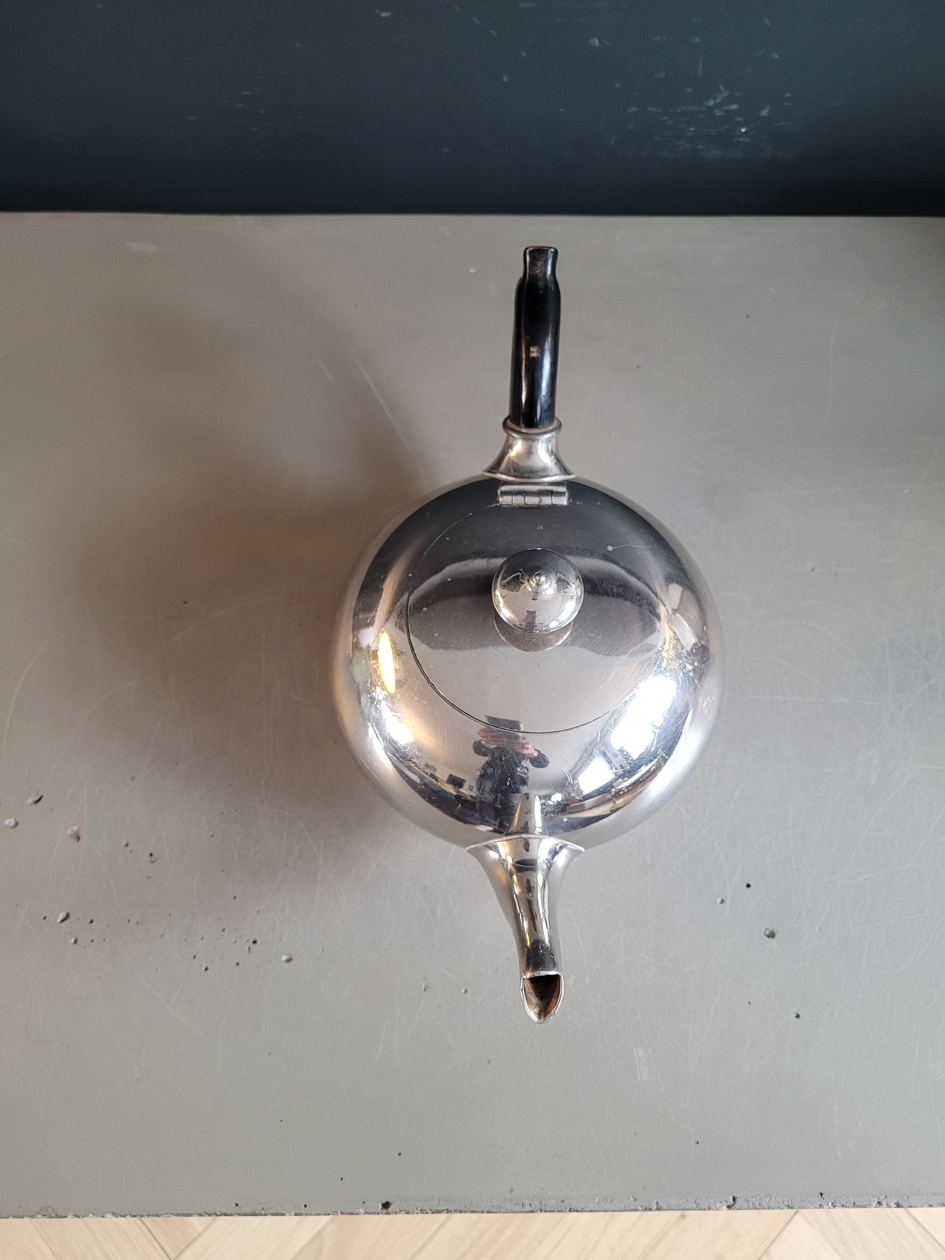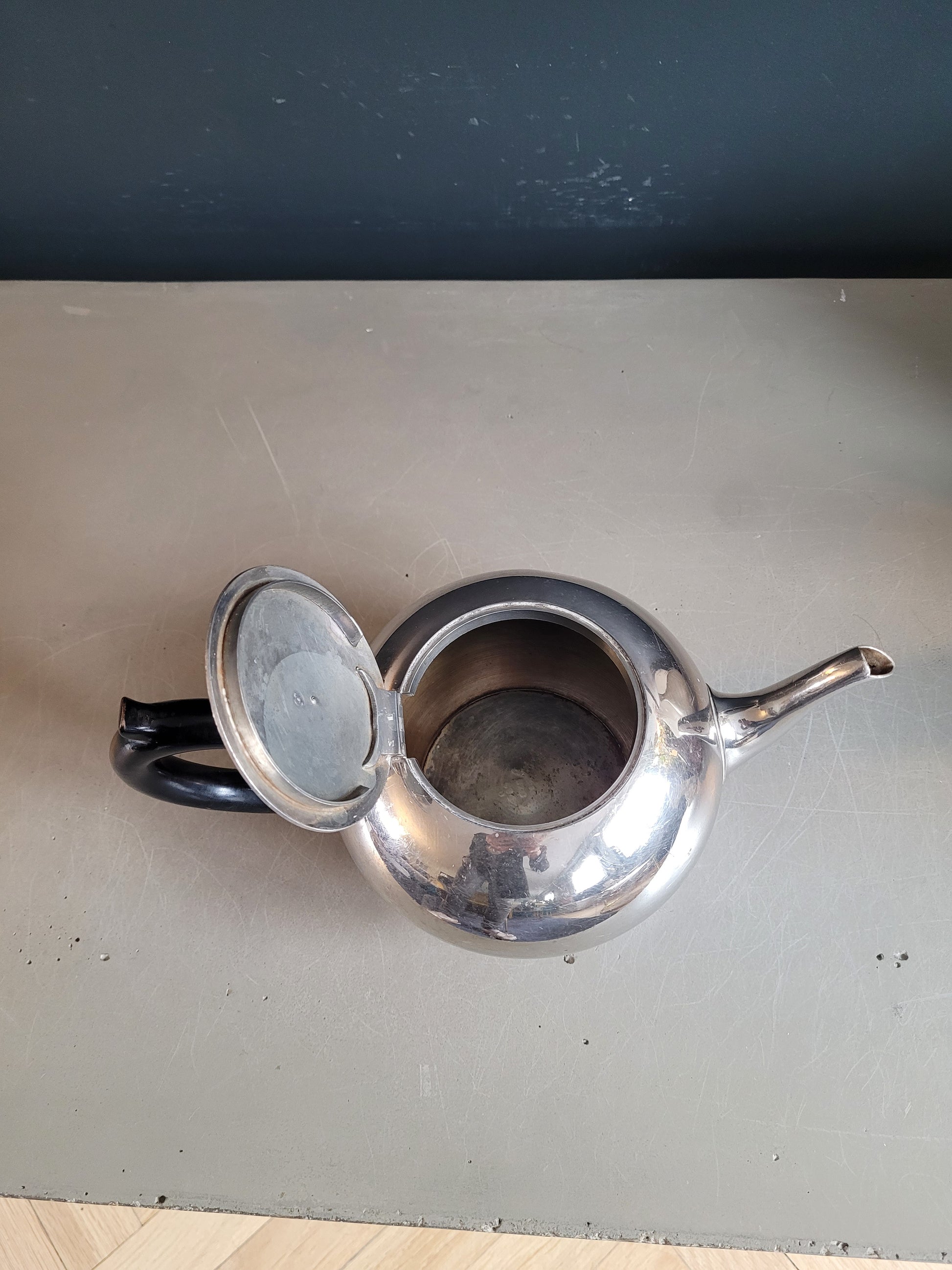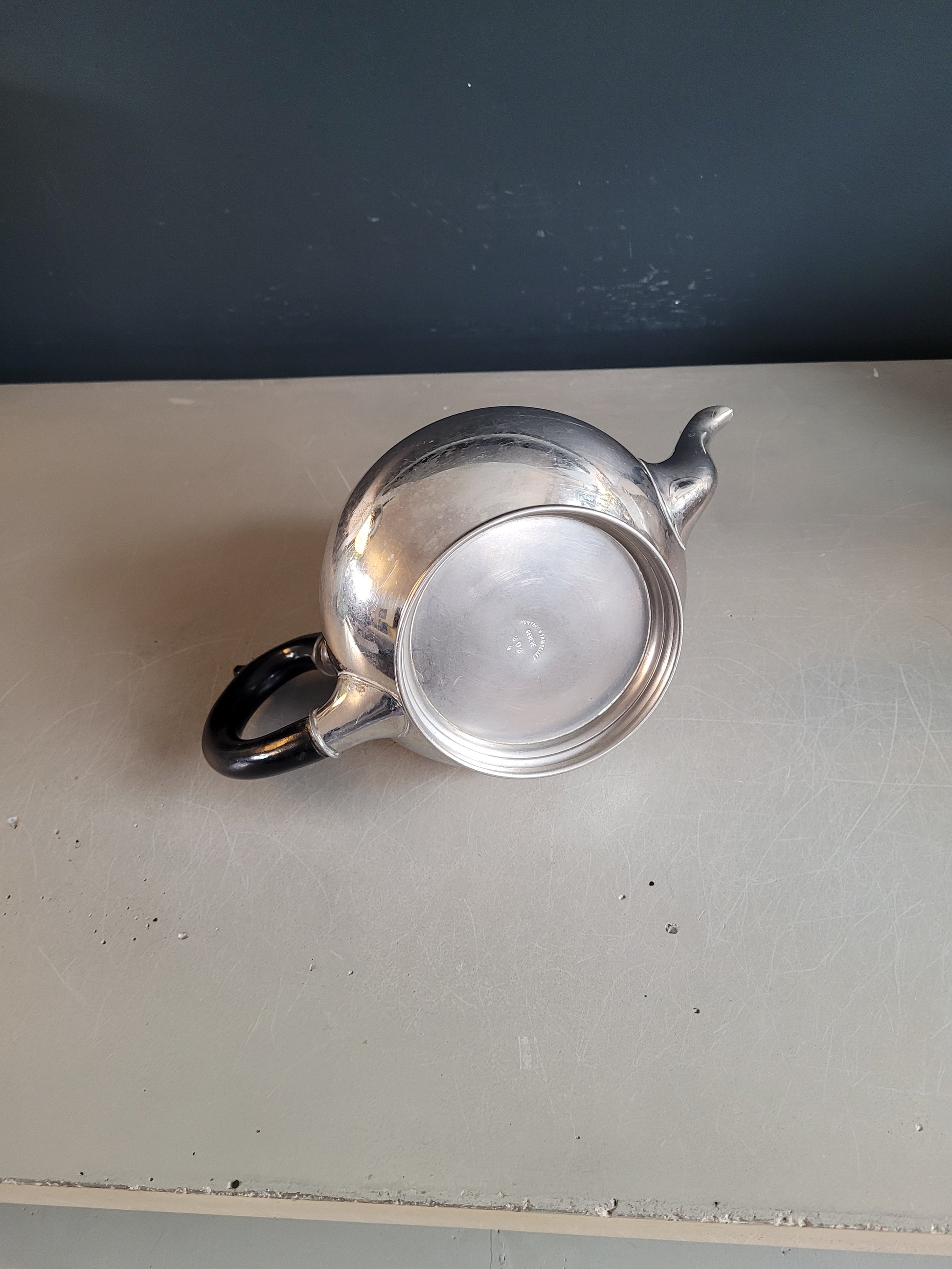 Sublime théière, de très belle qualité, en étain, et poignée en bois laqué noir, avec inscription gravée "Montant & Francellet - Genève- 202 - 4".