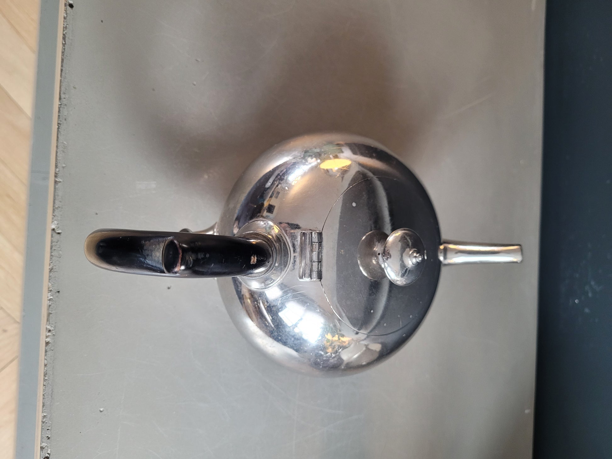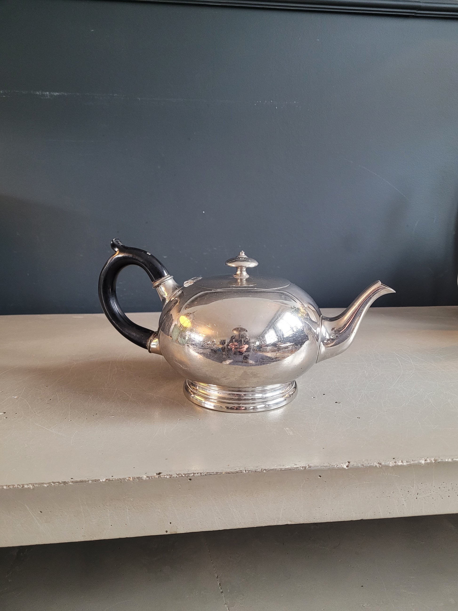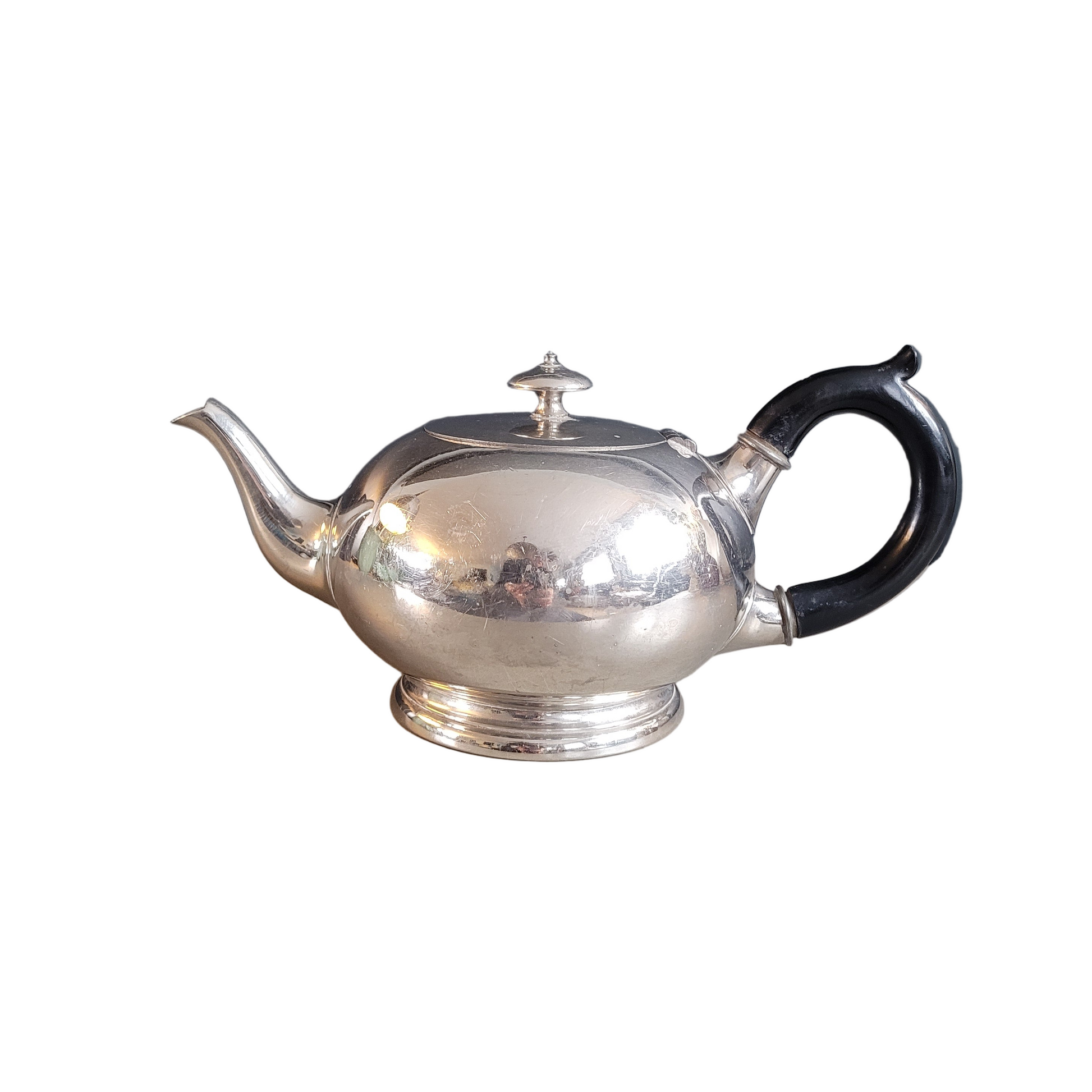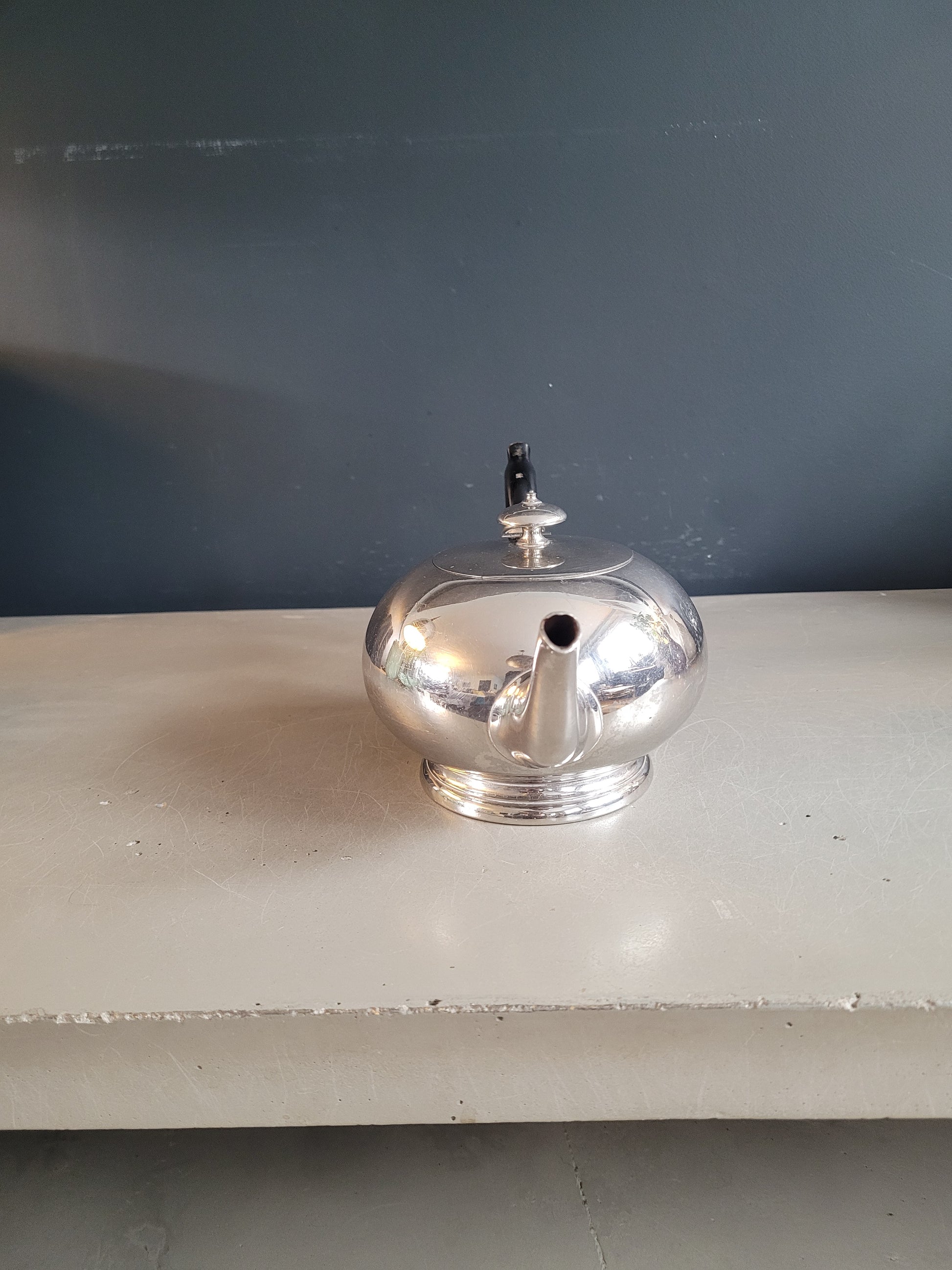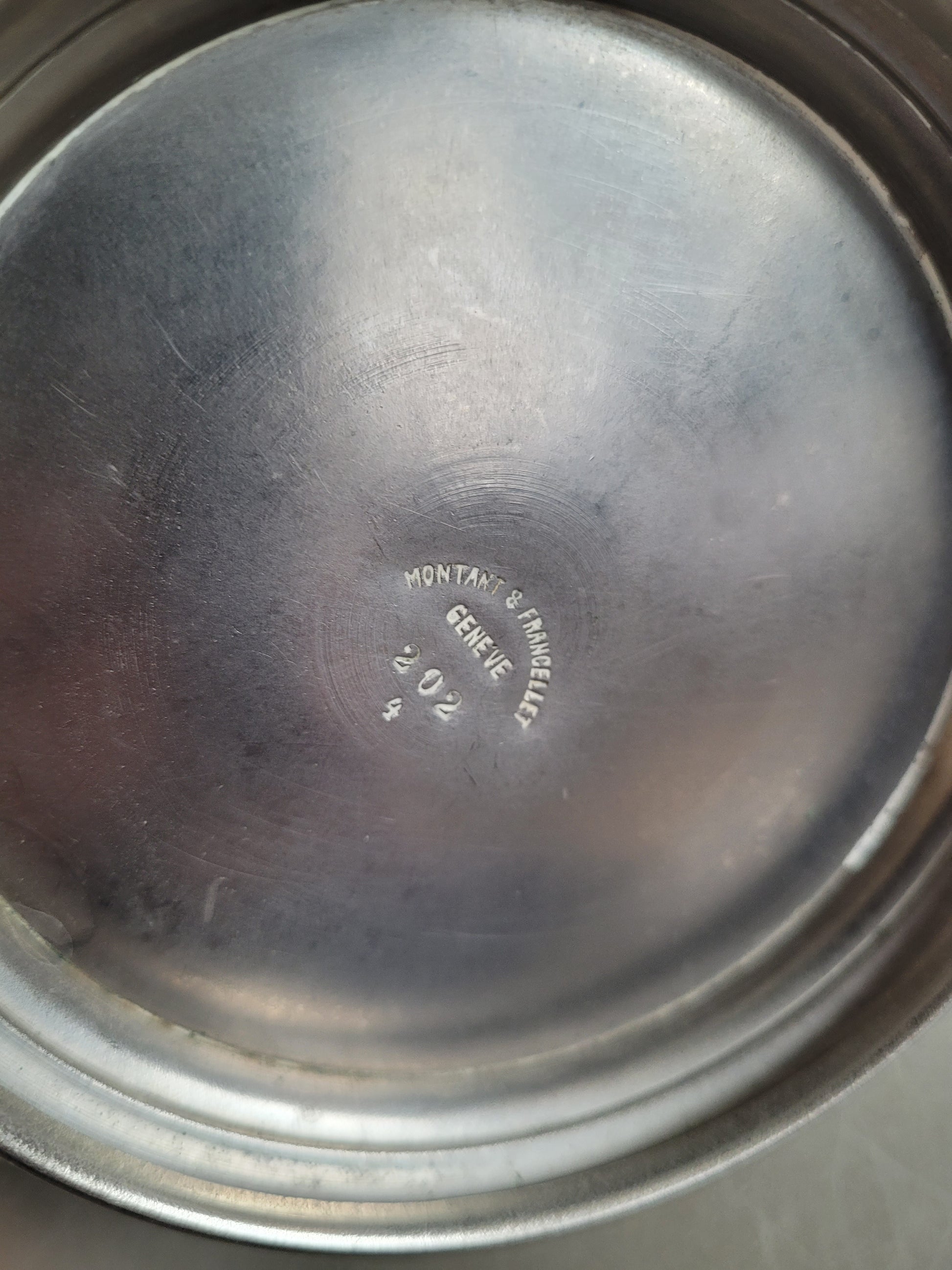 Sublime théière, de très belle qualité, en étain, et poignée en bois laqué noir, avec inscription gravée "Montant & Francellet - Genève- 202 - 4".