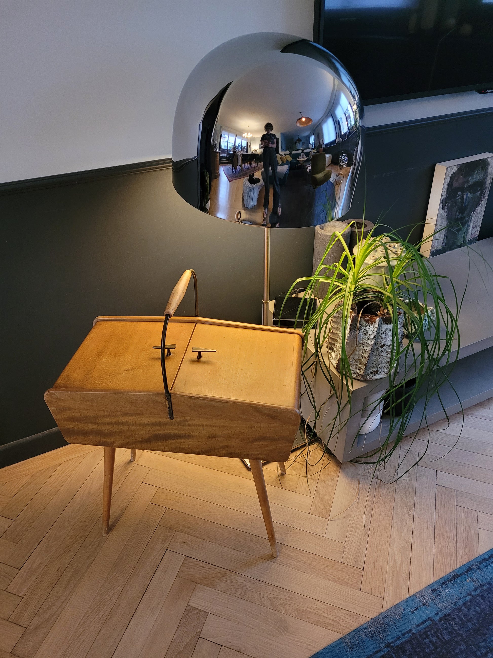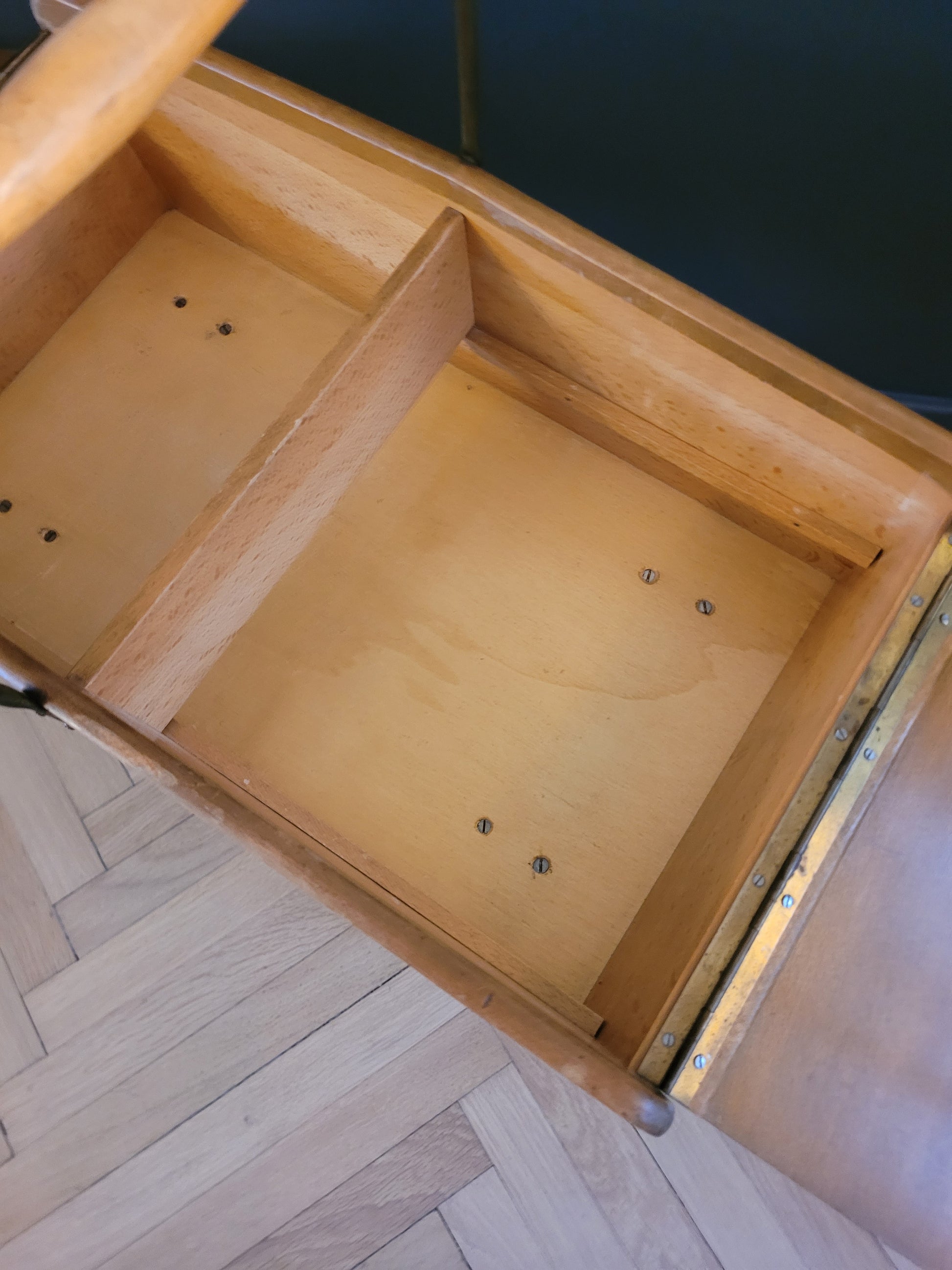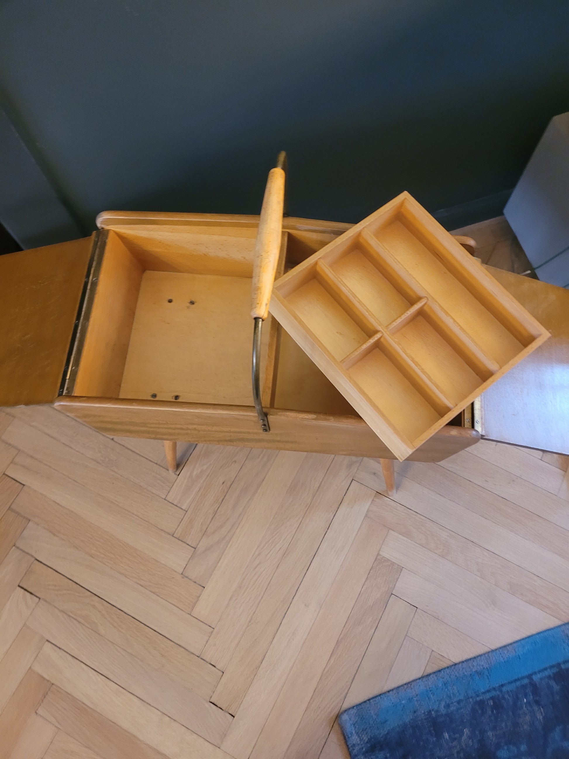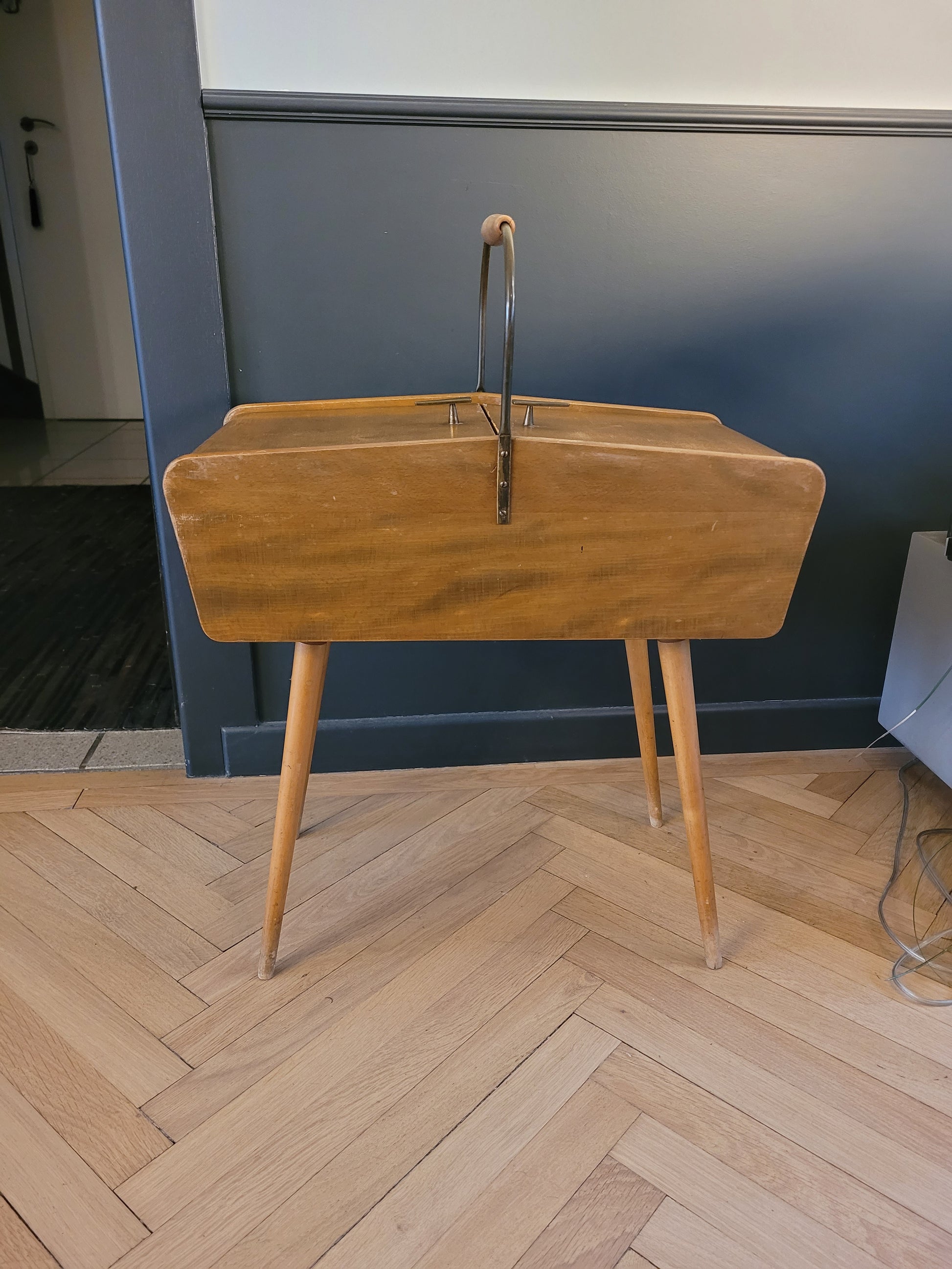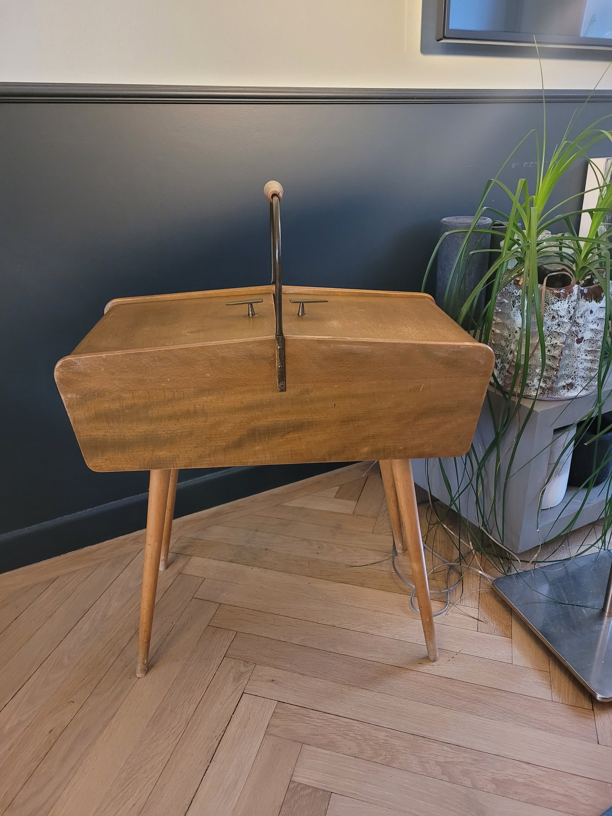 Superbe travailleuse scandinave en bois à pied compas (boîte à couture), avec 2 couvercles articulés, 1 grand casier traversant et 1 plus petit, amovible et cloisonné.