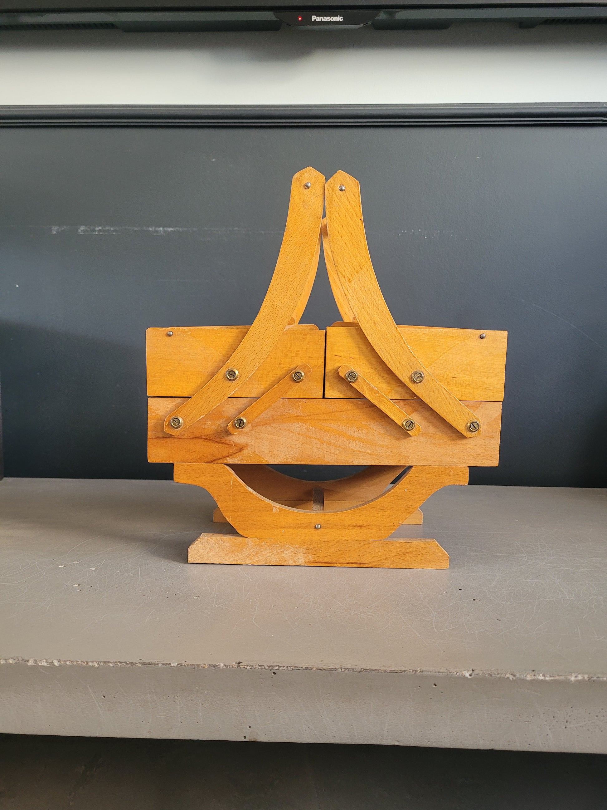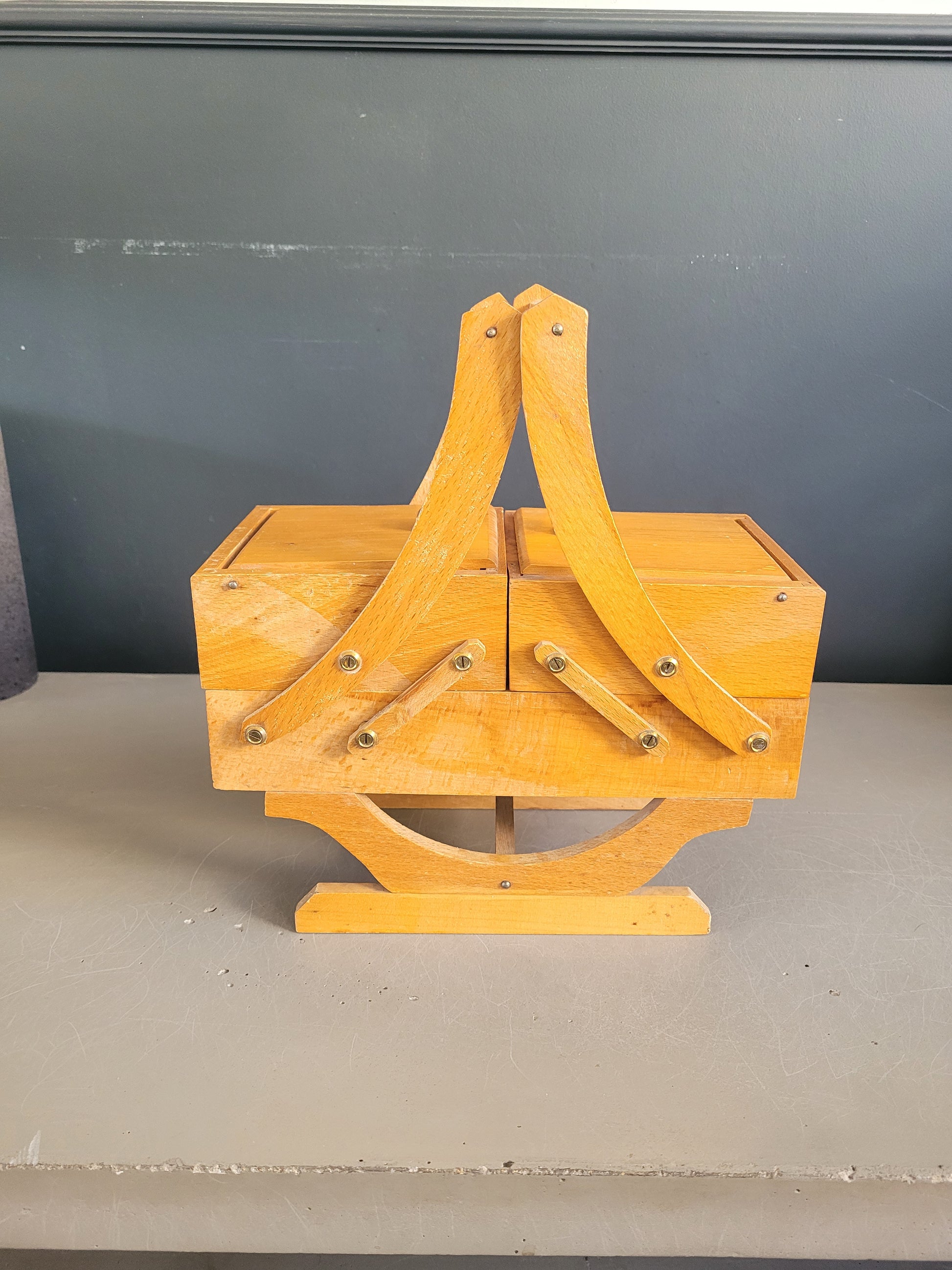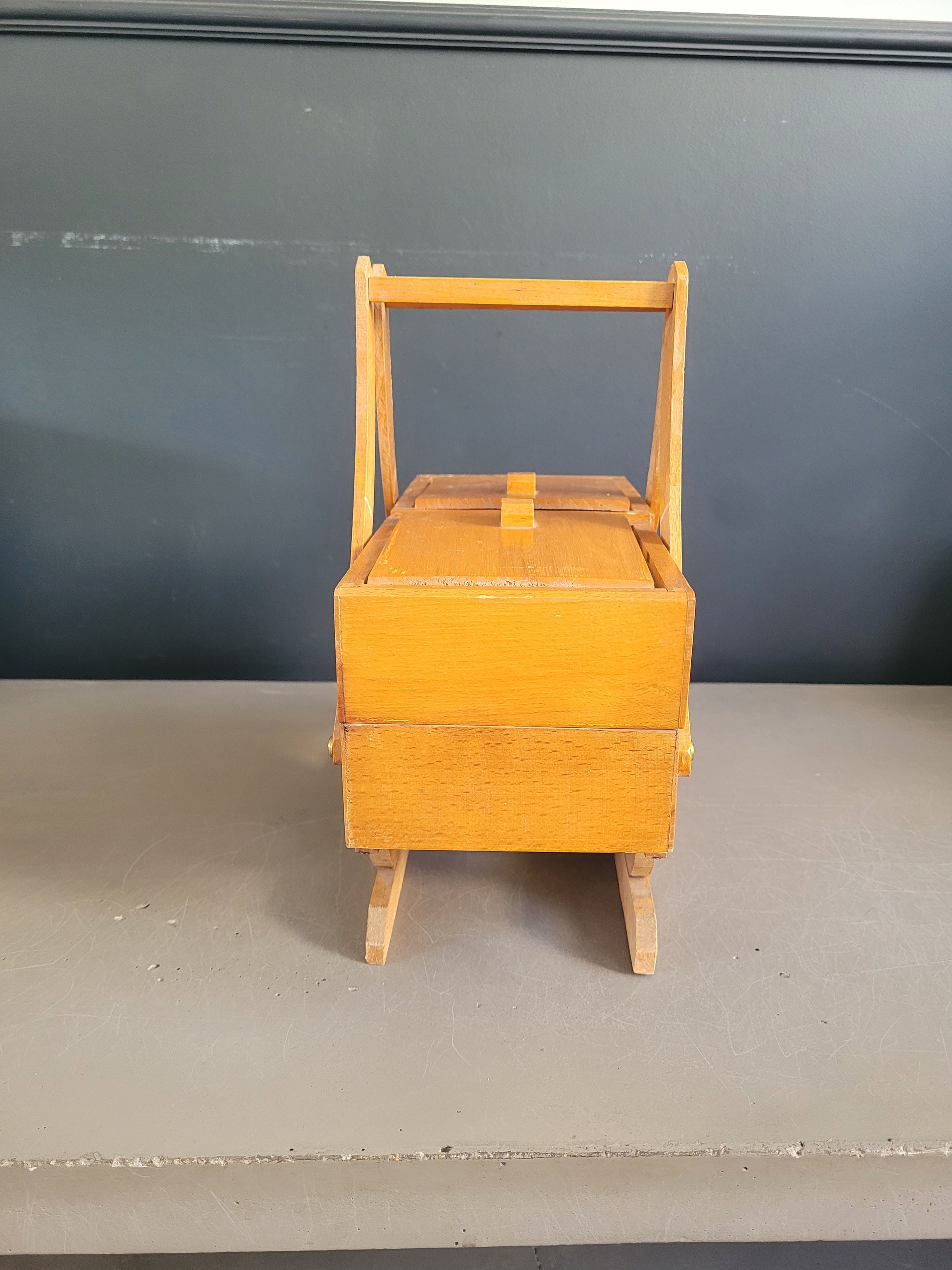 Très jolie petite travailleuse en bois couleur naturelle. Elle comporte 3 casiers de rangement, un grand, central immobile, et 2 plus petits à couvercle, mobiles.