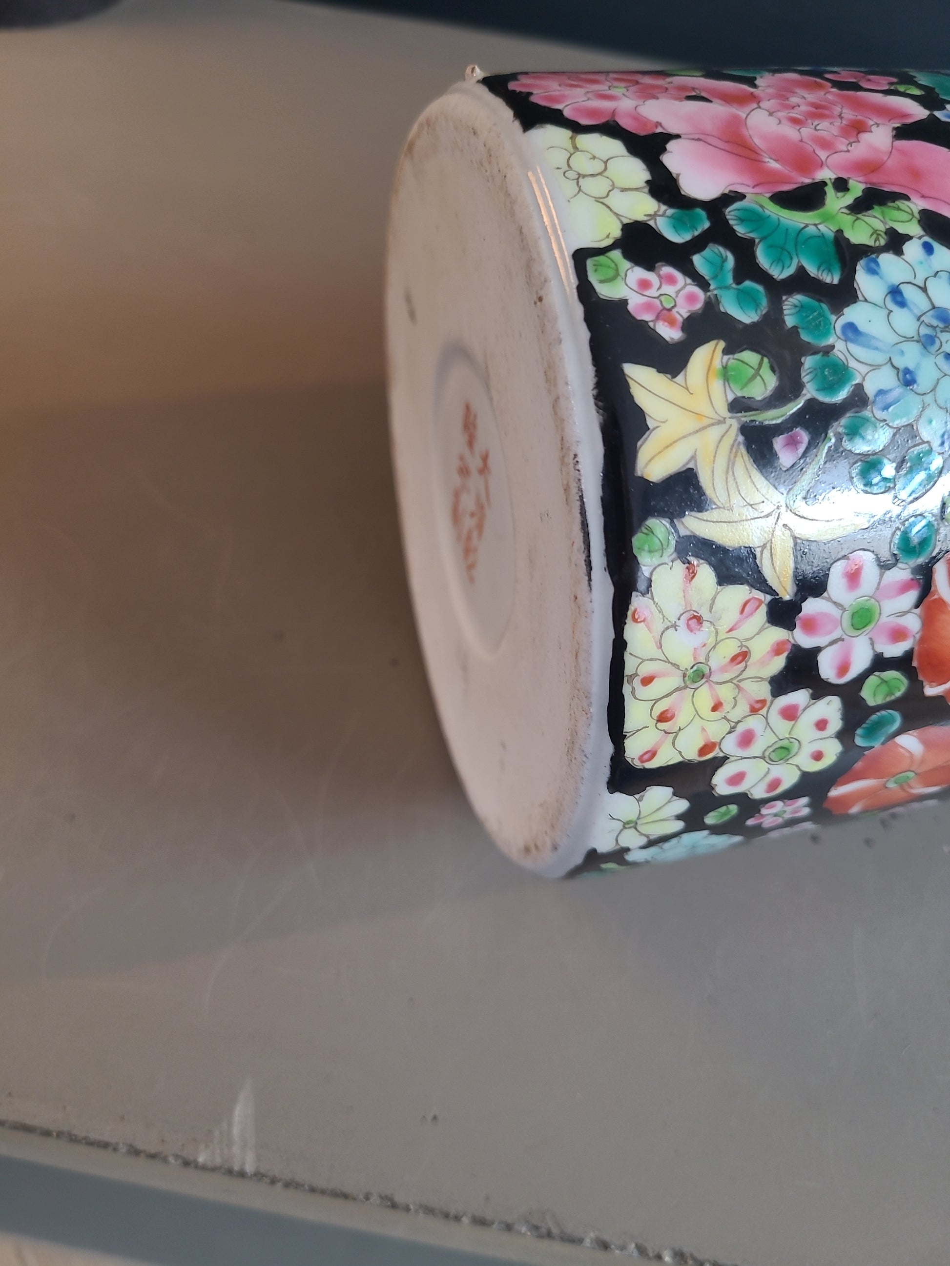 Sublime vase rouleau porte pinceaux chinois des années 1980, de style mille fleurs famille rose à fond noir recouvert d’un foisonnement de fleurs polychromes, pivoines, chrysanthèmes, lotus, prunus, ....