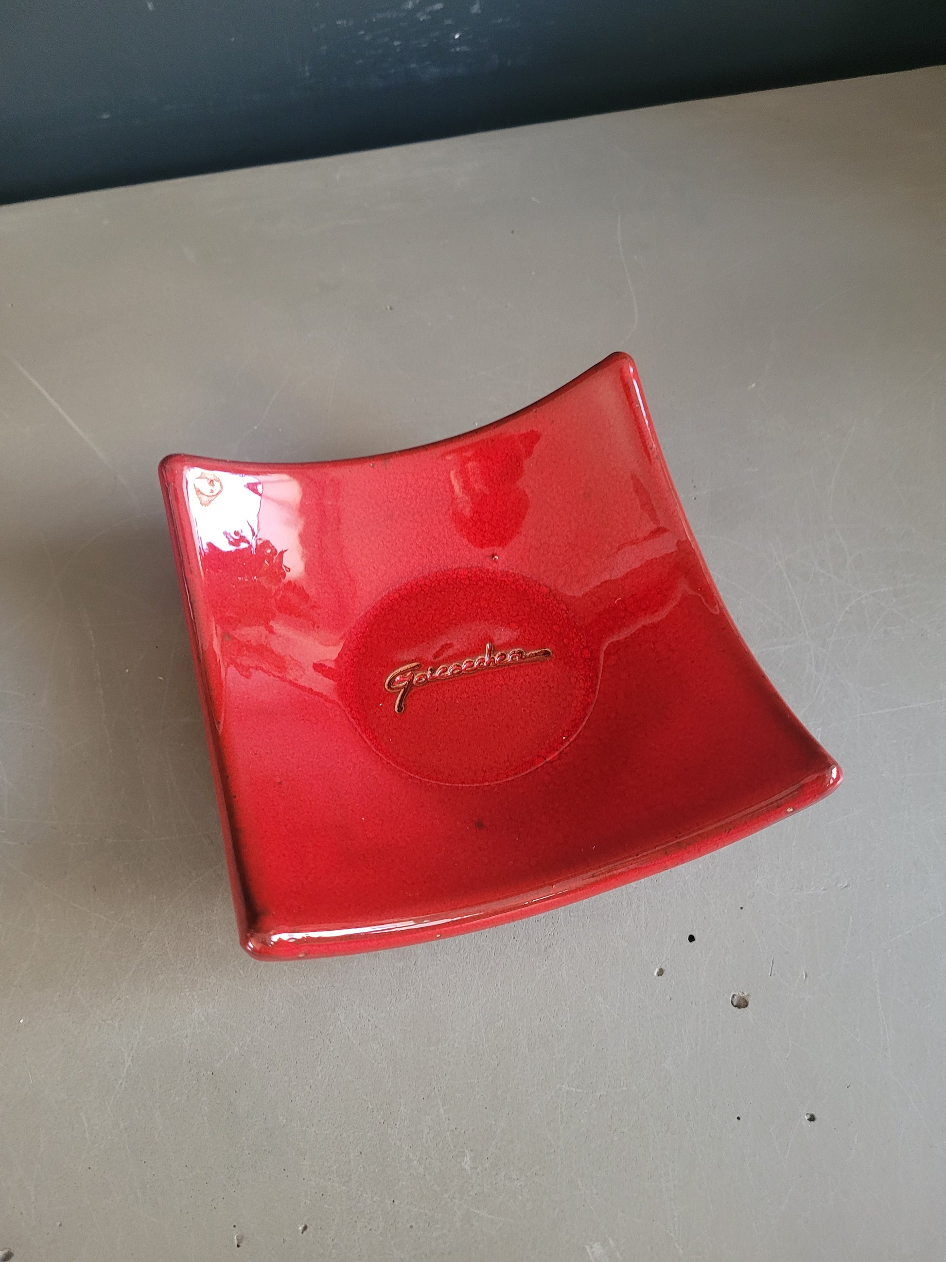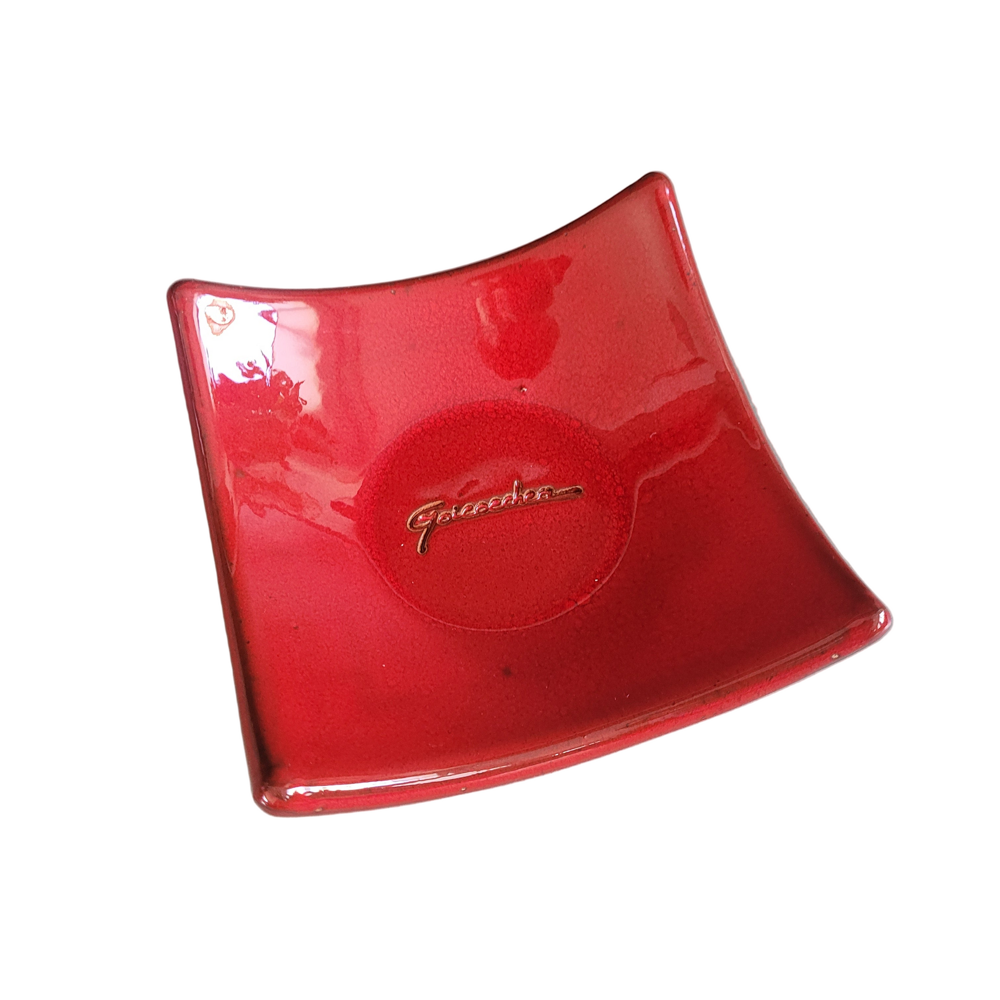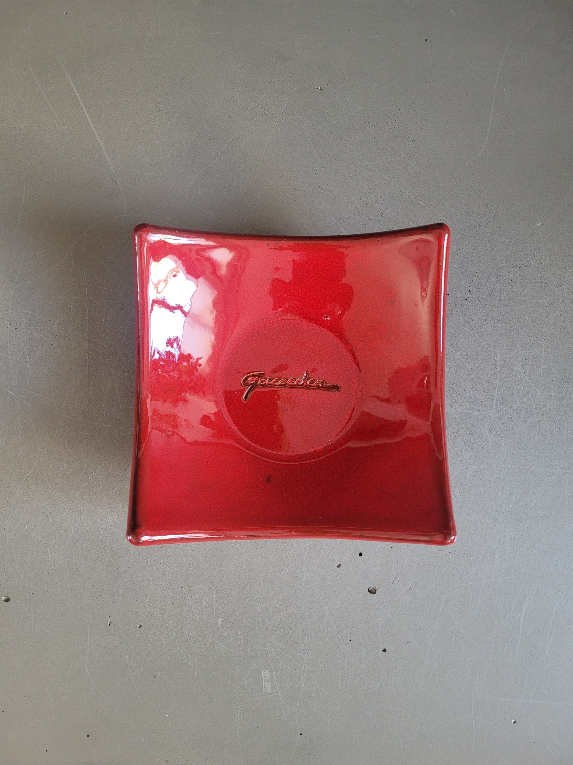 Modèle carré aux bords légèrement relevés, émaillé d’un rouge profond, avec la signature qui apparaît gravée au centre.