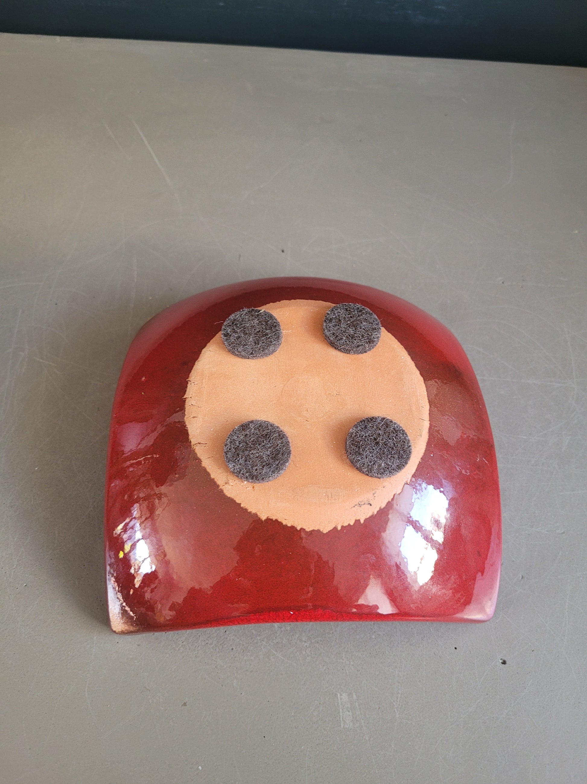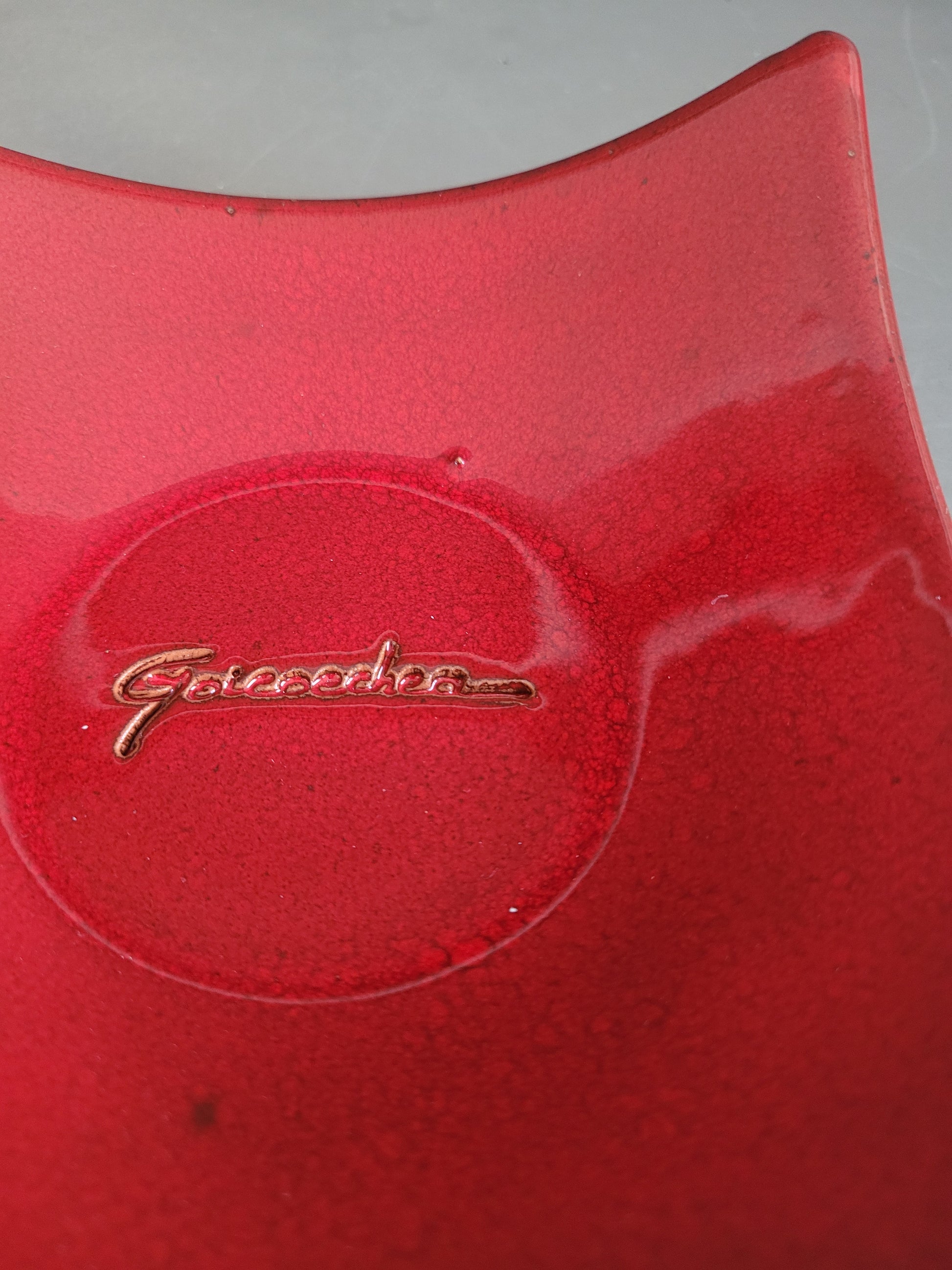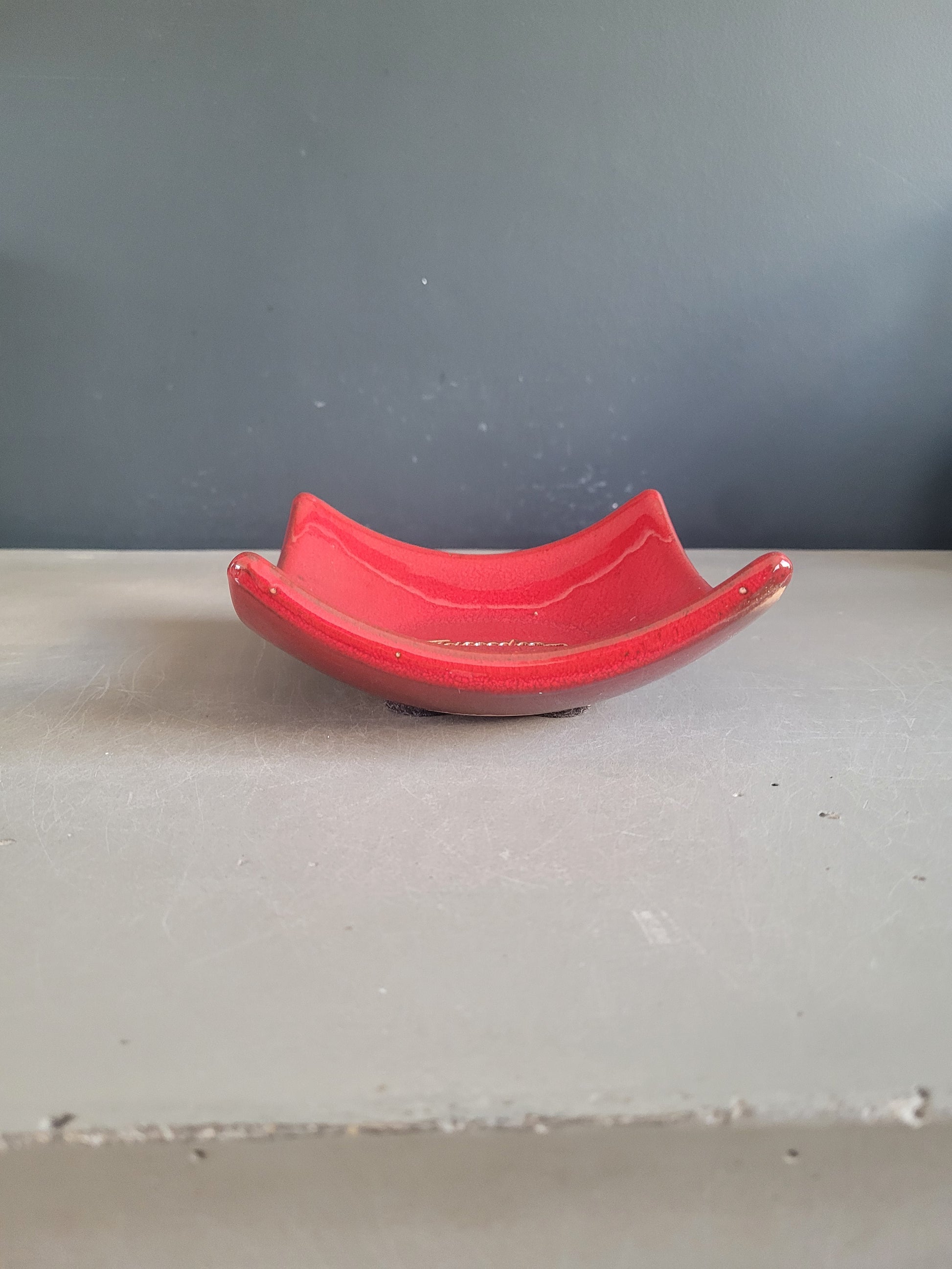 Modèle carré aux bords légèrement relevés, émaillé d’un rouge profond, avec la signature qui apparaît gravée au centre.